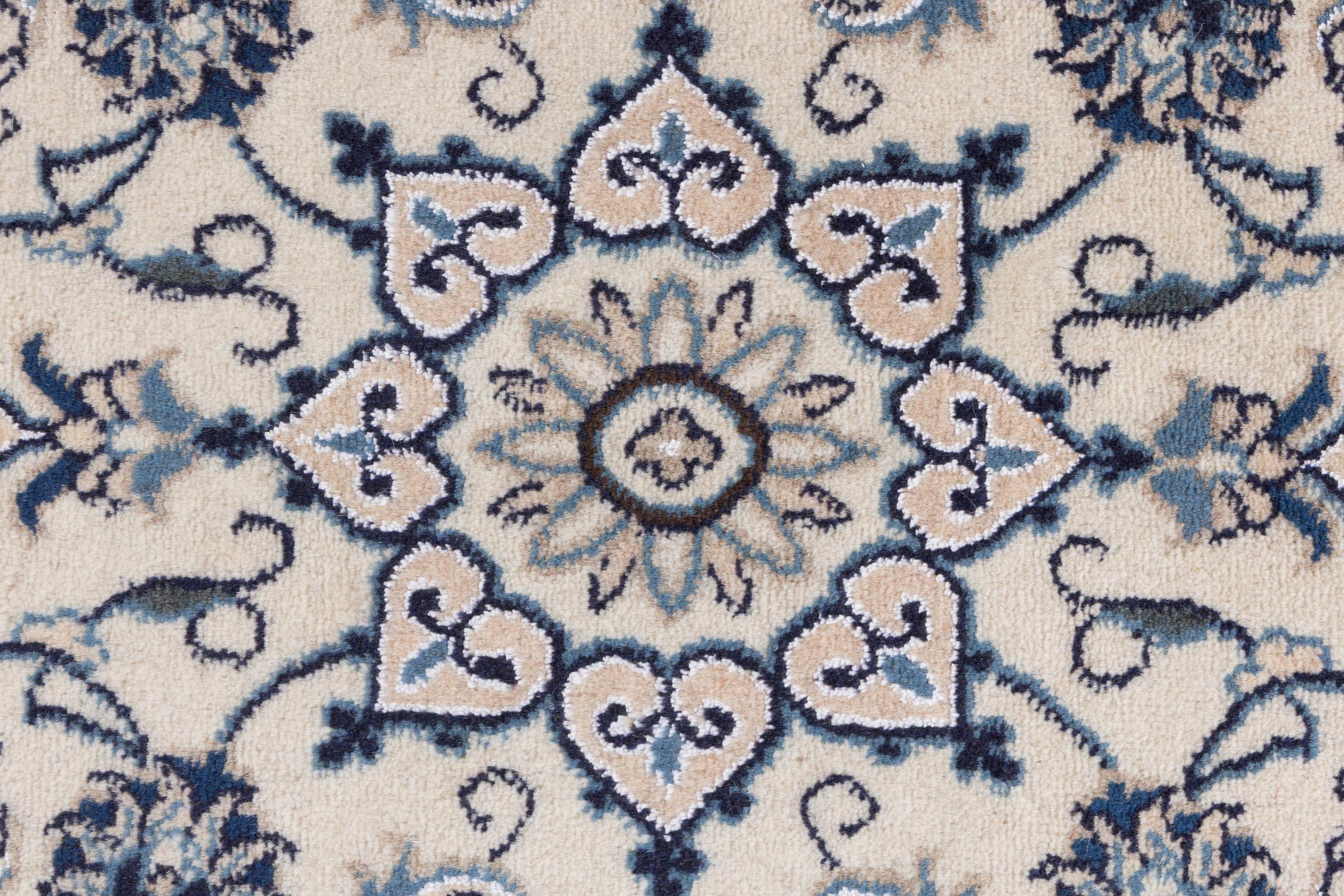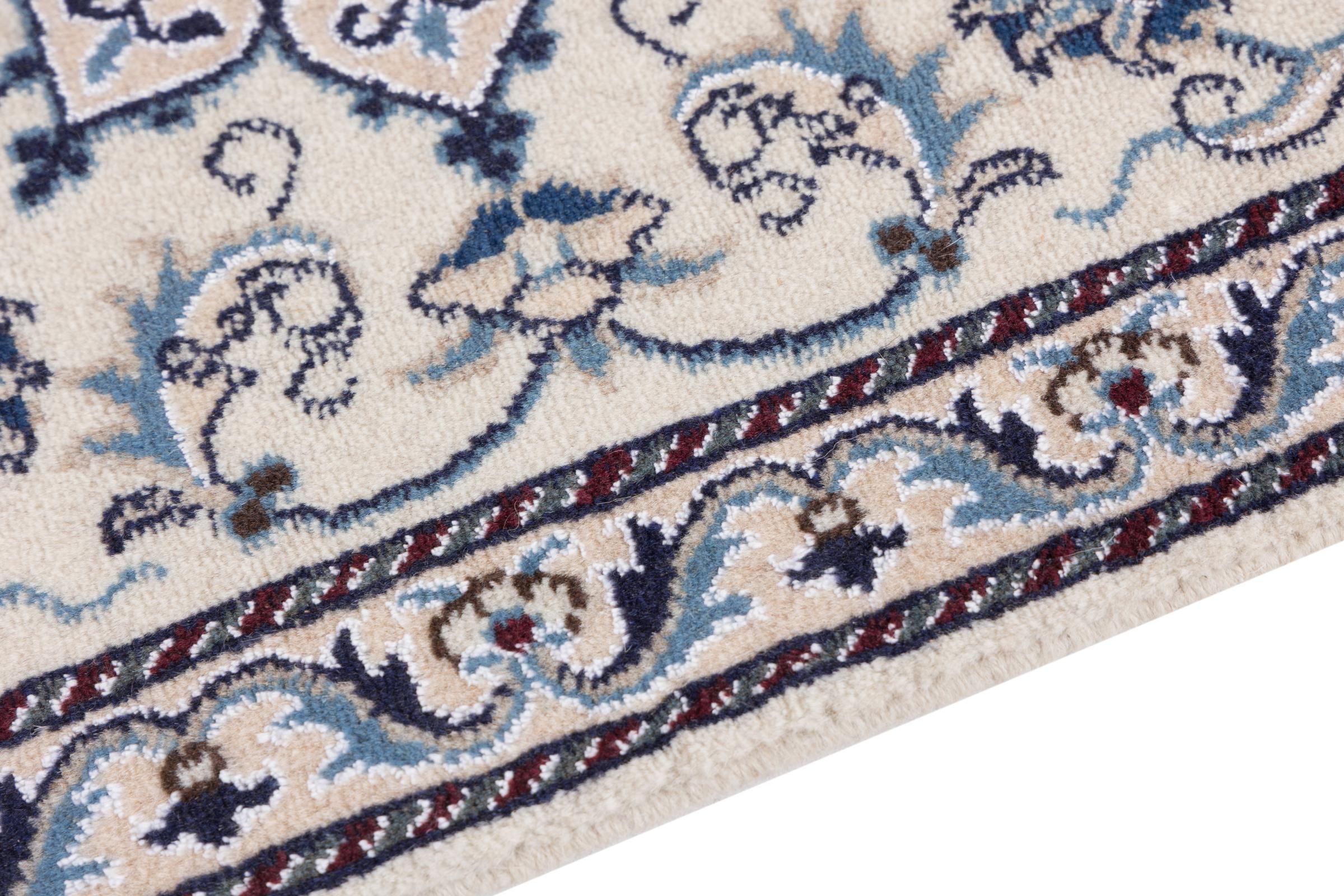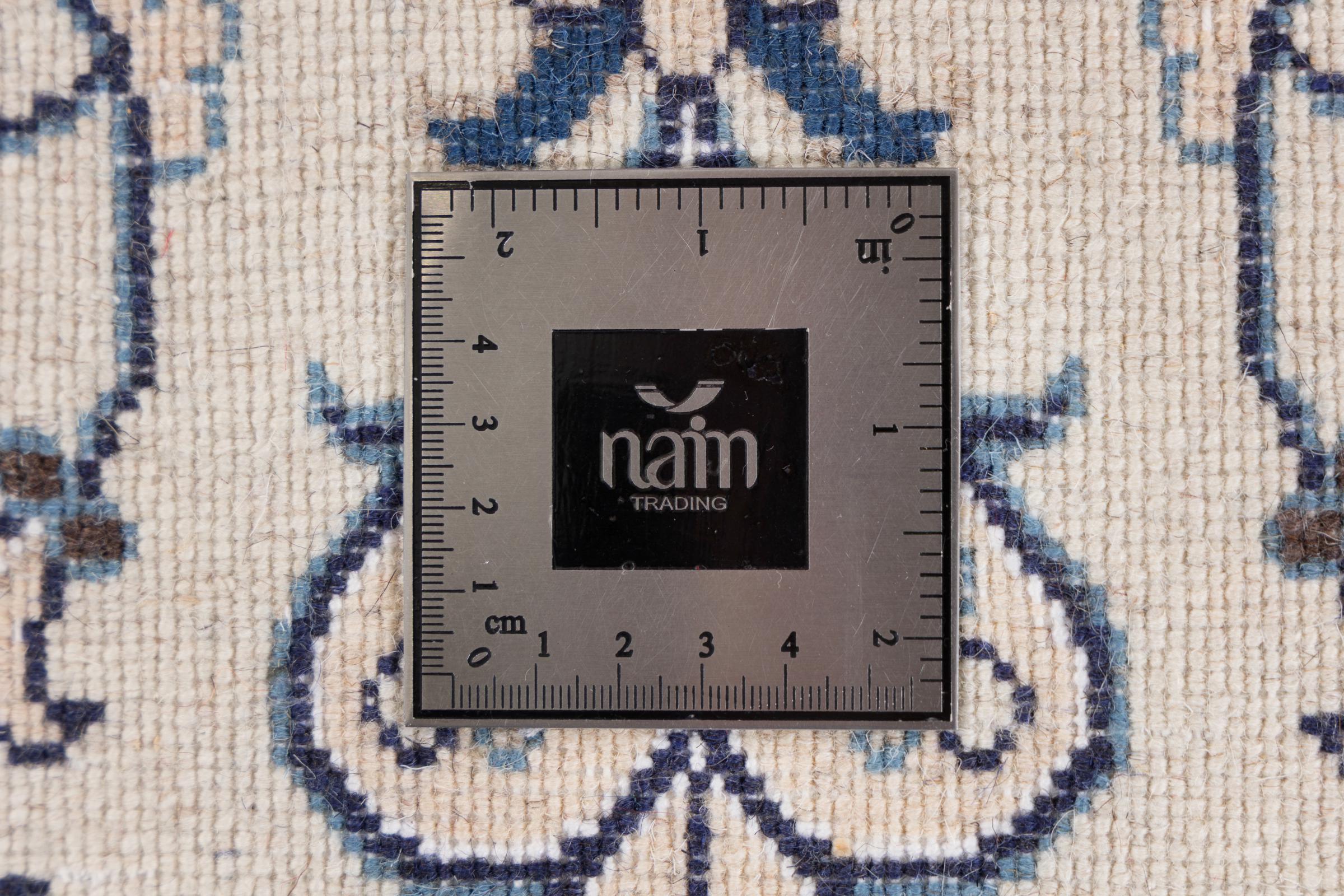 This Nain rug is classified as 12La. Its typical Nain colour scheme gives it an elegant and sophisticated look. This Persian rug was hand-knotted in the city of Nain, which lies on the western edge of the Dasht-e-Kavir desert, using high-quality wool and natural silk. At 12La, it is not as finely detailed with ornamentation as a Nain 9La or 6La.
