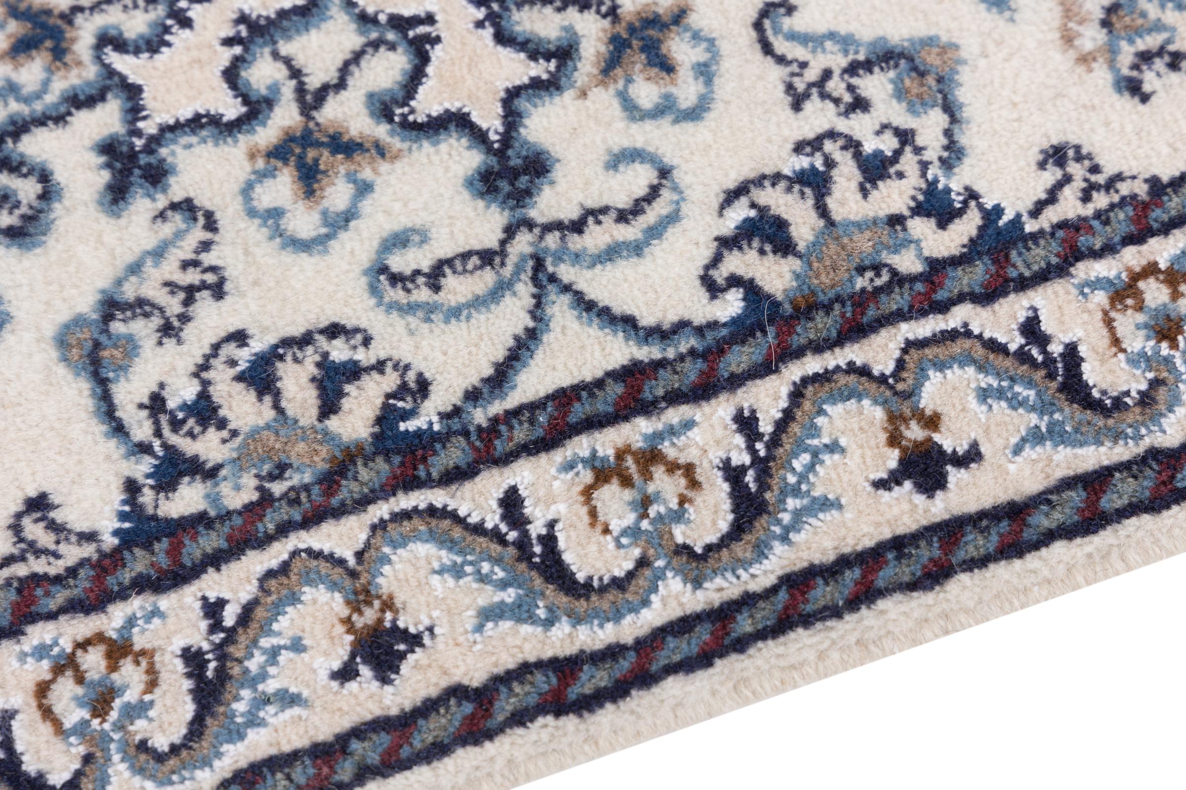 This Nain rug is classified as 12La. Its typical Nain colour scheme gives it an elegant and sophisticated look. This Persian rug was hand-knotted in the city of Nain, which lies on the western edge of the Dasht-e-Kavir desert, using high-quality wool and natural silk. At 12La, it is not as finely detailed with ornamentation as a Nain 9La or 6La.