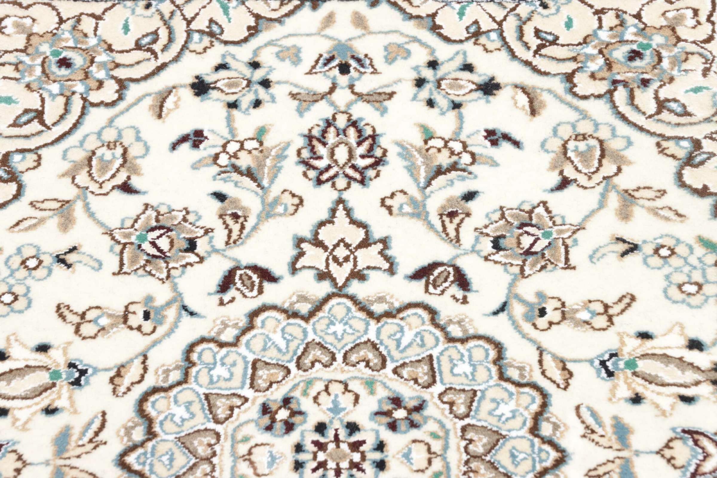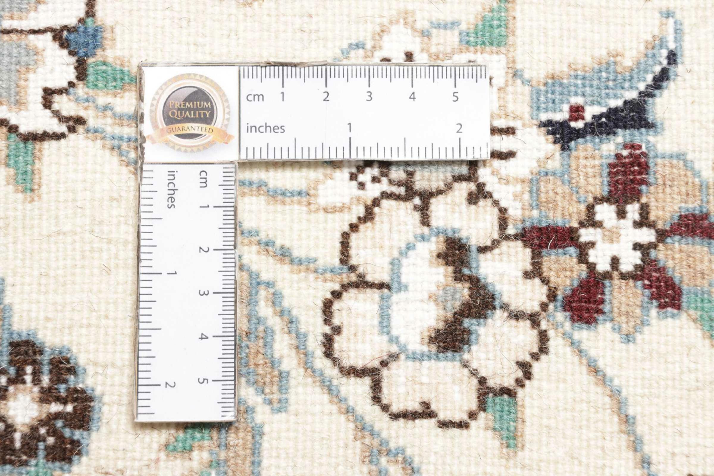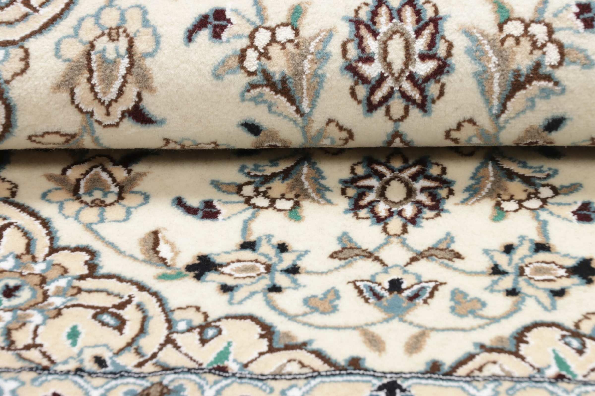 This Nain rug is classified as 9La. The excellent quality, the beautiful oriental design with its curvilinear patterns will delight every buyer. This Persian rug was hand-knotted in the city of Nain, which lies on the western edge of the Dasht-e-Kavir desert, from high-quality wool and natural silk. 9La Nain rugs are significantly finer than a 12La and already show beautiful details.
