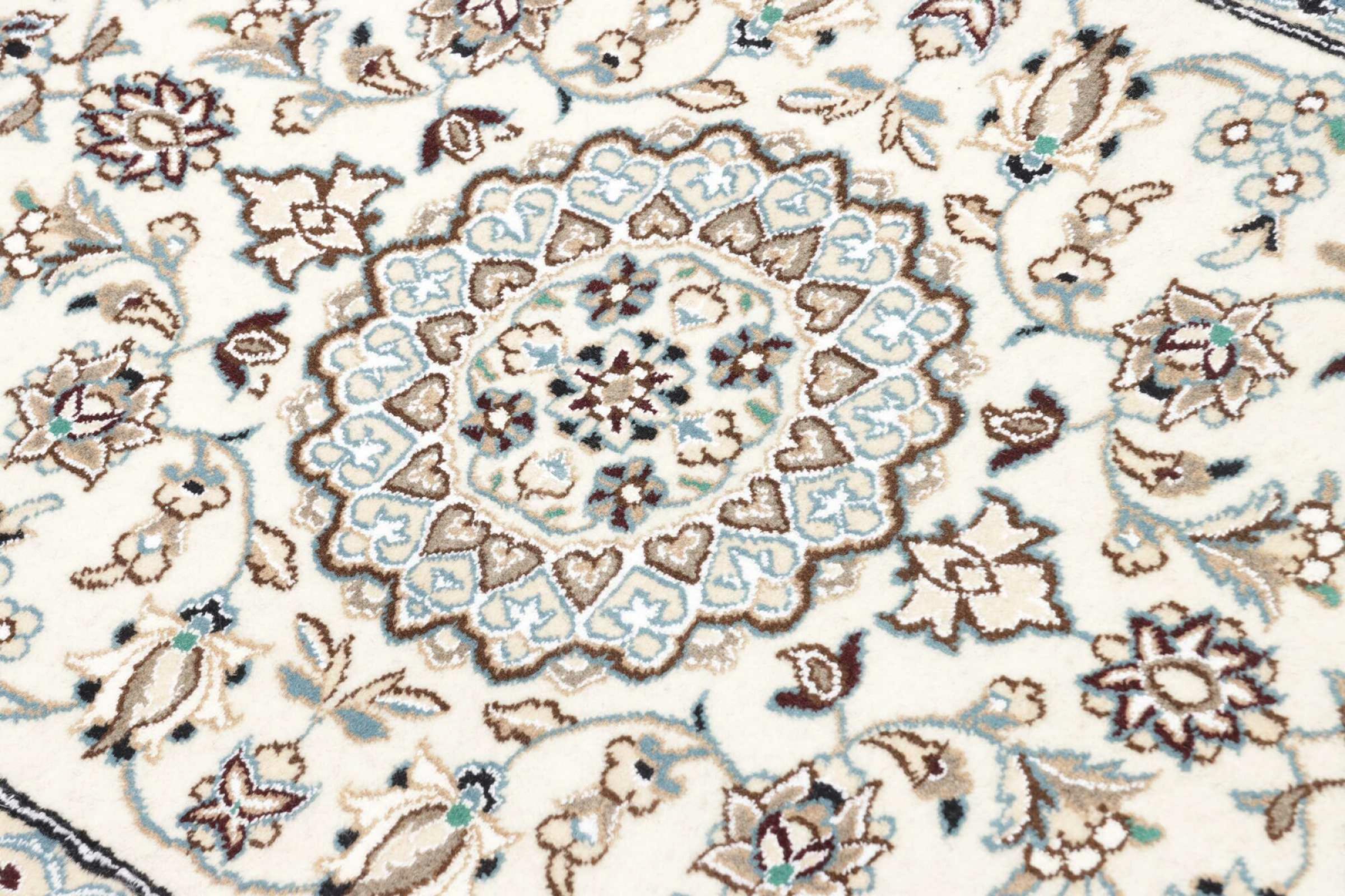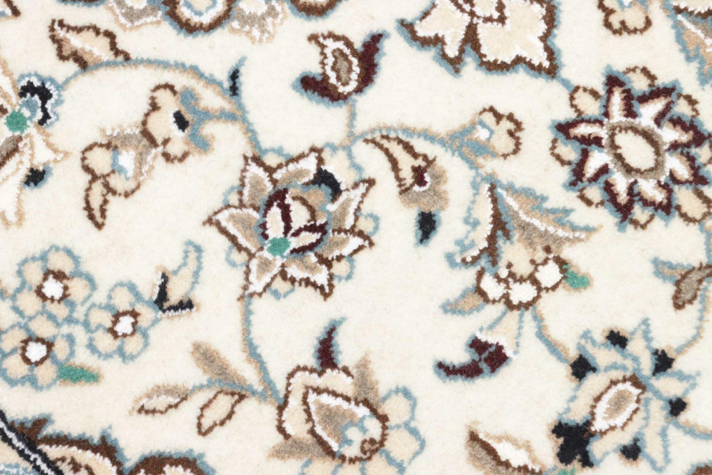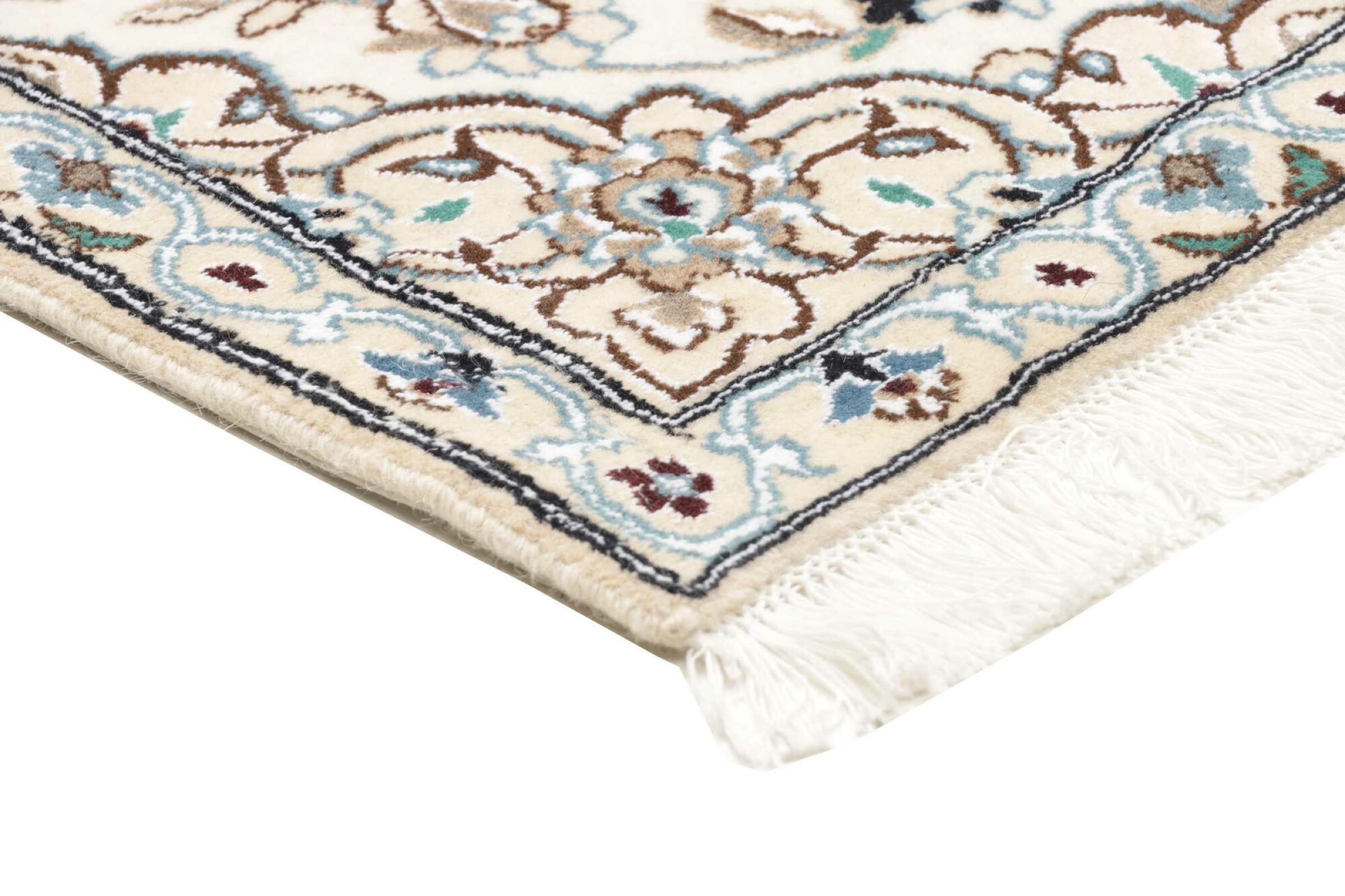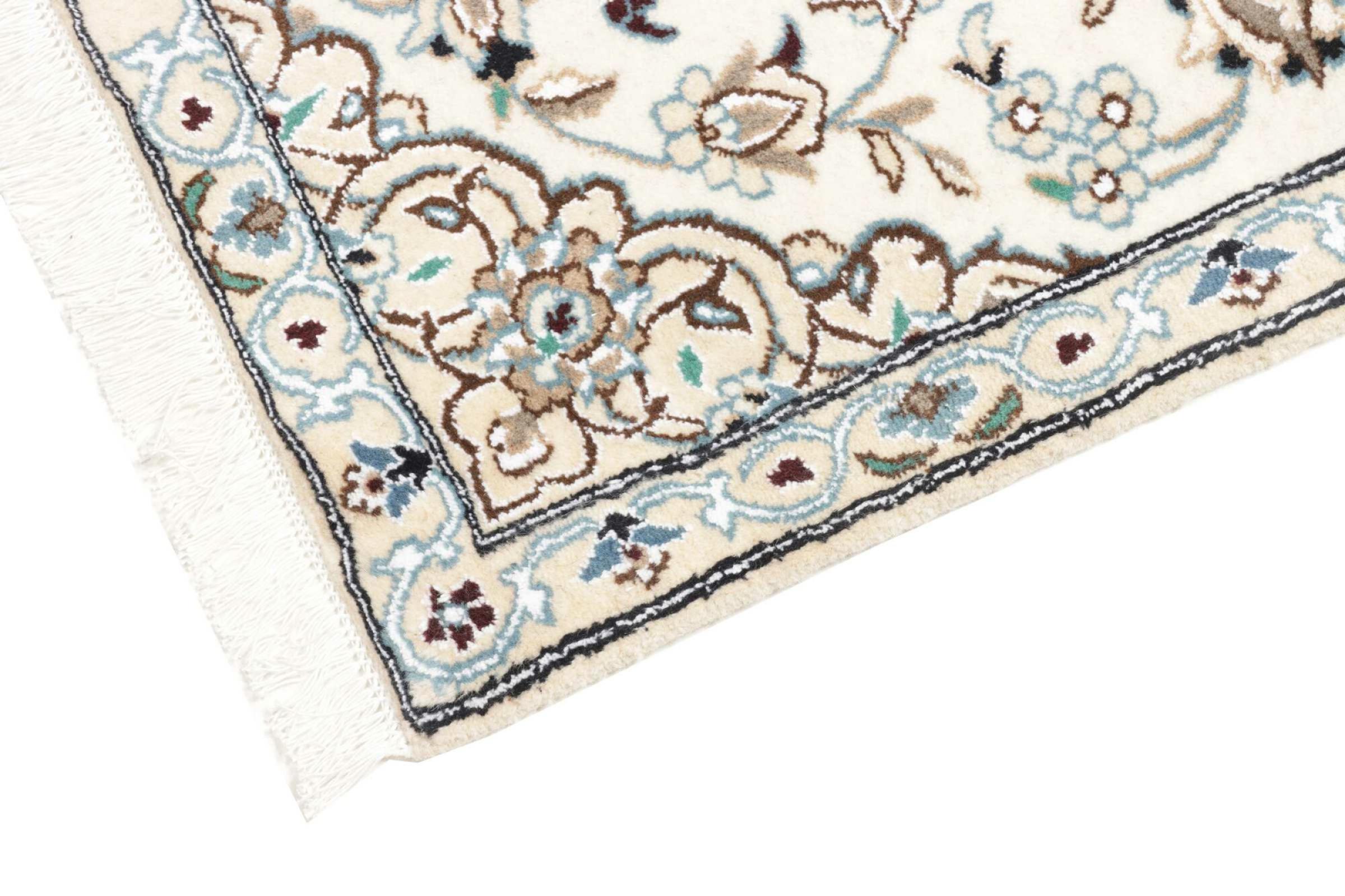 This Nain rug is classified as 9La. The excellent quality, the beautiful oriental design with its curvilinear patterns will delight every buyer. This Persian rug was hand-knotted in the city of Nain, which lies on the western edge of the Dasht-e-Kavir desert, from high-quality wool and natural silk. 9La Nain rugs are significantly finer than a 12La and already show beautiful details.