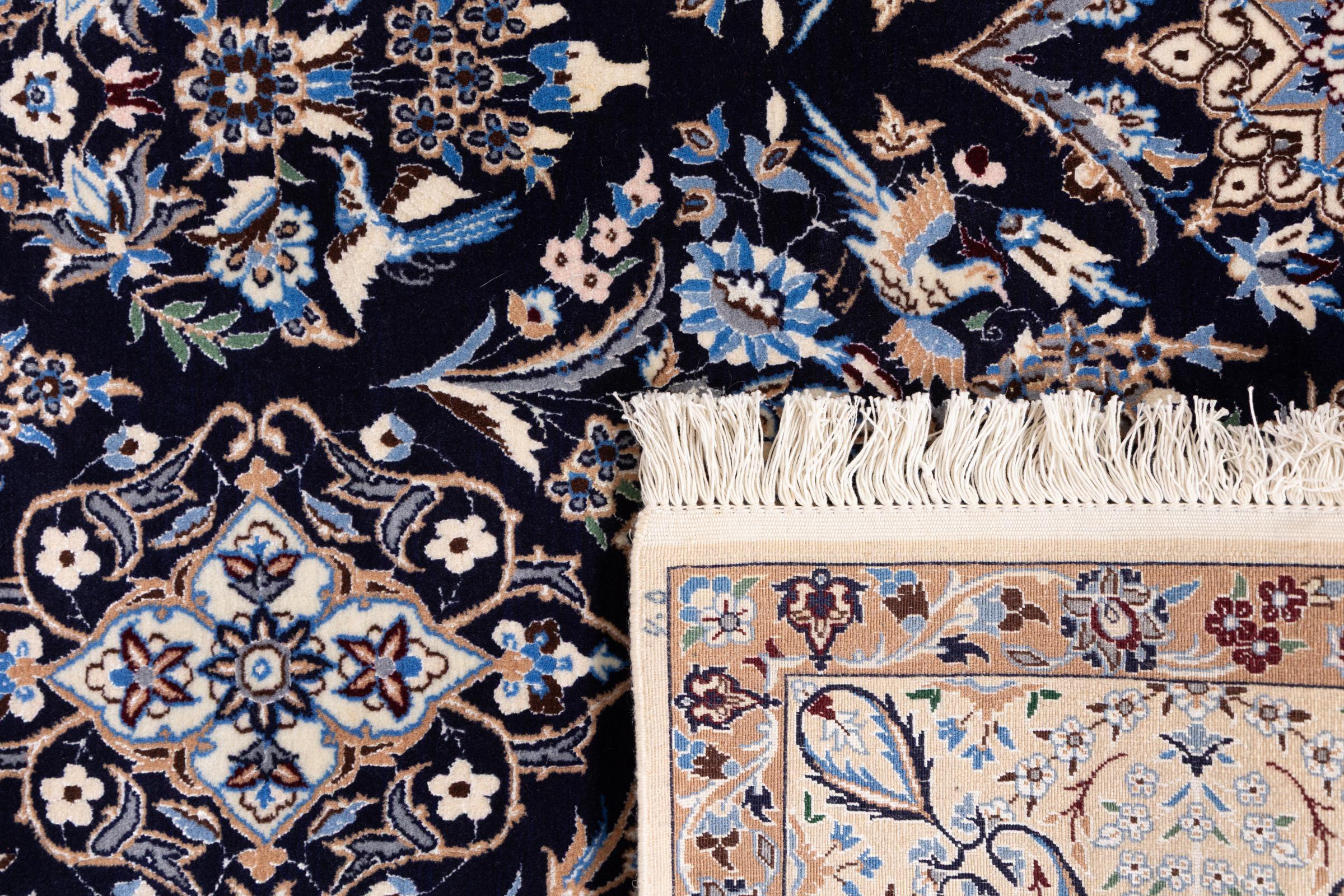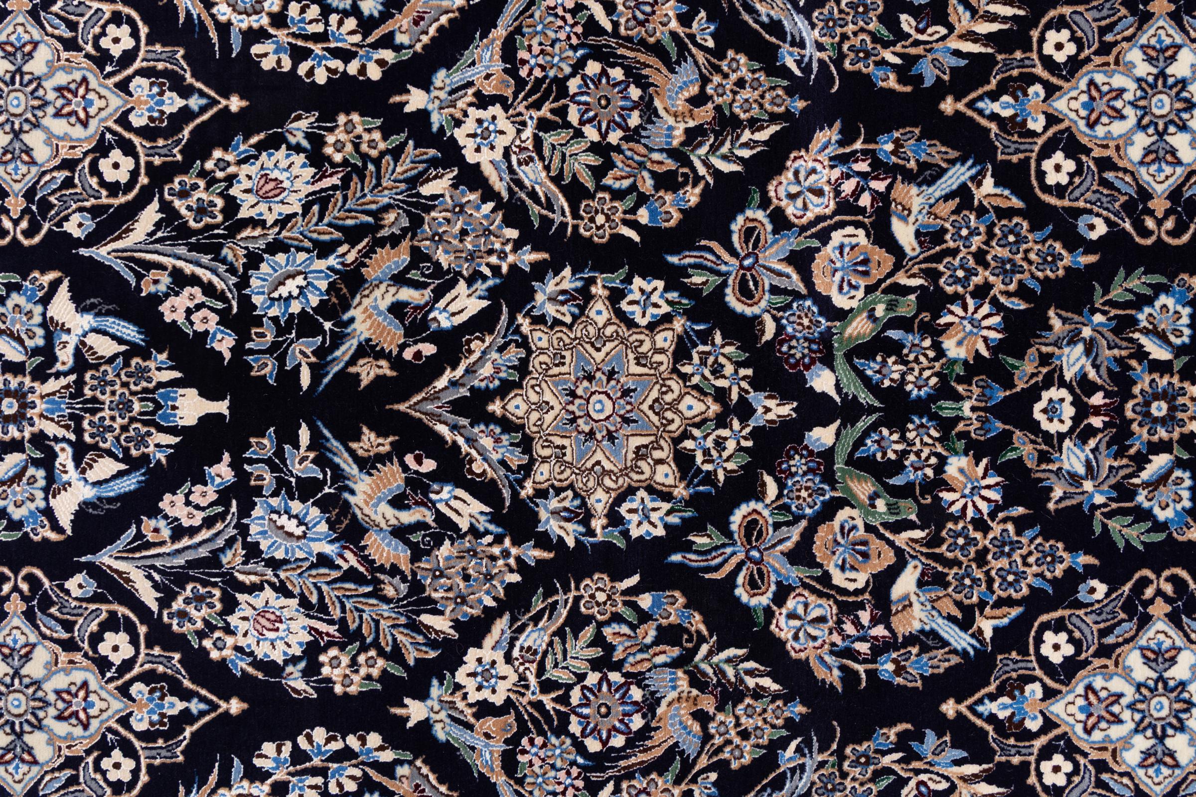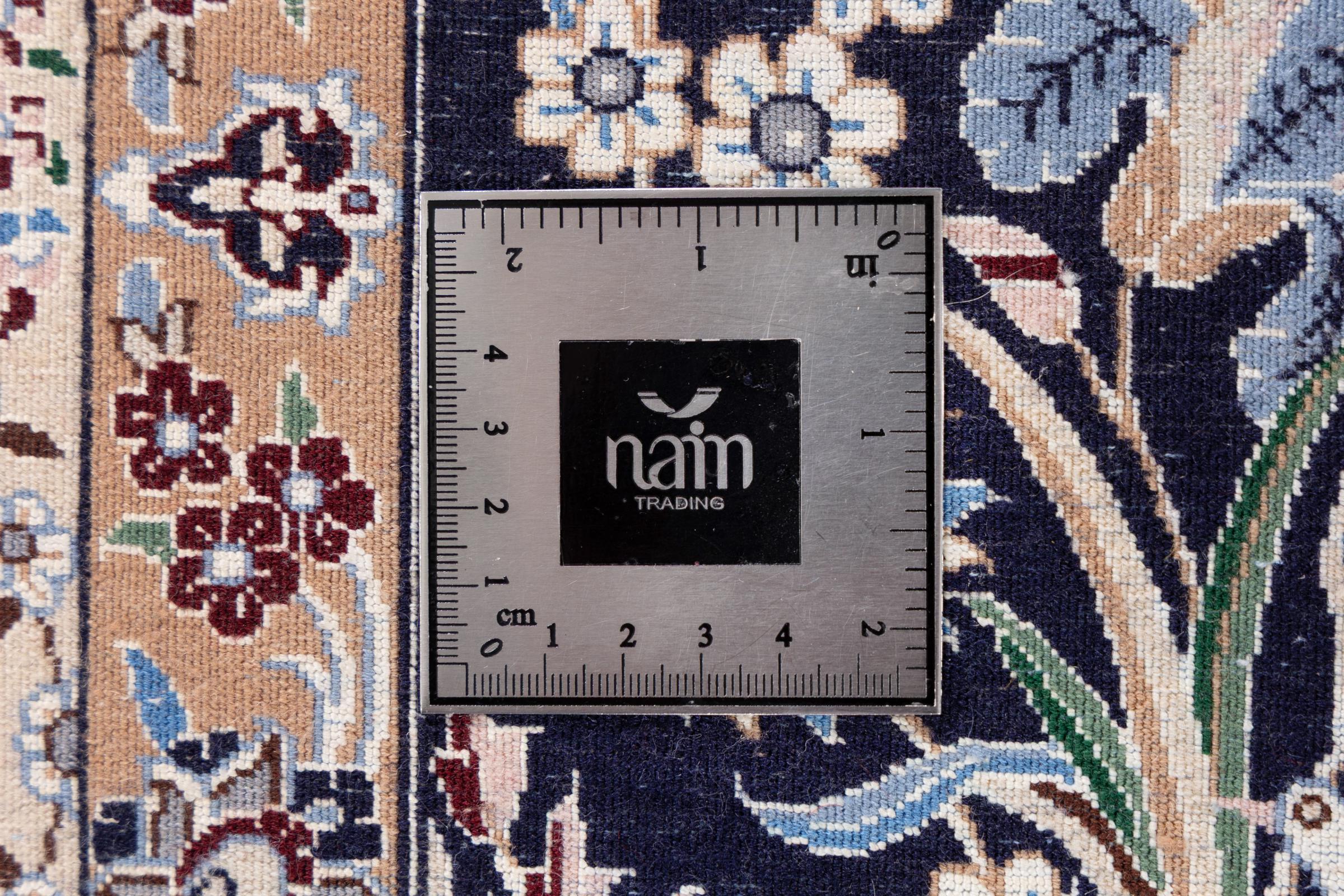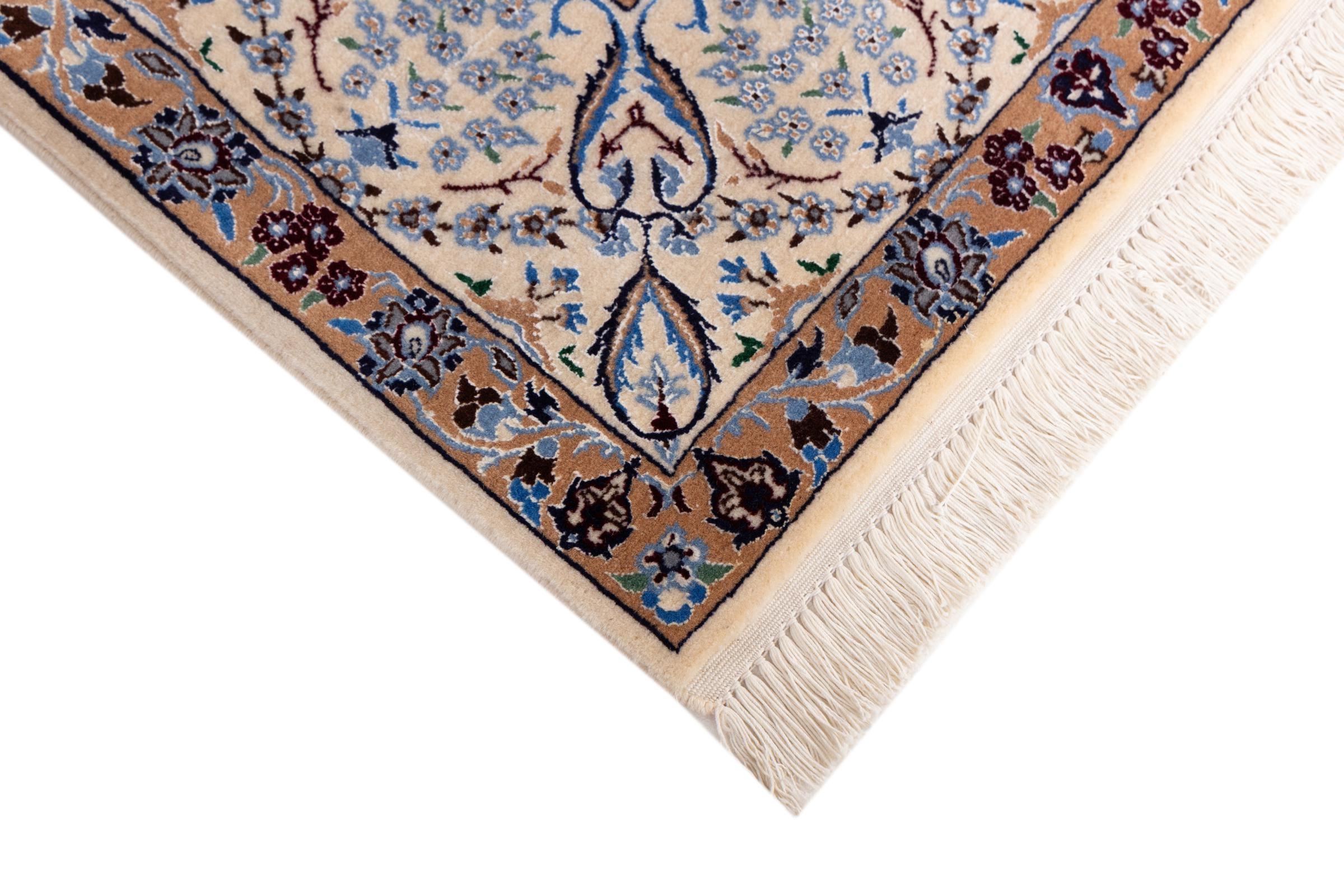 This Nain rug combines quality, tradition and an unmistakable design. It was hand-knotted from high-quality cork wool and natural silk in the desert town of the same name, Nain. Lovers of valuable rugs from Iran will love this Persian rug. With Nain rugs in the 6La and 4La classifications, you have a real work of art with an incredible level of detail that you can really lose yourself in. Nain 4La rugs are almost impossible to find today, as they are extremely elaborate to produce.