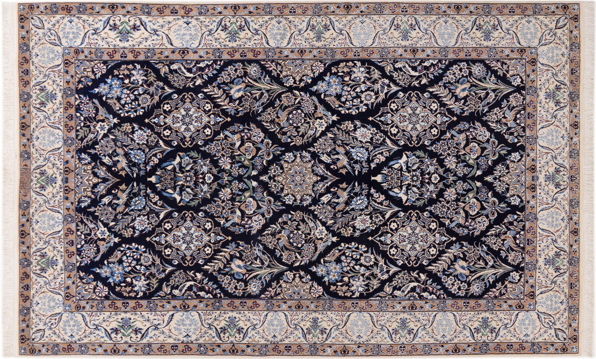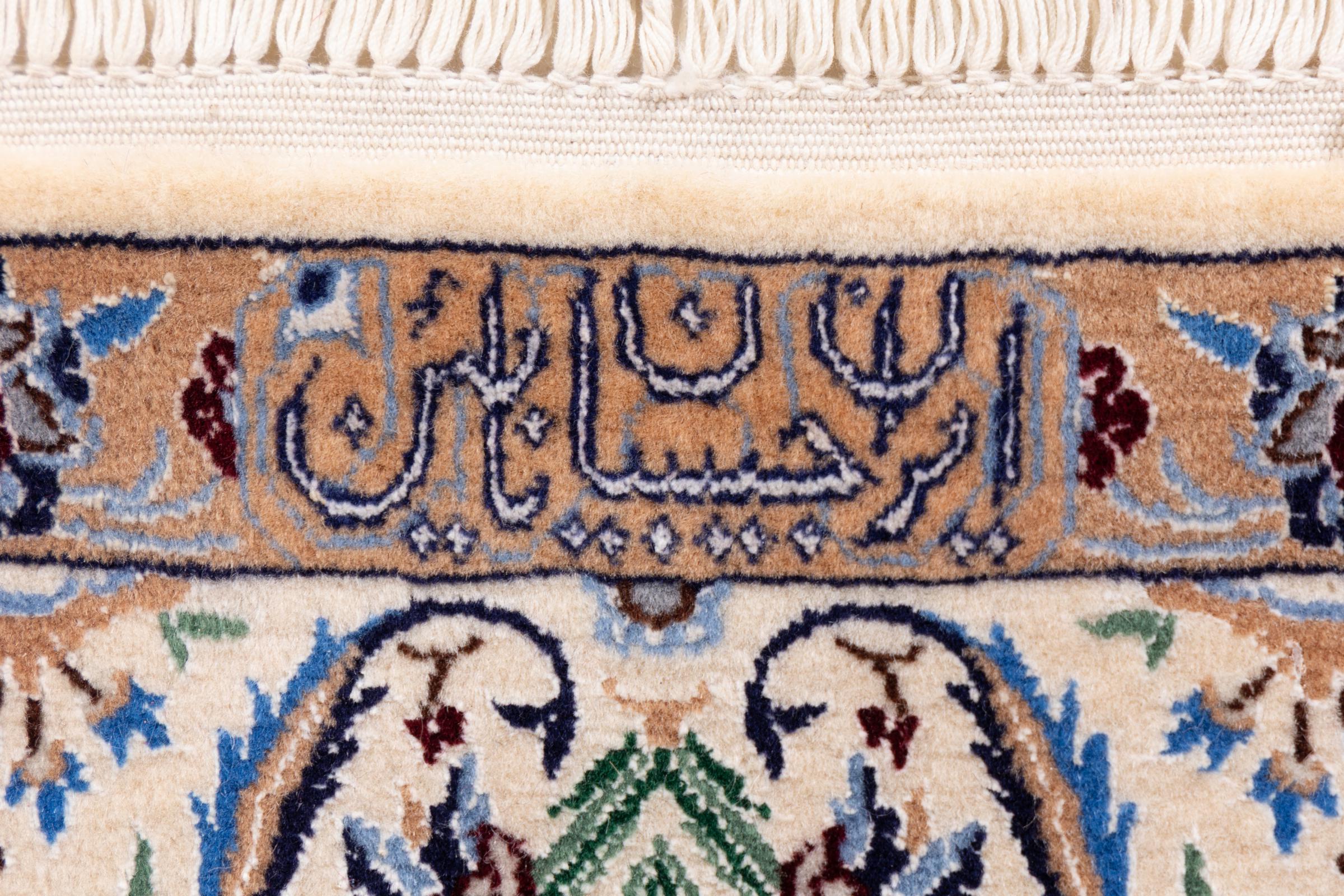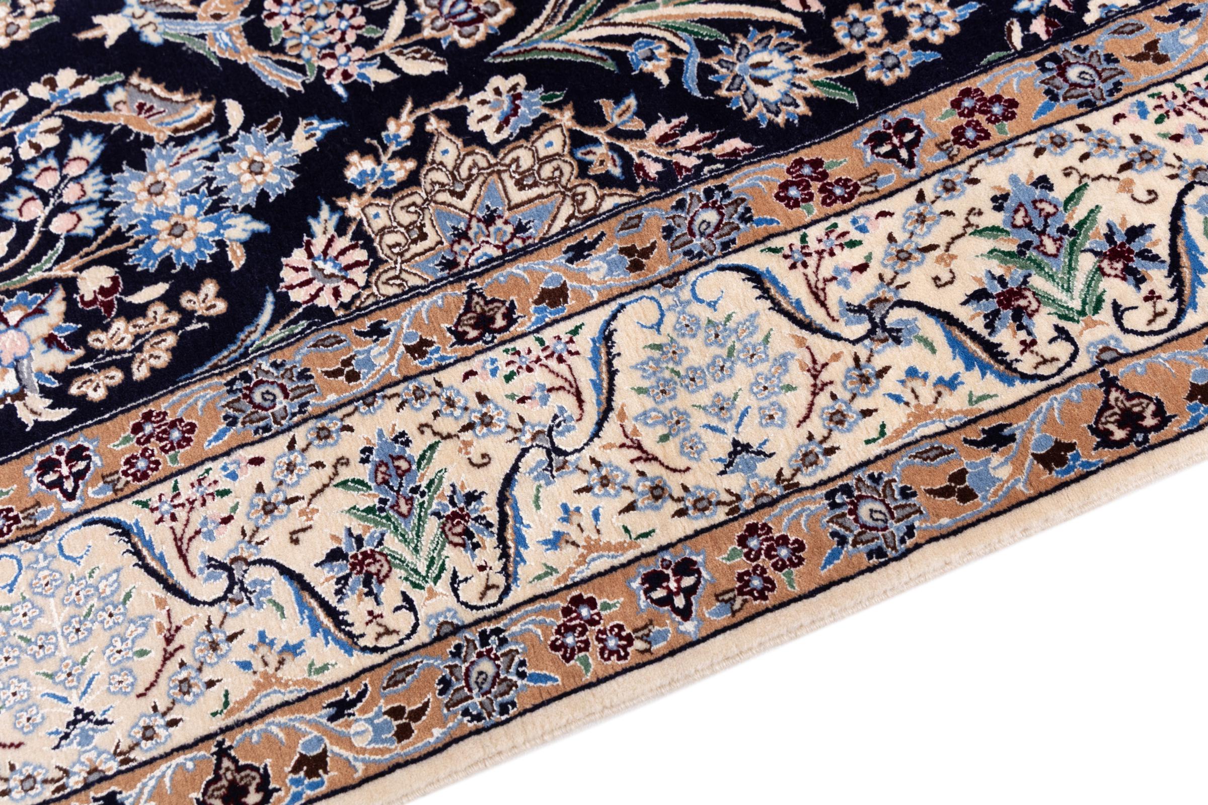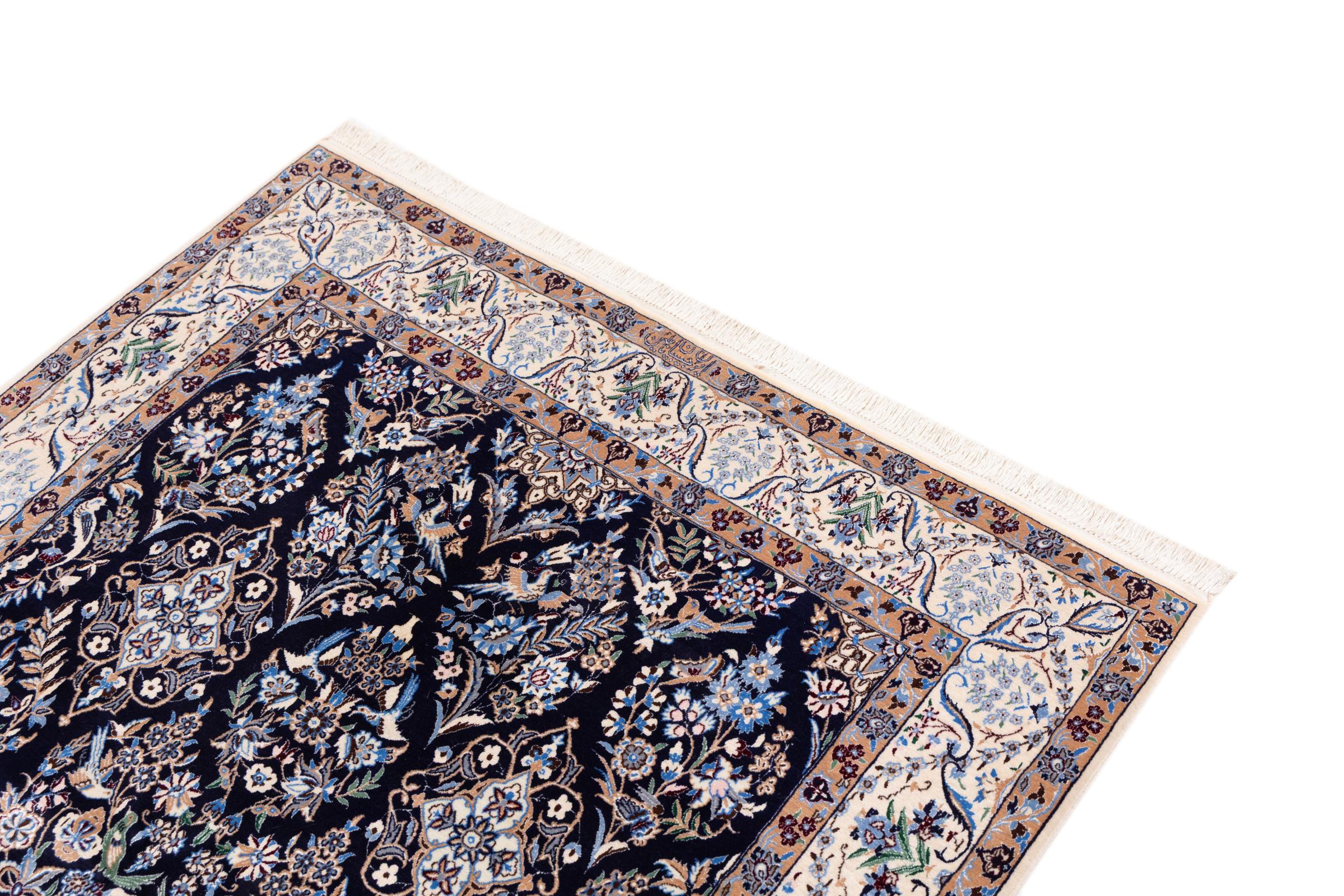 This Nain rug combines quality, tradition and an unmistakable design. It was hand-knotted from high-quality cork wool and natural silk in the desert town of the same name, Nain. Lovers of valuable rugs from Iran will love this Persian rug. With Nain rugs in the 6La and 4La classifications, you have a real work of art with an incredible level of detail that you can really lose yourself in. Nain 4La rugs are almost impossible to find today, as they are extremely elaborate to produce.