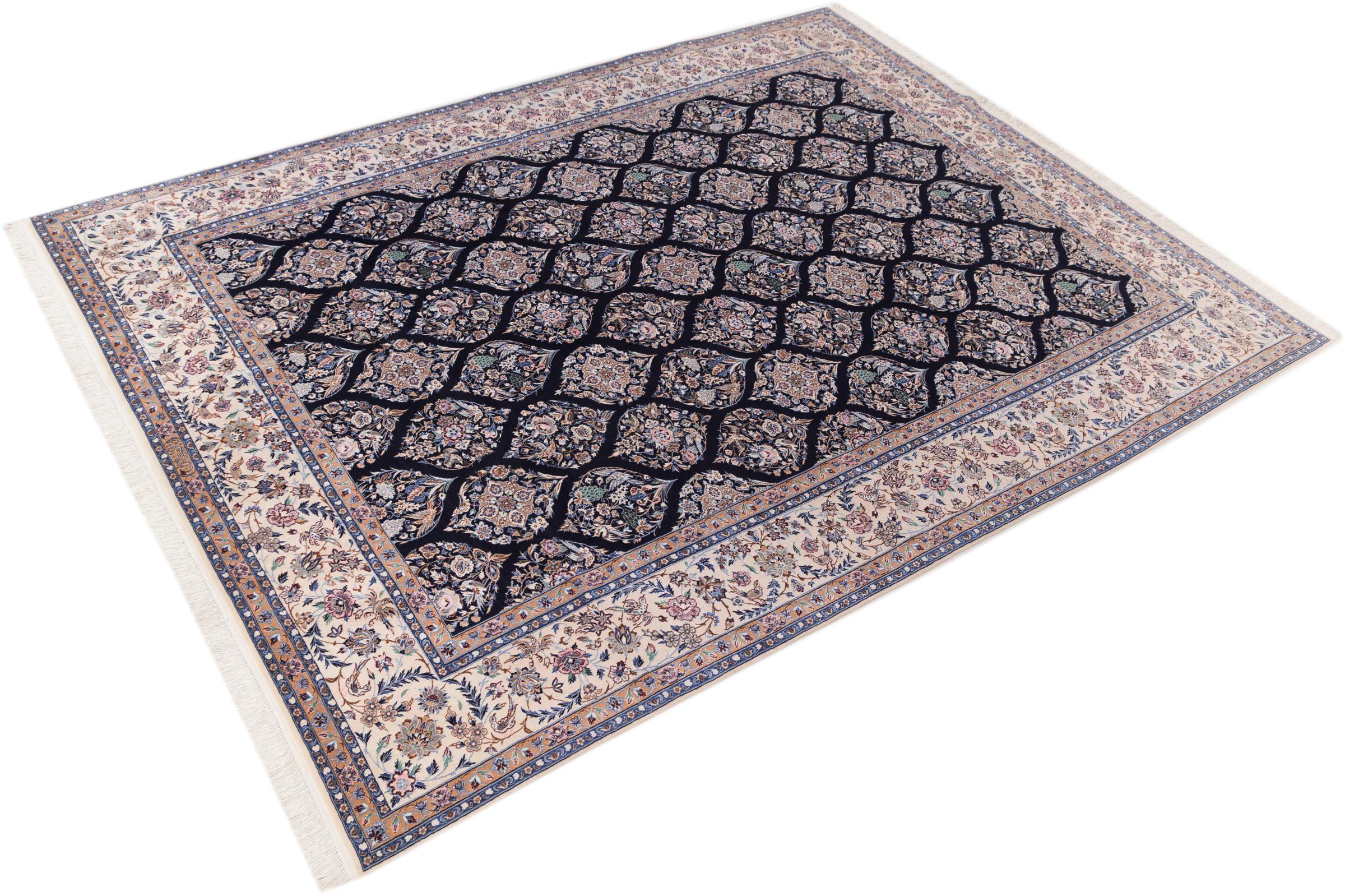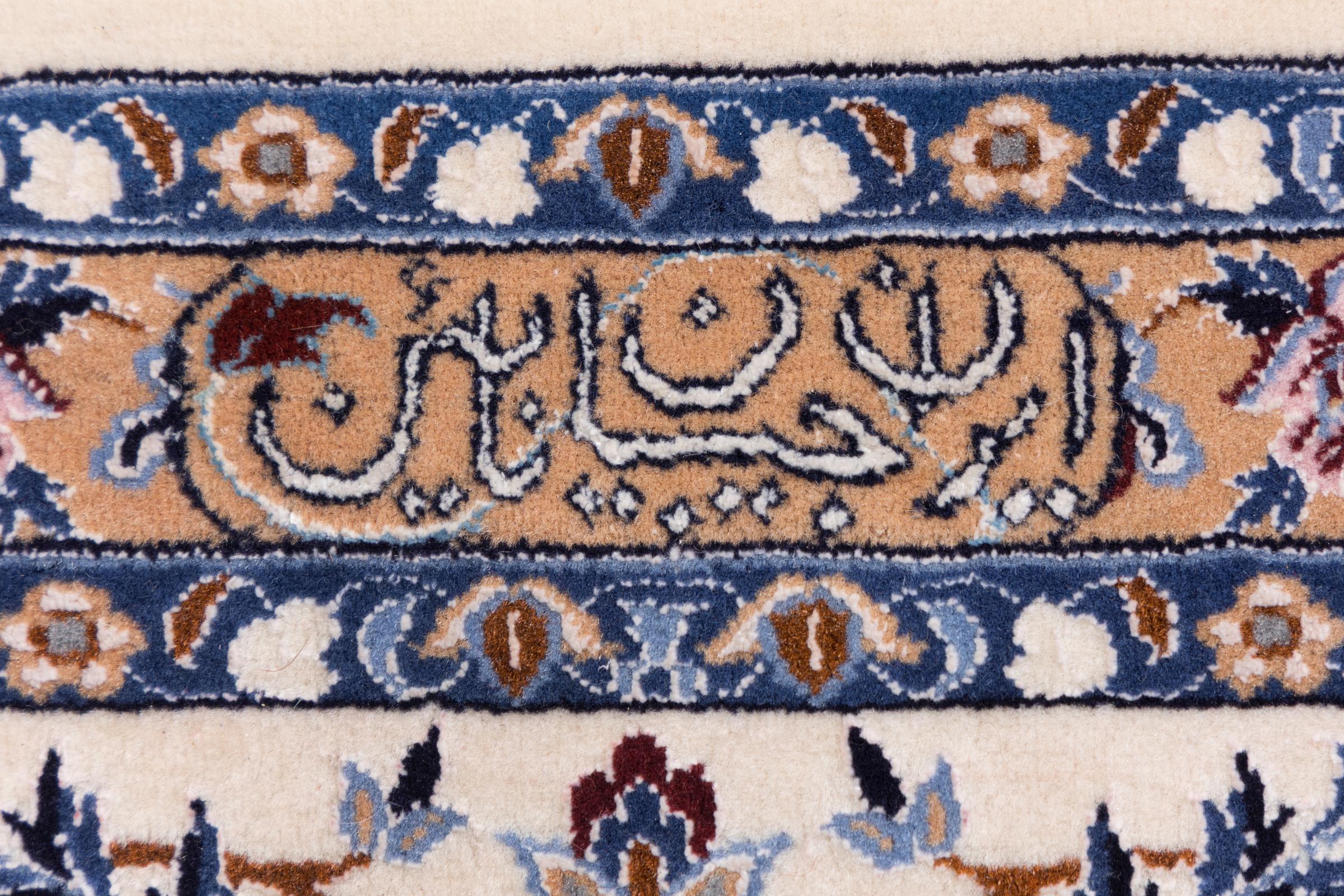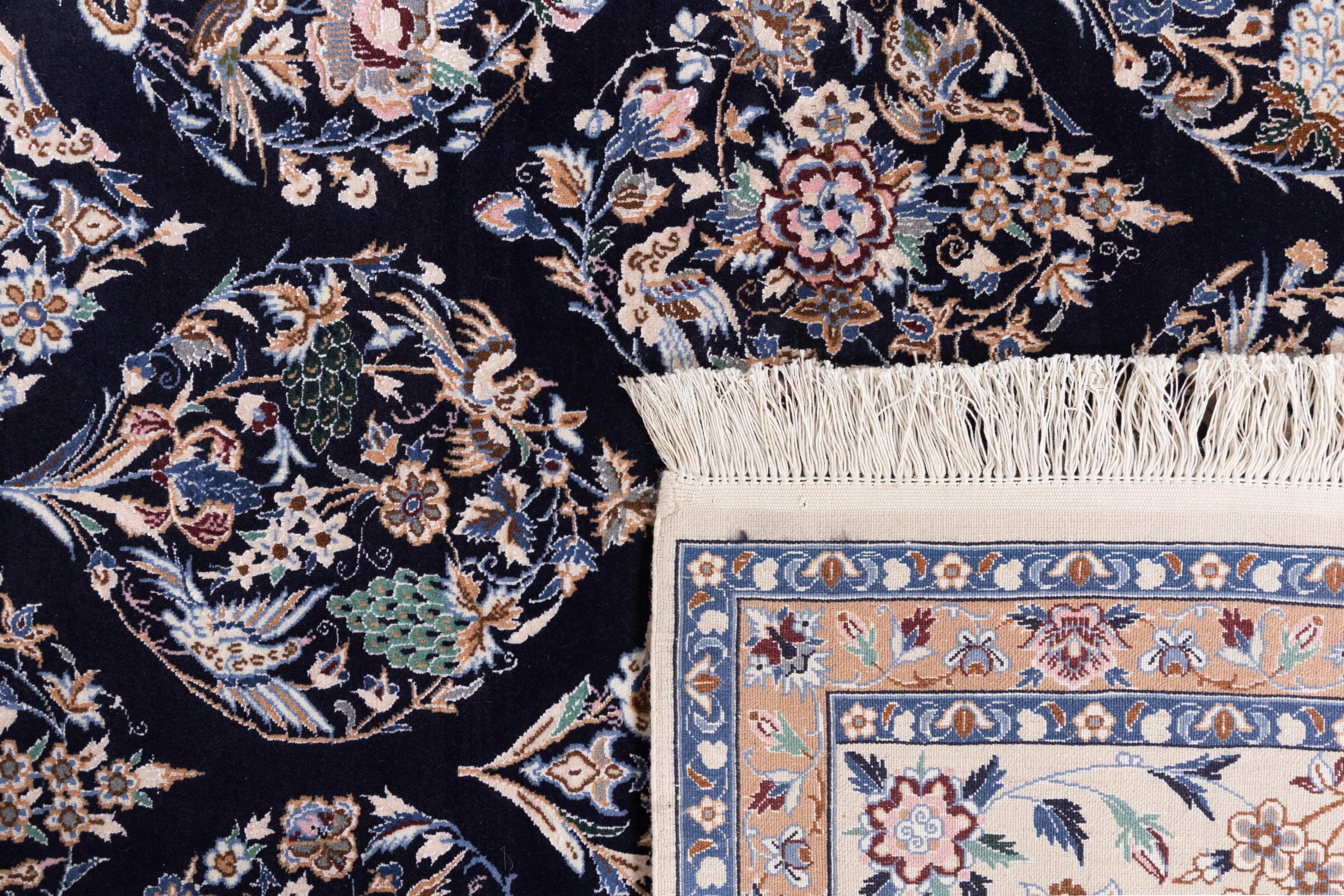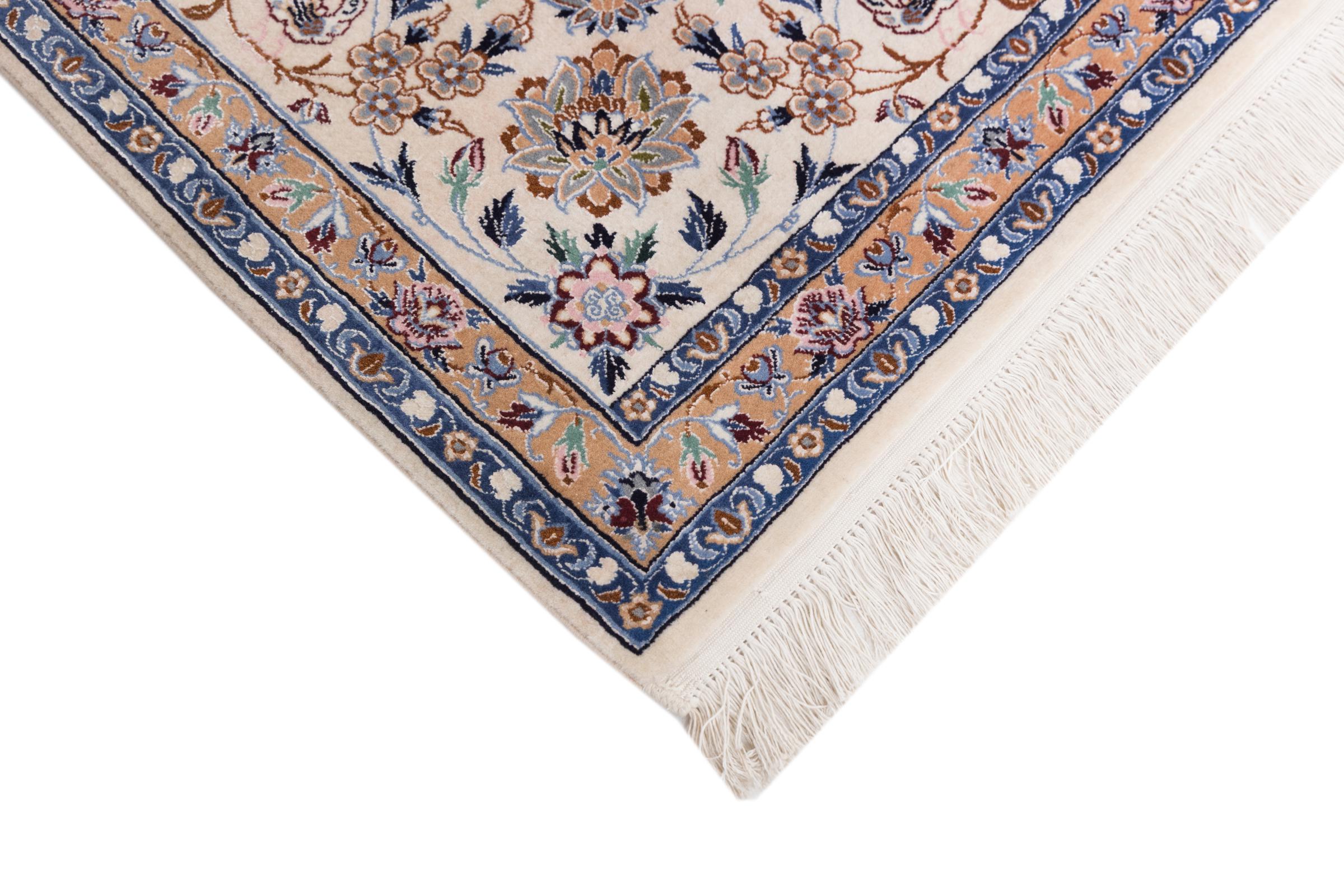 This Nain rug combines quality, tradition and an unmistakable design. It was hand-knotted from high-quality cork wool and natural silk in the desert town of the same name, Nain. Lovers of valuable rugs from Iran will love this Persian rug. With Nain rugs in the 6La and 4La classifications, you have a real work of art with an incredible level of detail that you can really lose yourself in. Nain 4La rugs are almost impossible to find today, as they are extremely elaborate to produce.