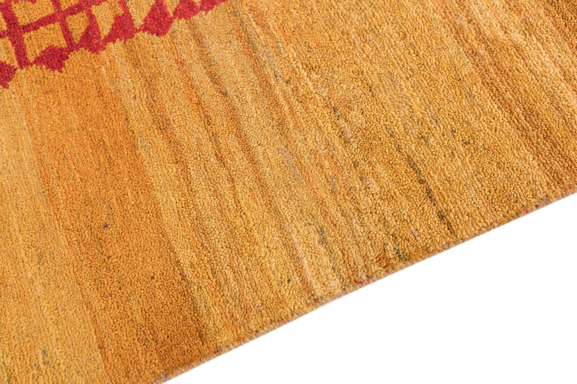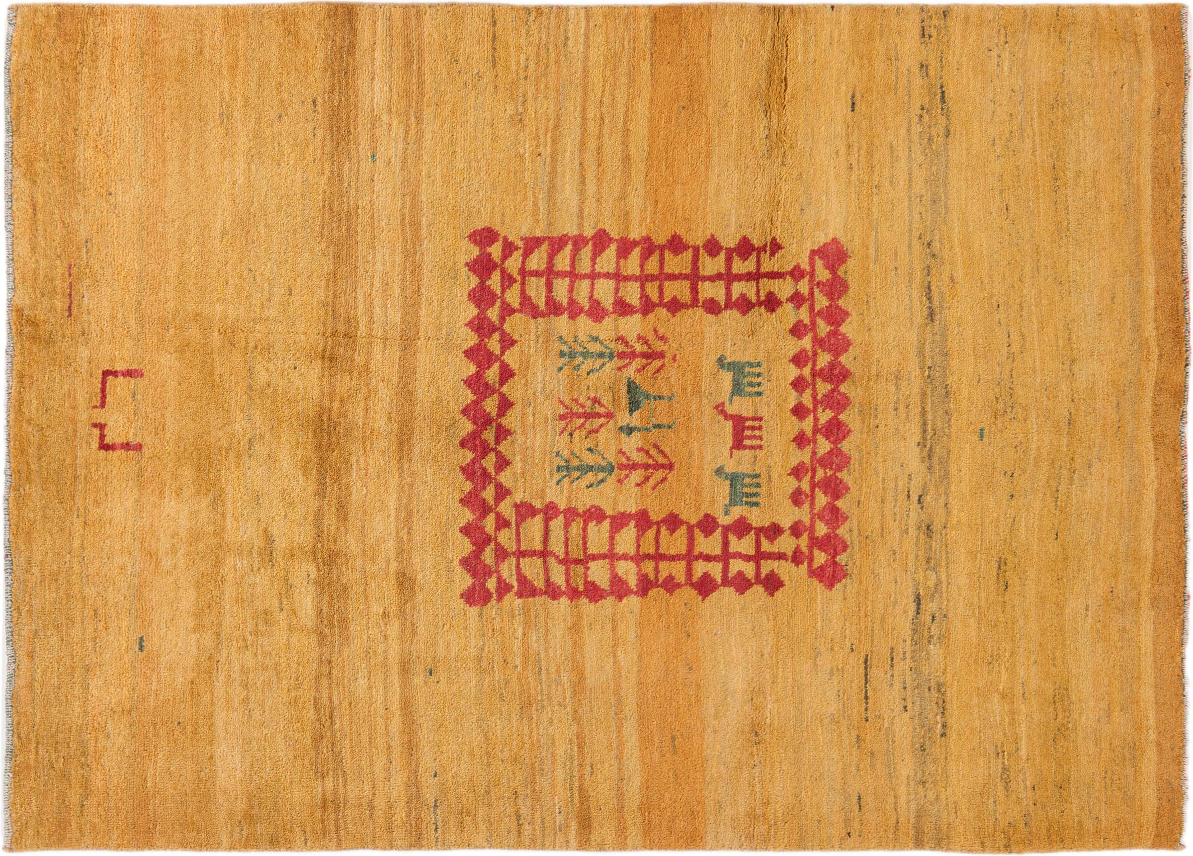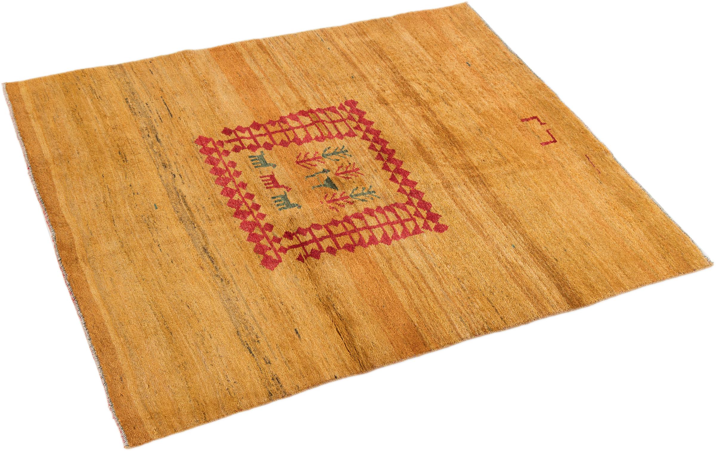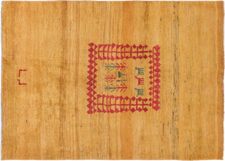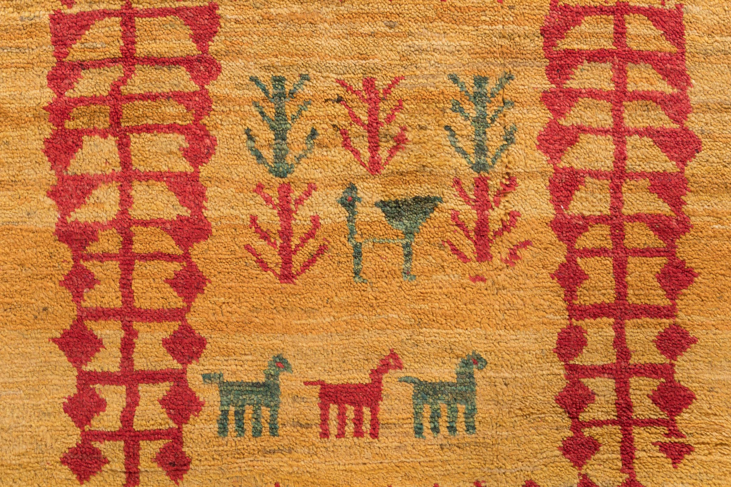 This beautiful rug is a Persian Gabbeh and thus belongs to the highest quality Gabbeh rugs. The rugs are knotted by nomads or semi-nomads in Iran following traditional handicraft. The simple motifs and patterns are mostly inspired by the nomads' close environment. For example camels, trees or bushes can be found on the traditional rugs. Persian Gabbeh rugs are made of wool from locally raised flocks of sheep. The wool is therefore mostly still spun by hand. Thus each of these oriental rugs embodies a unique character of centuries-old culture.
