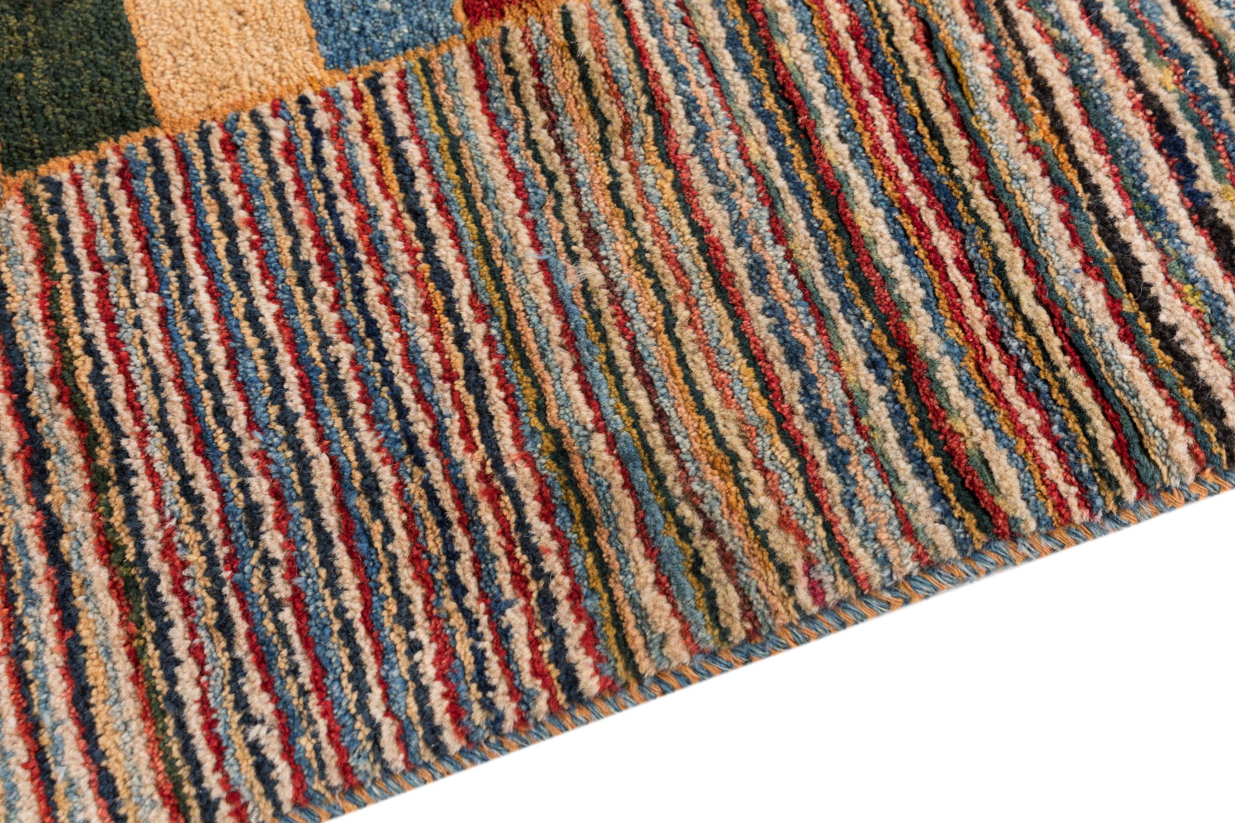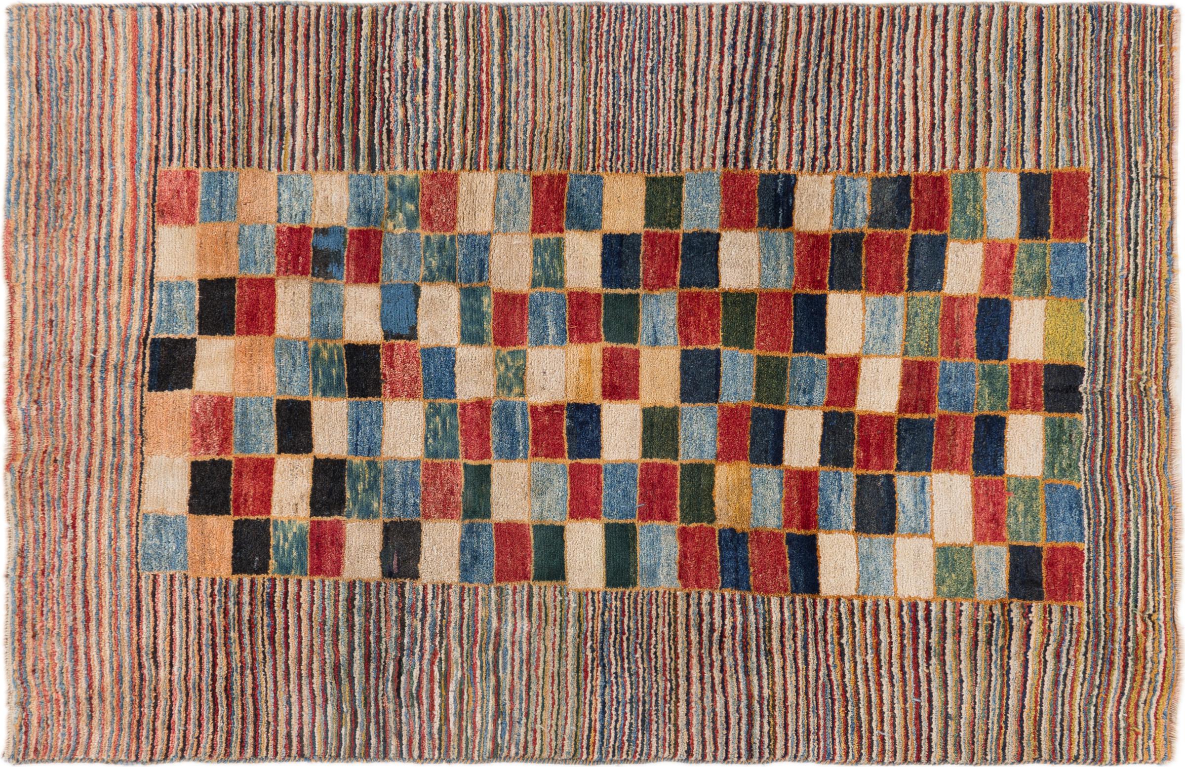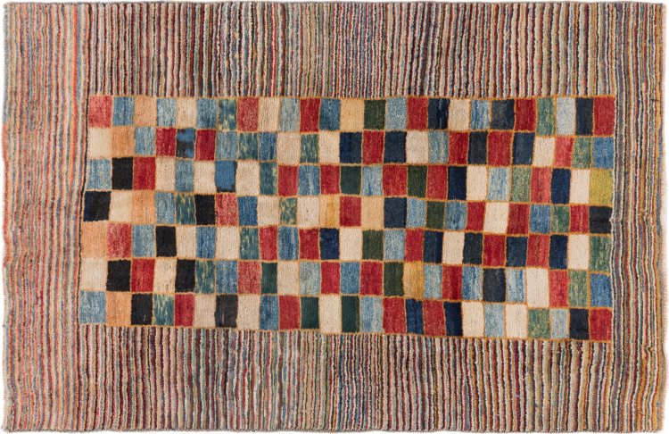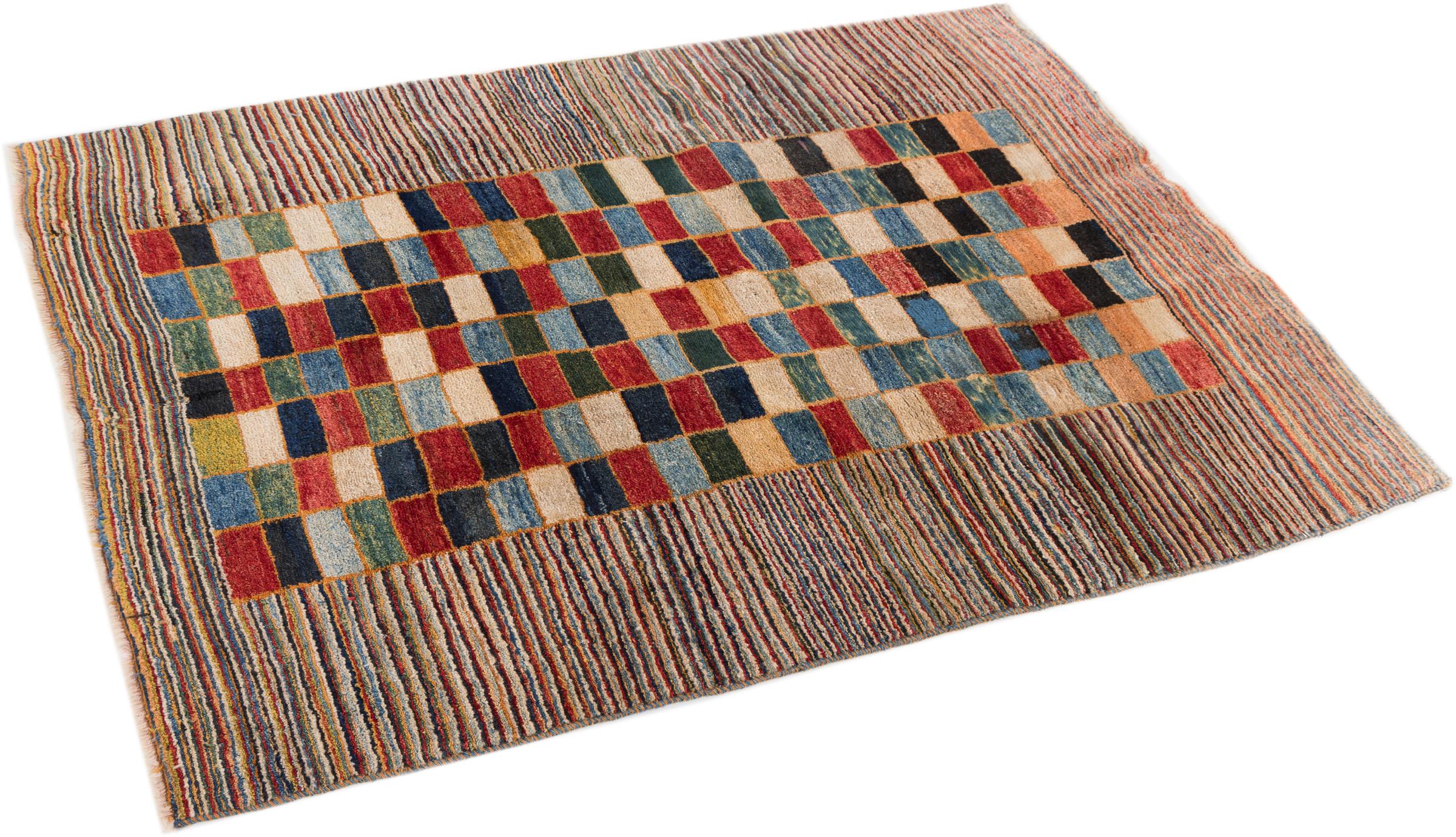 This beautiful rug is a Persian Gabbeh and thus belongs to the highest quality Gabbeh rugs. The rugs are knotted by nomads or semi-nomads in Iran following traditional handicraft. The simple motifs and patterns are mostly inspired by the nomads' close environment. For example camels, trees or bushes can be found on the traditional rugs. Persian Gabbeh rugs are made of wool from locally raised flocks of sheep. The wool is therefore mostly still spun by hand. Thus each of these oriental rugs embodies a unique character of centuries-old culture.