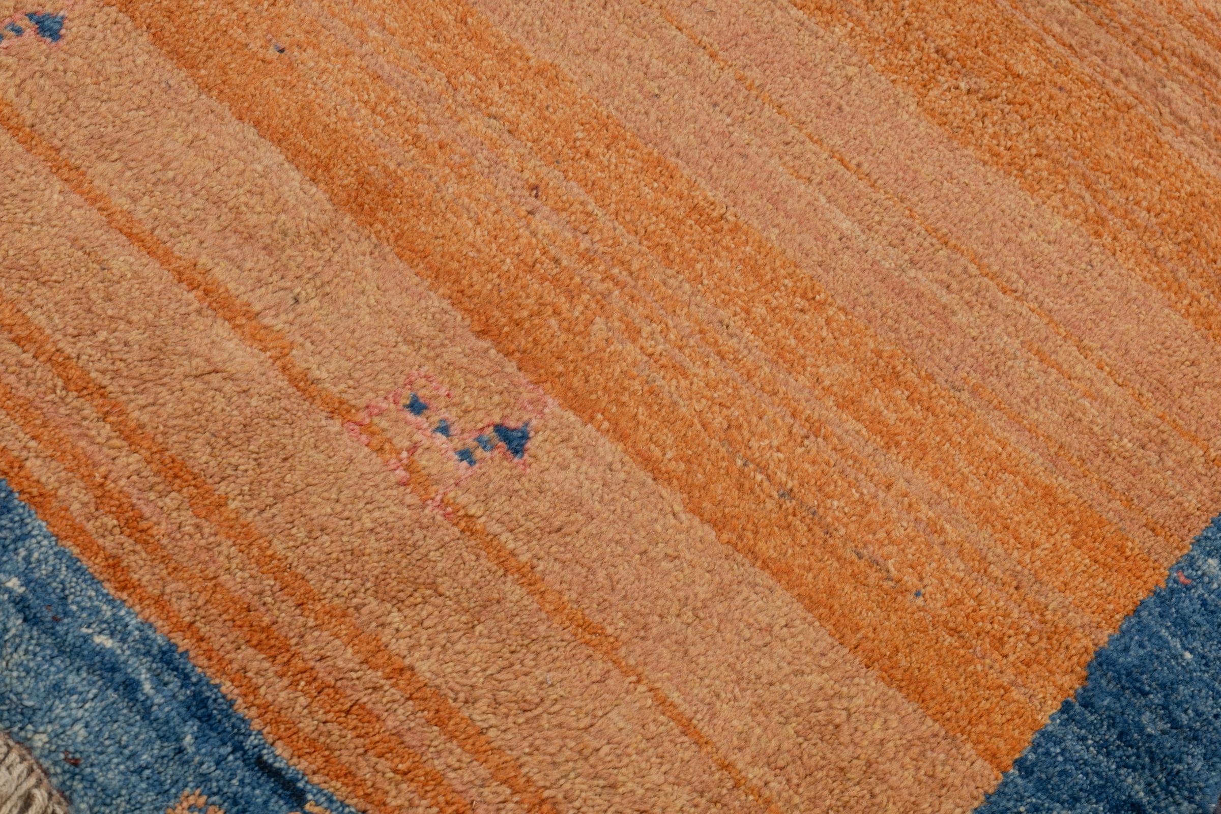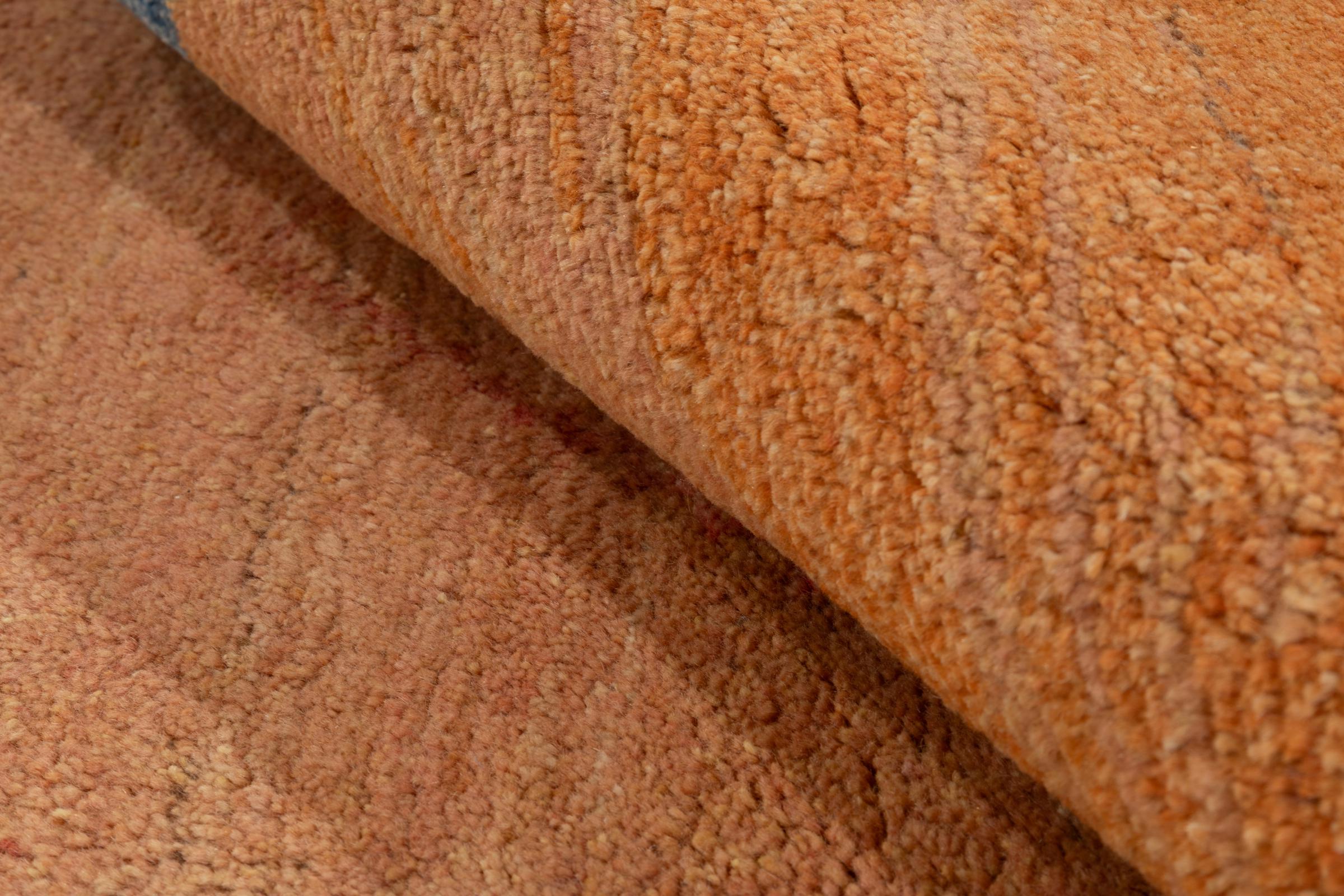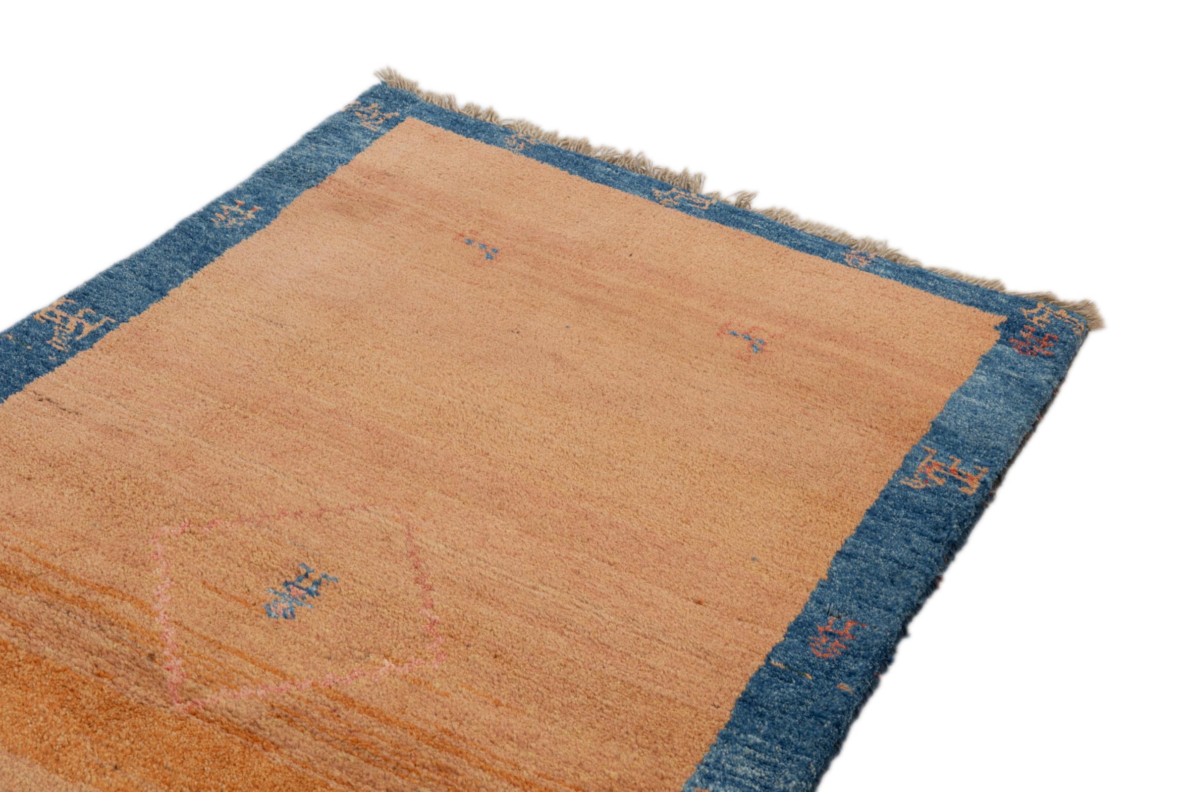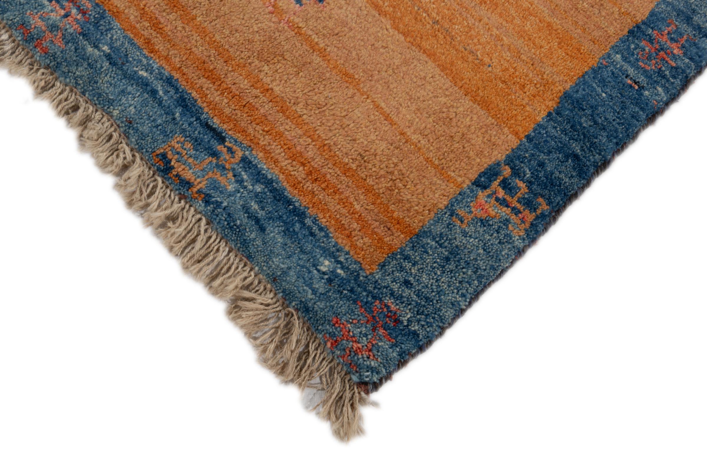 This beautiful rug is a Persian Gabbeh and thus belongs to the highest quality Gabbeh rugs. The rugs are knotted by nomads or semi-nomads in Iran following traditional handicraft. The simple motifs and patterns are mostly inspired by the nomads' close environment. For example camels, trees or bushes can be found on the traditional rugs. Persian Gabbeh rugs are made of wool from locally raised flocks of sheep. The wool is therefore mostly still spun by hand. Thus each of these oriental rugs embodies a unique character of centuries-old culture.