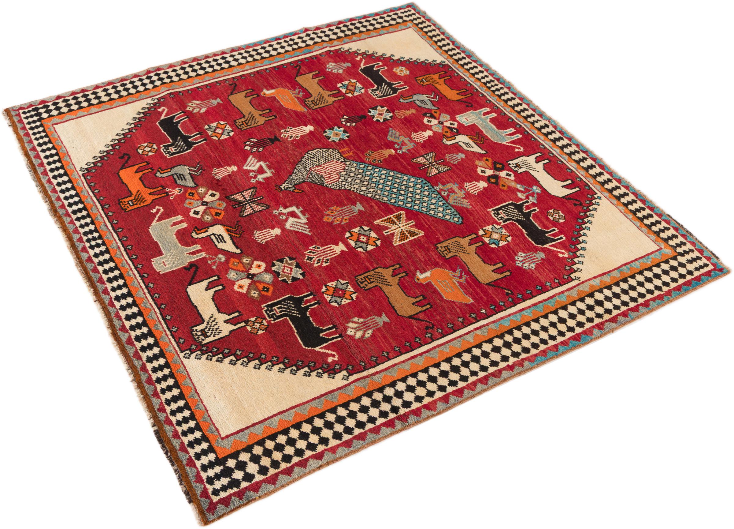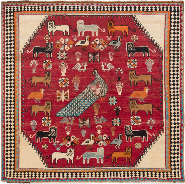 Carpet ID: 296269002165 Size: 194x194 cm Thickness: ap. 18 mm Knot density: 72 000 - 90 000 / m² Manufacturing: Knotted by hand Pile: Handspun wool Warp: Sheep wool Origin: Persia Age: New Weight: ap. 19 kg Also know as Gabbe, Ghabbeh In stock: Unique - Only 1 in stock