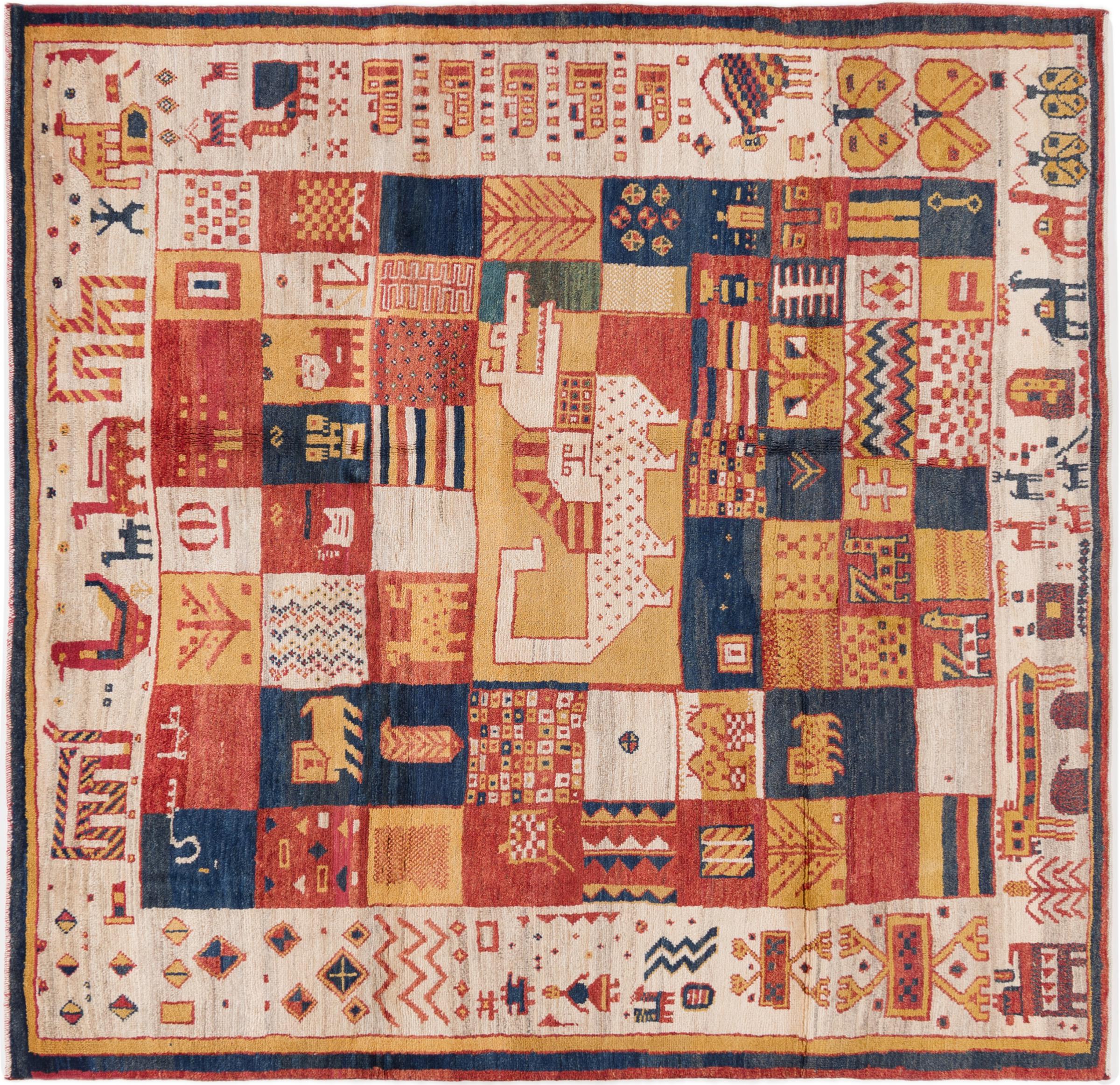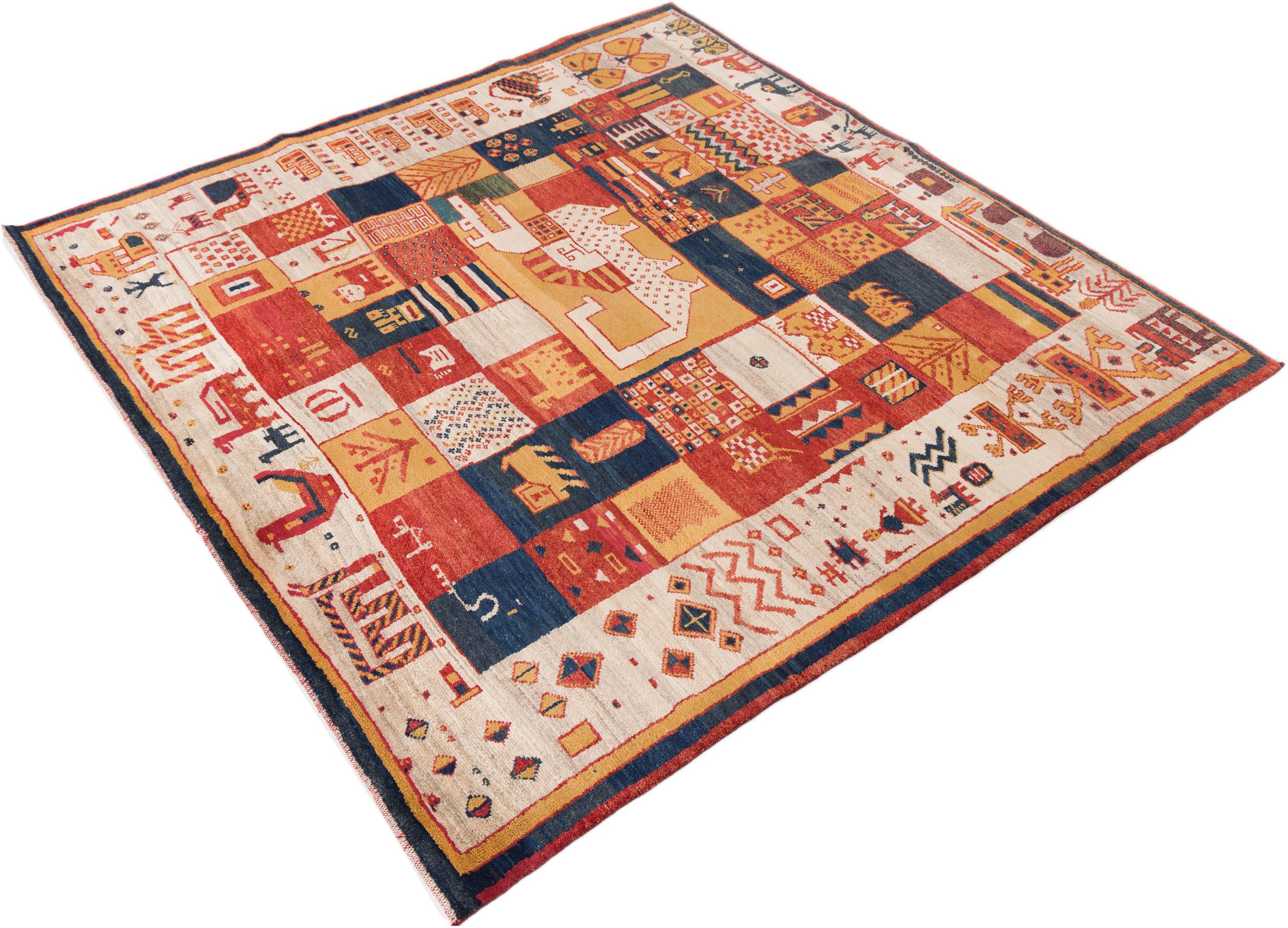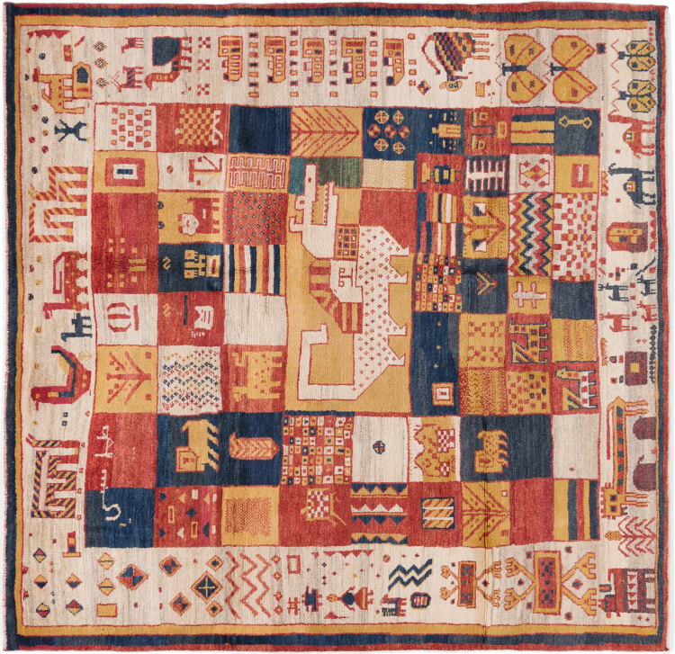 Carpet ID: 296263007691 Size: 195x200 cm Thickness: ap. 18 mm Knot density: 72 000 - 90 000 / m² Manufacturing: Knotted by hand Pile: Handspun wool Warp: Sheep wool Origin: Persia Age: New Weight: ap. 20 kg Also know as Gabbe, Ghabbeh In stock: Unique - Only 1 in stock