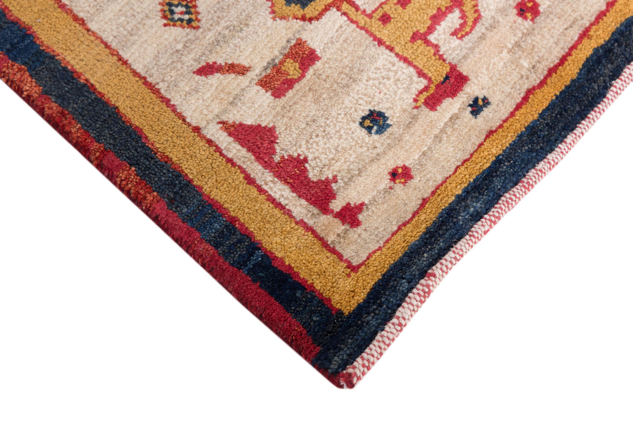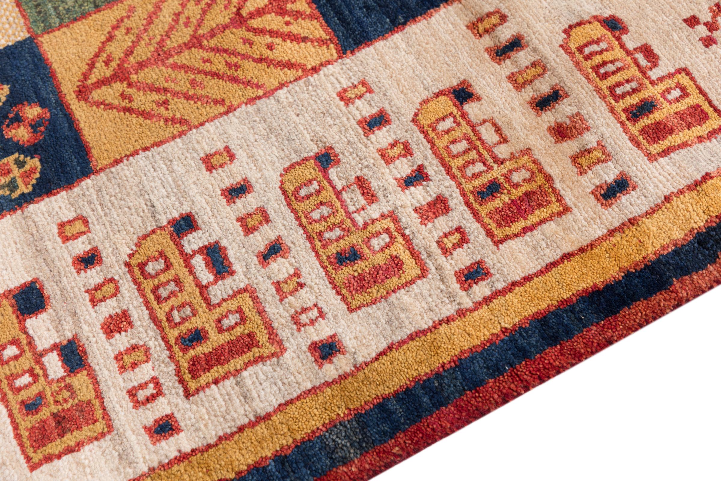 This beautiful rug is a Persian Gabbeh and thus belongs to the highest quality Gabbeh rugs. The rugs are knotted by nomads or semi-nomads in Iran following traditional handicraft. The simple motifs and patterns are mostly inspired by the nomads' close environment. For example camels, trees or bushes can be found on the traditional rugs. Persian Gabbeh rugs are made of wool from locally raised flocks of sheep. The wool is therefore mostly still spun by hand. Thus each of these oriental rugs embodies a unique character of centuries-old culture.