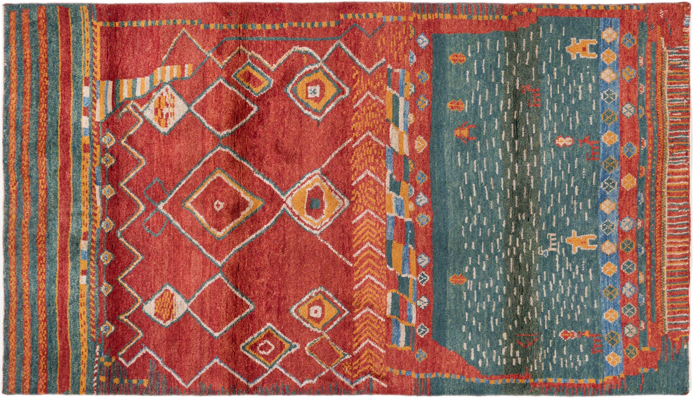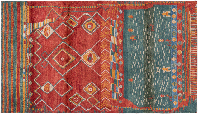 This beautiful rug is a Persian Gabbeh and thus belongs to the highest quality Gabbeh rugs. The rugs are knotted by nomads or semi-nomads in Iran following traditional handicraft. The simple motifs and patterns are mostly inspired by the nomads' close environment. For example camels, trees or bushes can be found on the traditional rugs. Persian Gabbeh rugs are made of wool from locally raised flocks of sheep. The wool is therefore mostly still spun by hand. Thus each of these oriental rugs embodies a unique character of centuries-old culture.