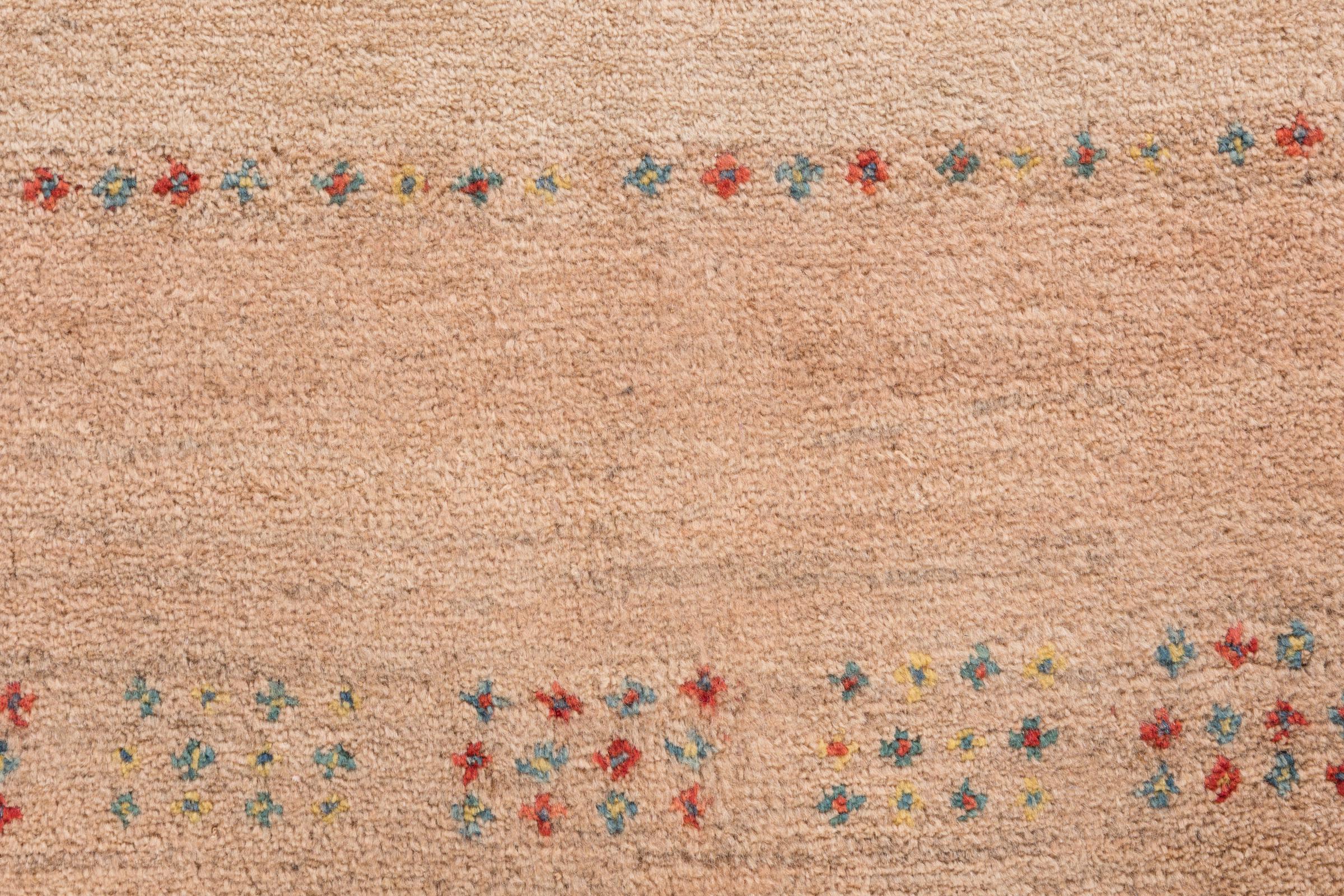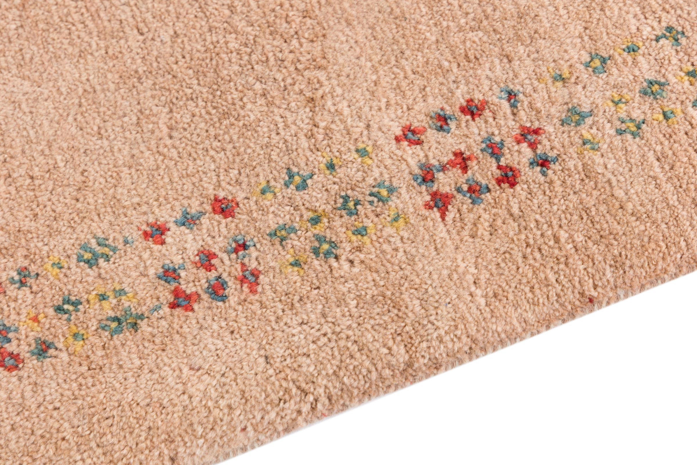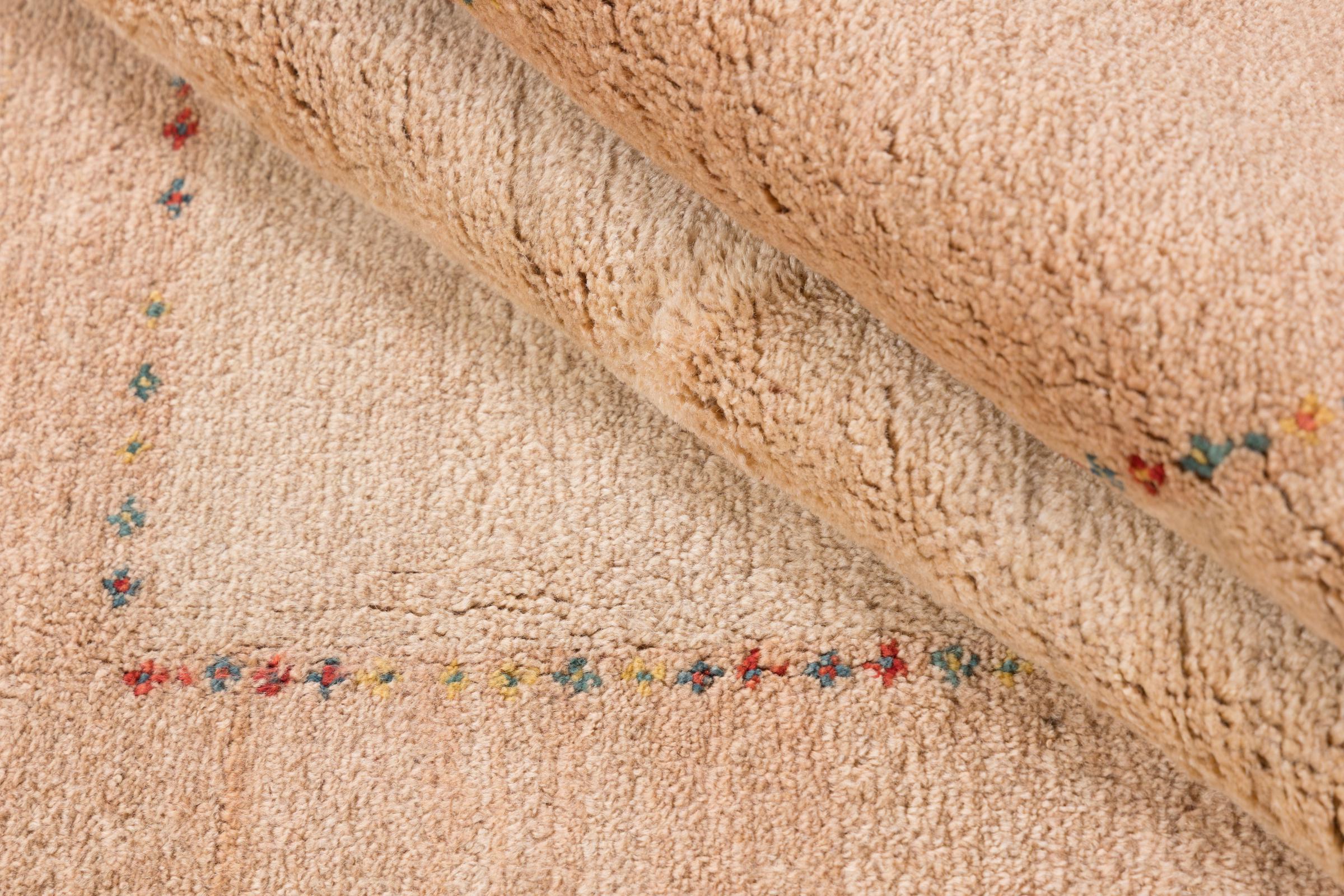 This beautiful rug is a Persian Gabbeh and thus belongs to the highest quality Gabbeh rugs. The rugs are knotted by nomads or semi-nomads in Iran following traditional handicraft. The simple motifs and patterns are mostly inspired by the nomads' close environment. For example camels, trees or bushes can be found on the traditional rugs. Persian Gabbeh rugs are made of wool from locally raised flocks of sheep. The wool is therefore mostly still spun by hand. Thus each of these oriental rugs embodies a unique character of centuries-old culture.