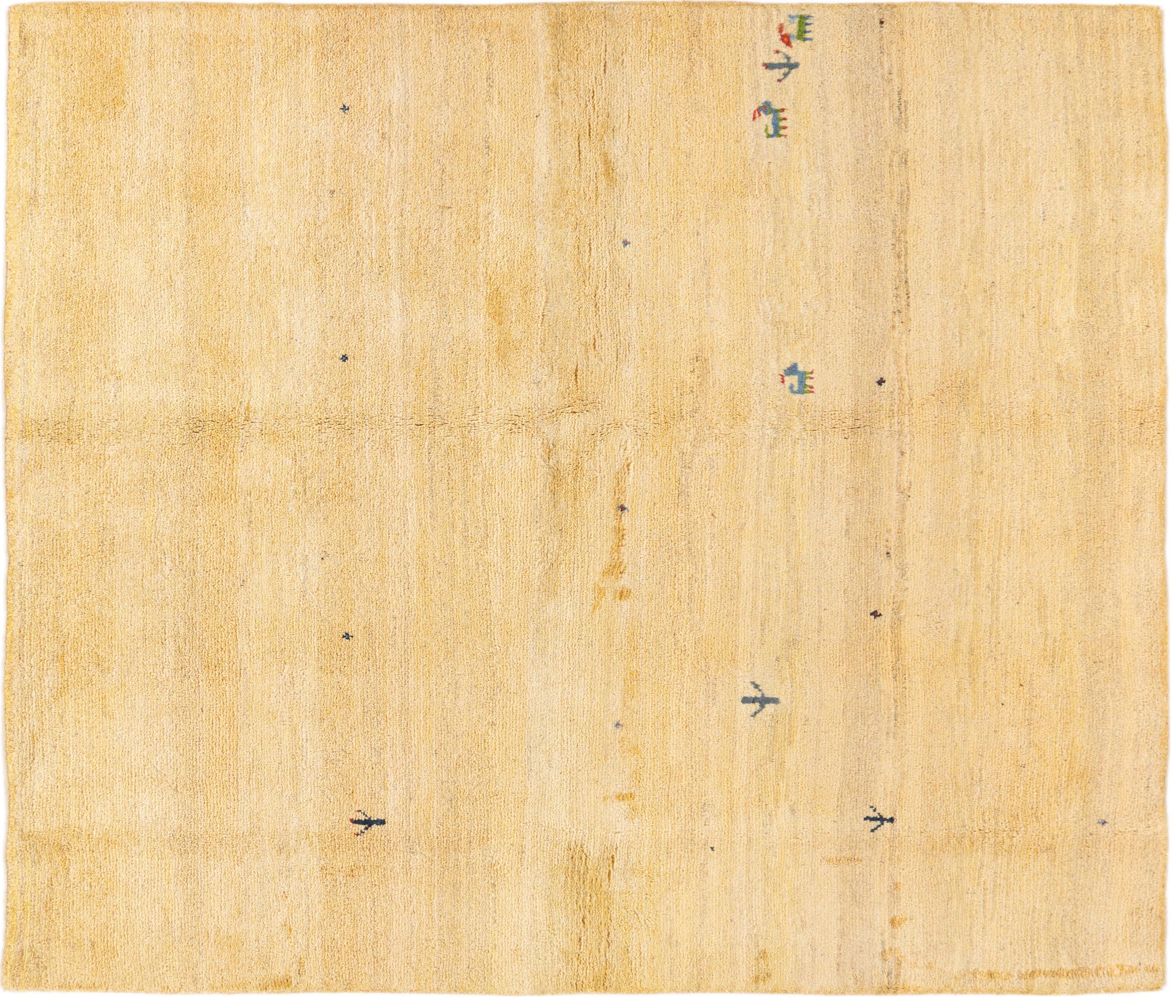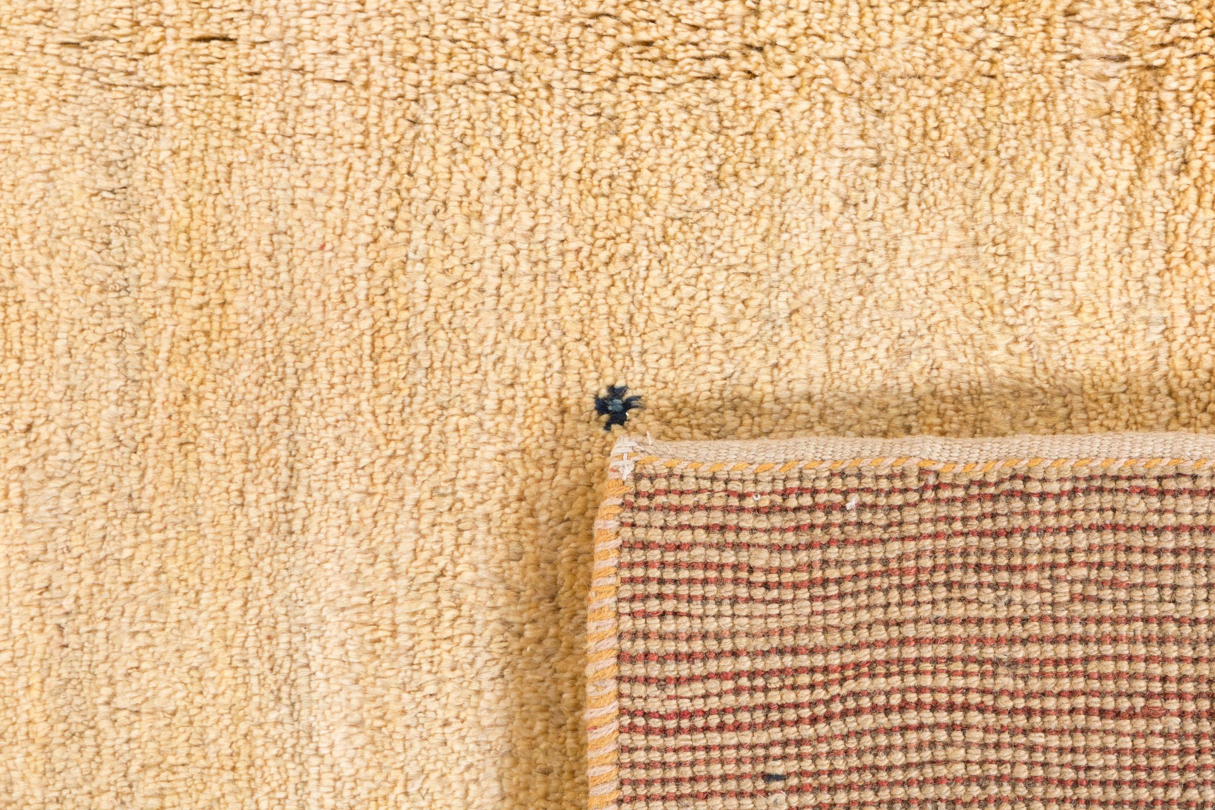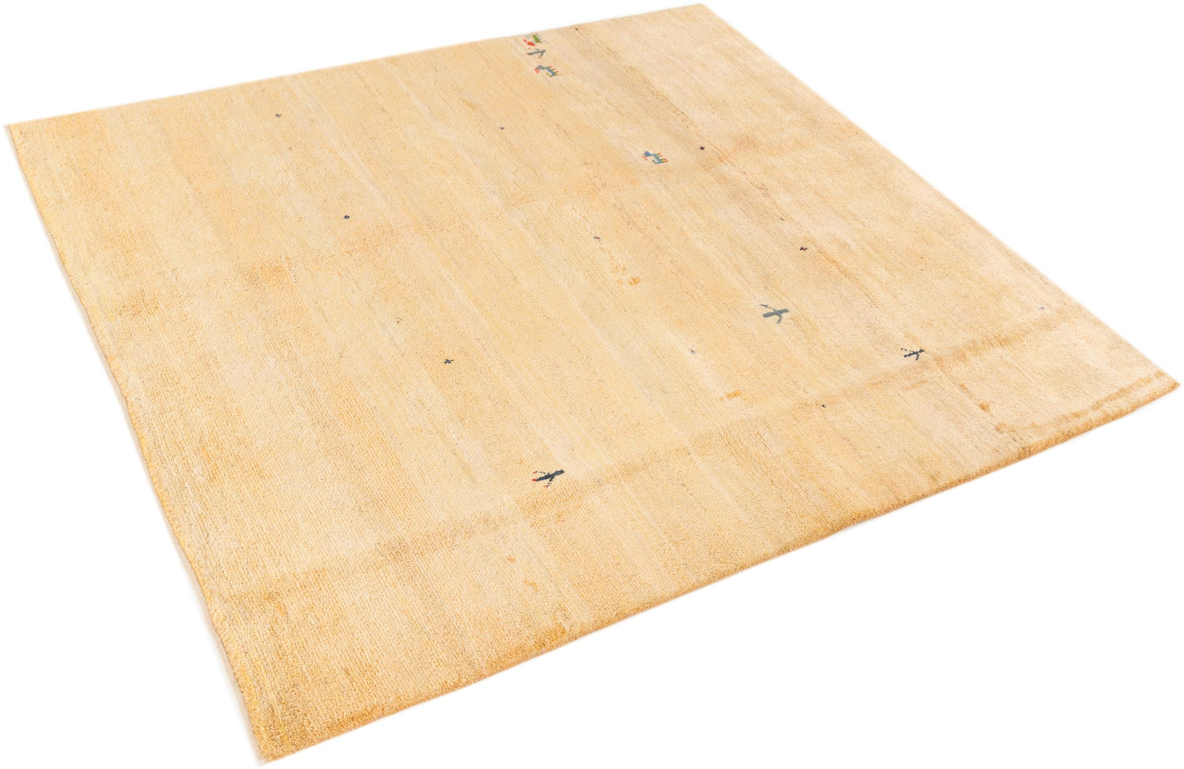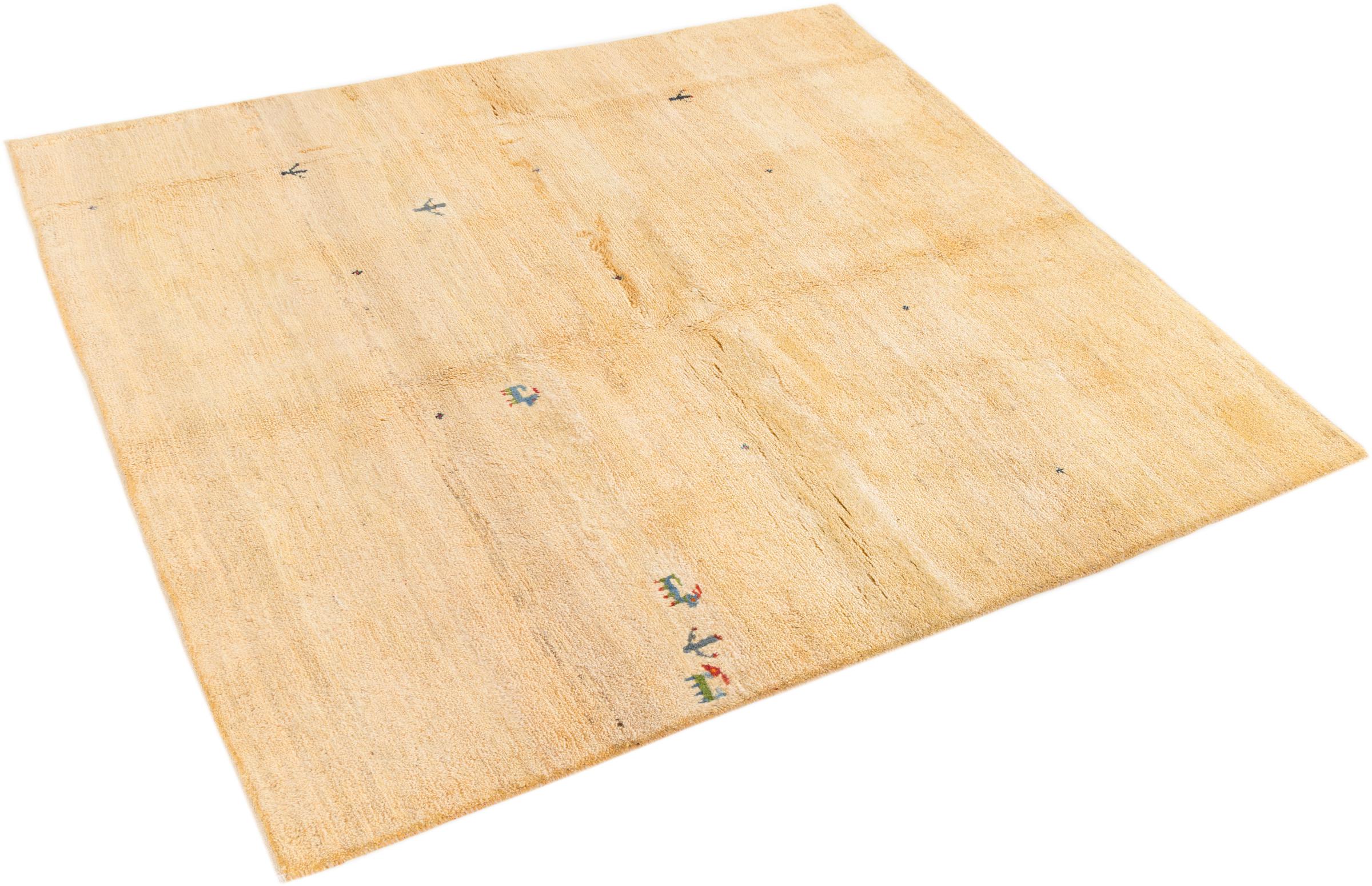 This beautiful rug is a Persian Gabbeh and thus belongs to the highest quality Gabbeh rugs. The rugs are knotted by nomads or semi-nomads in Iran following traditional handicraft. The simple motifs and patterns are mostly inspired by the nomads' close environment. For example camels, trees or bushes can be found on the traditional rugs. Persian Gabbeh rugs are made of wool from locally raised flocks of sheep. The wool is therefore mostly still spun by hand. Thus each of these oriental rugs embodies a unique character of centuries-old culture.