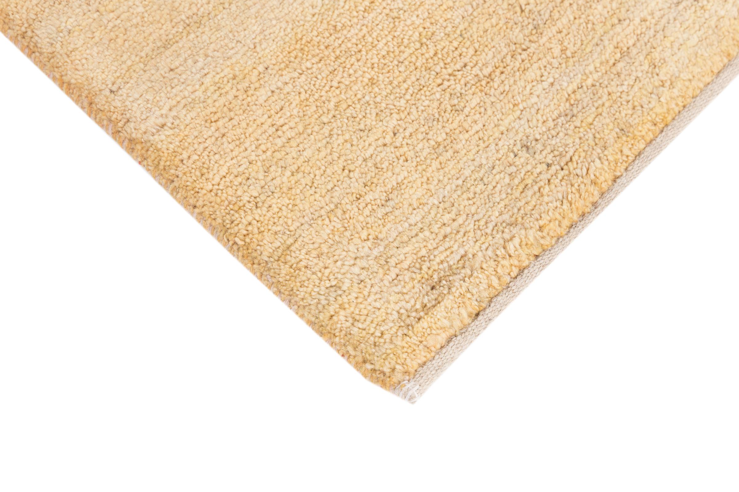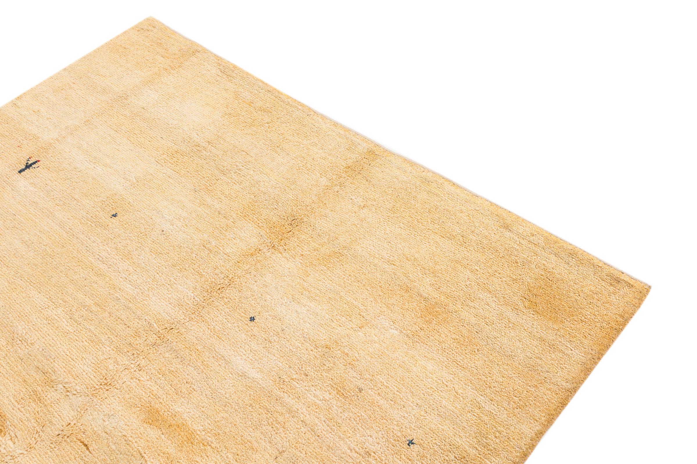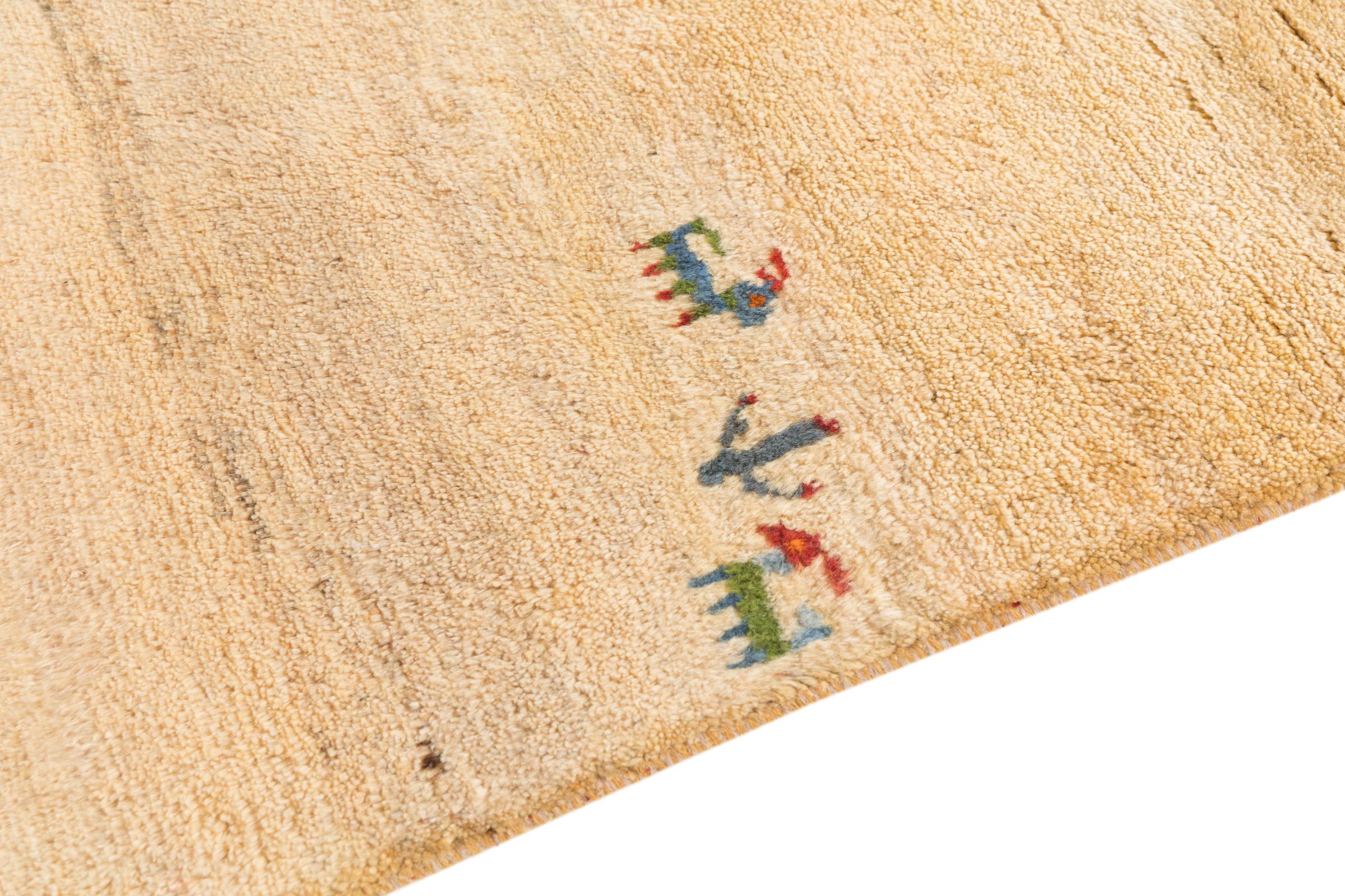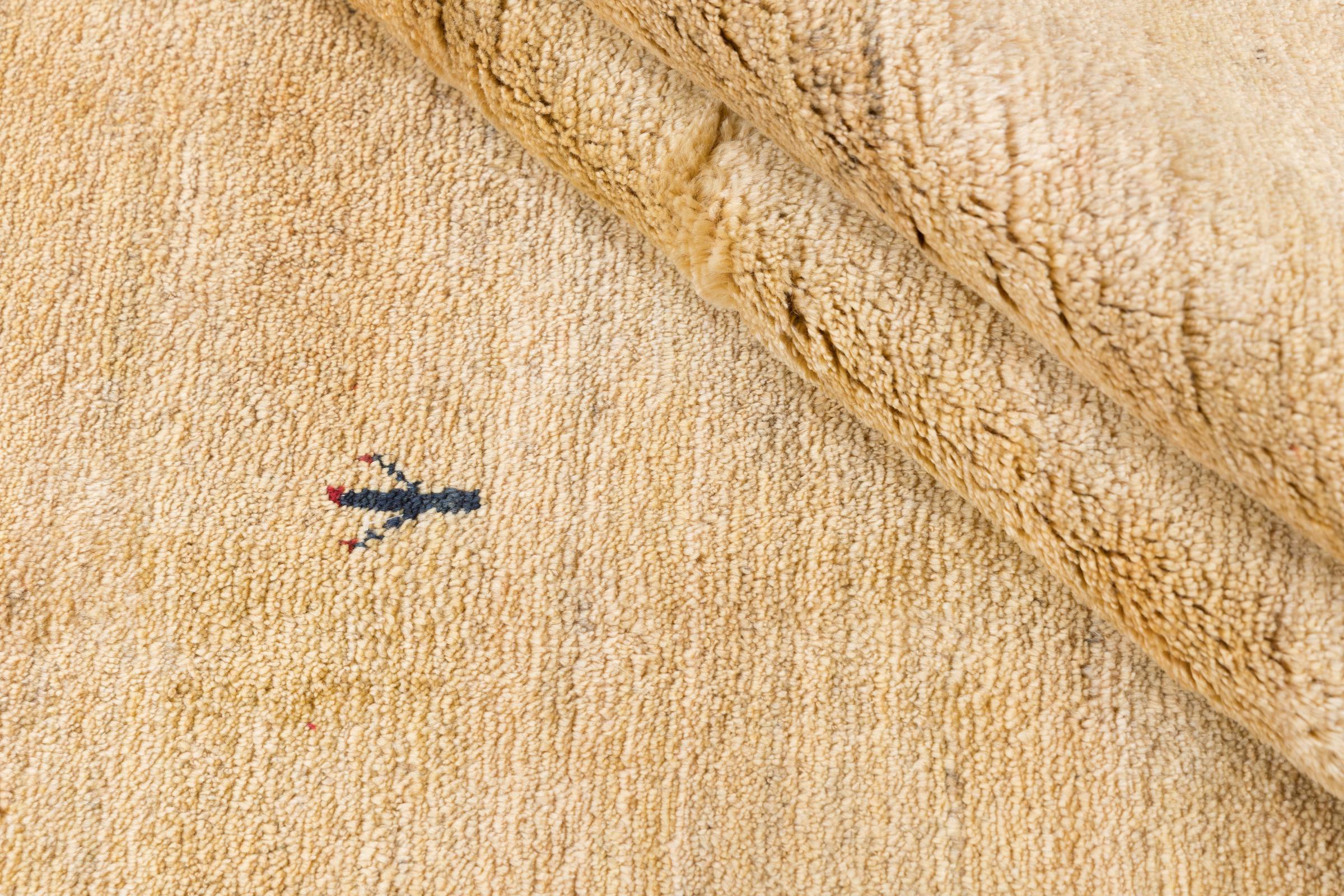 This beautiful rug is a Persian Gabbeh and thus belongs to the highest quality Gabbeh rugs. The rugs are knotted by nomads or semi-nomads in Iran following traditional handicraft. The simple motifs and patterns are mostly inspired by the nomads' close environment. For example camels, trees or bushes can be found on the traditional rugs. Persian Gabbeh rugs are made of wool from locally raised flocks of sheep. The wool is therefore mostly still spun by hand. Thus each of these oriental rugs embodies a unique character of centuries-old culture.