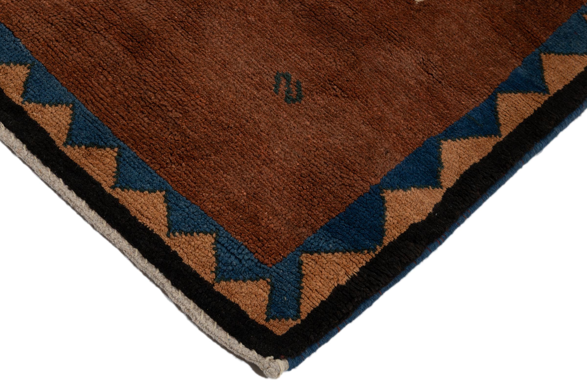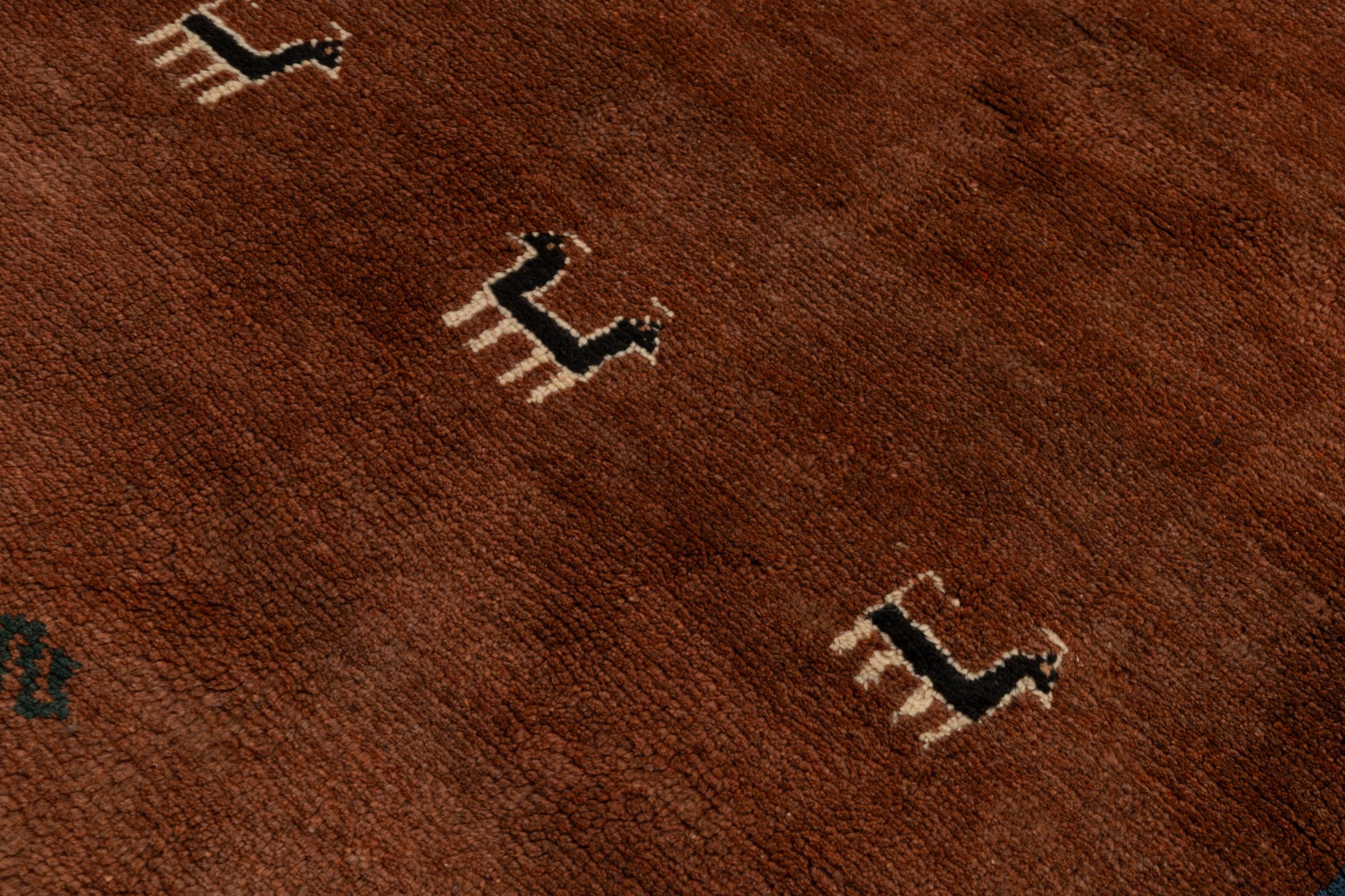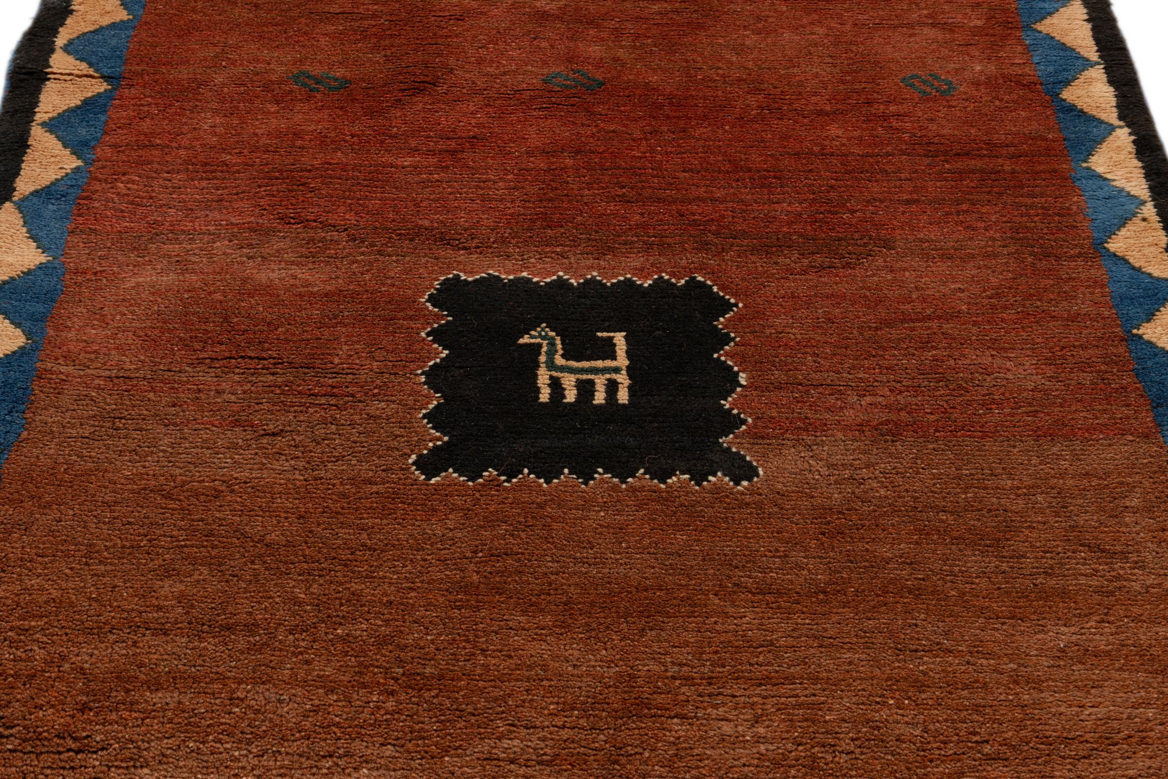 This beautiful rug is a Persian Gabbeh and thus belongs to the highest quality Gabbeh rugs. The rugs are knotted by nomads or semi-nomads in Iran following traditional handicraft. The simple motifs and patterns are mostly inspired by the nomads' close environment. For example camels, trees or bushes can be found on the traditional rugs. Persian Gabbeh rugs are made of wool from locally raised flocks of sheep. The wool is therefore mostly still spun by hand. Thus each of these oriental rugs embodies a unique character of centuries-old culture.