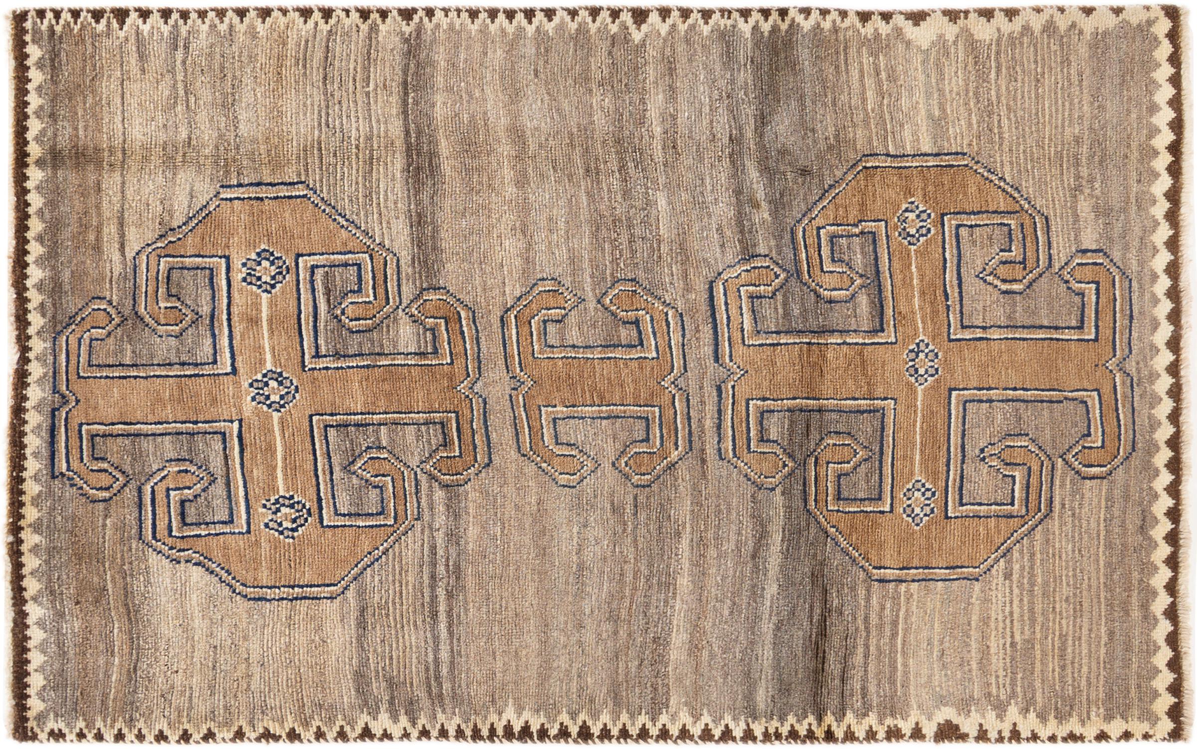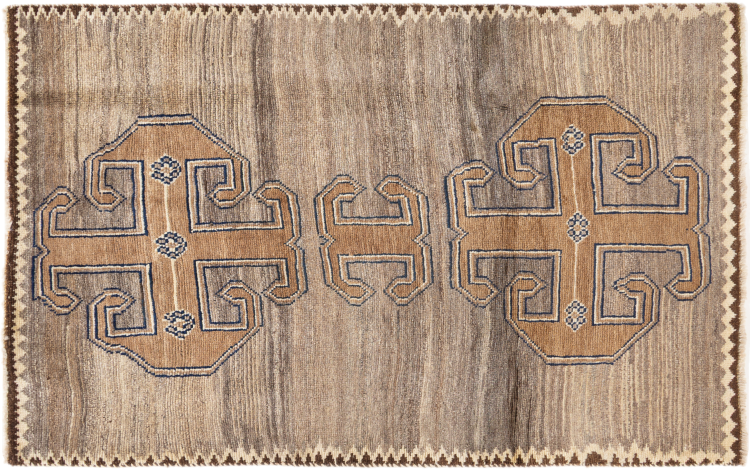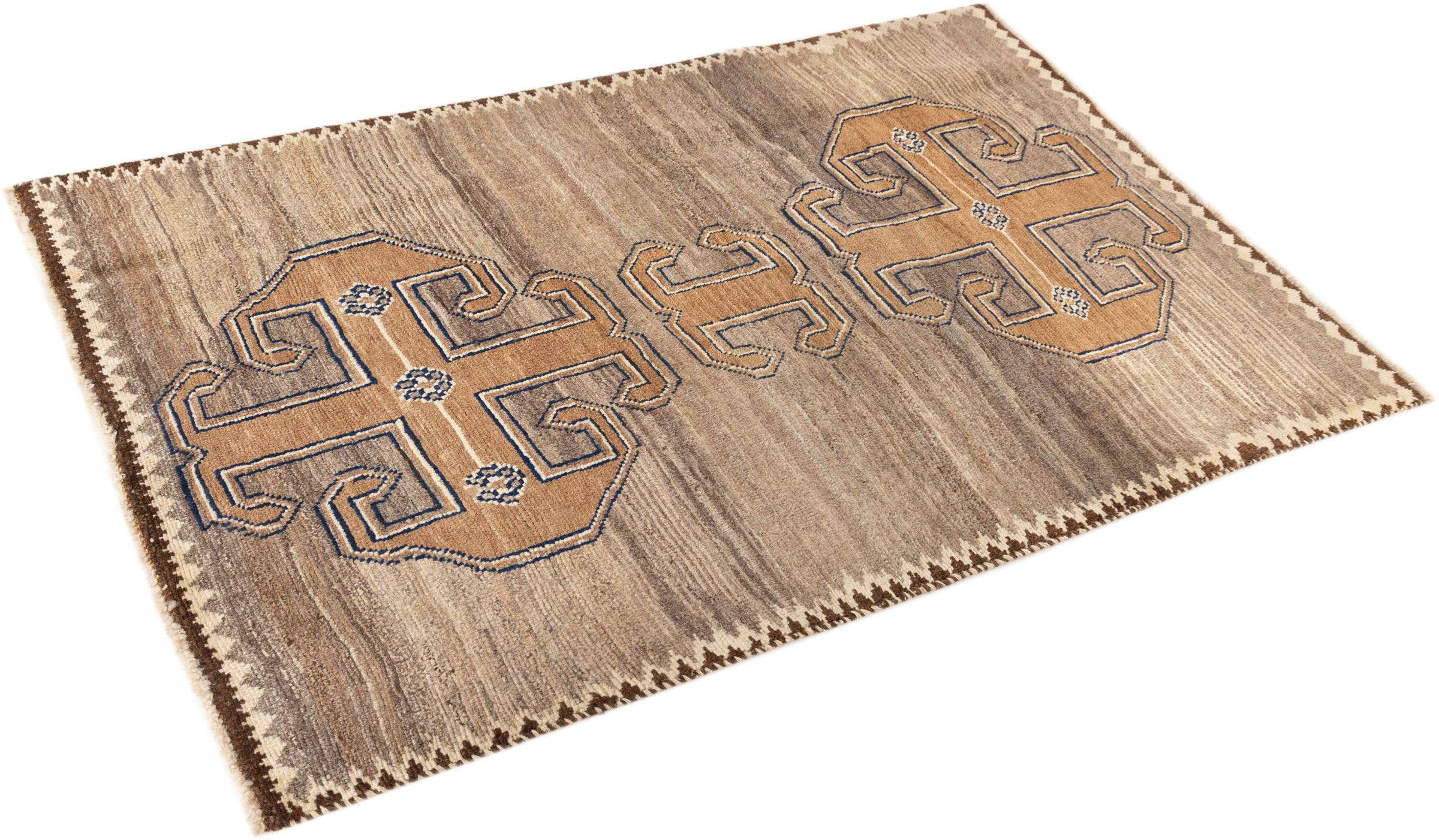 This beautiful rug is a Persian Gabbeh and thus belongs to the highest quality Gabbeh rugs. The rugs are knotted by nomads or semi-nomads in Iran following traditional handicraft. The simple motifs and patterns are mostly inspired by the nomads' close environment. For example camels, trees or bushes can be found on the traditional rugs. Persian Gabbeh rugs are made of wool from locally raised flocks of sheep. The wool is therefore mostly still spun by hand. Thus each of these oriental rugs embodies a unique character of centuries-old culture.