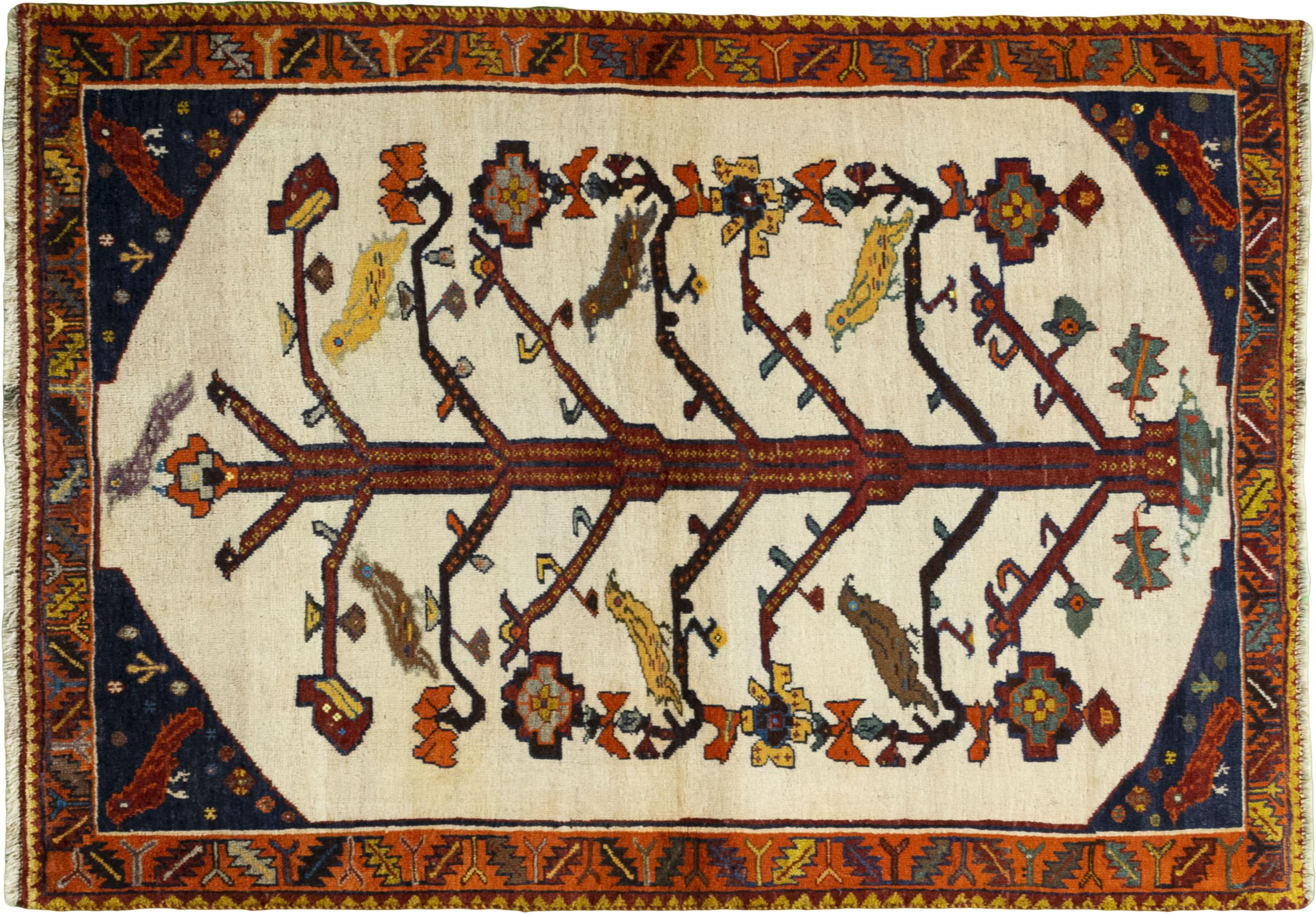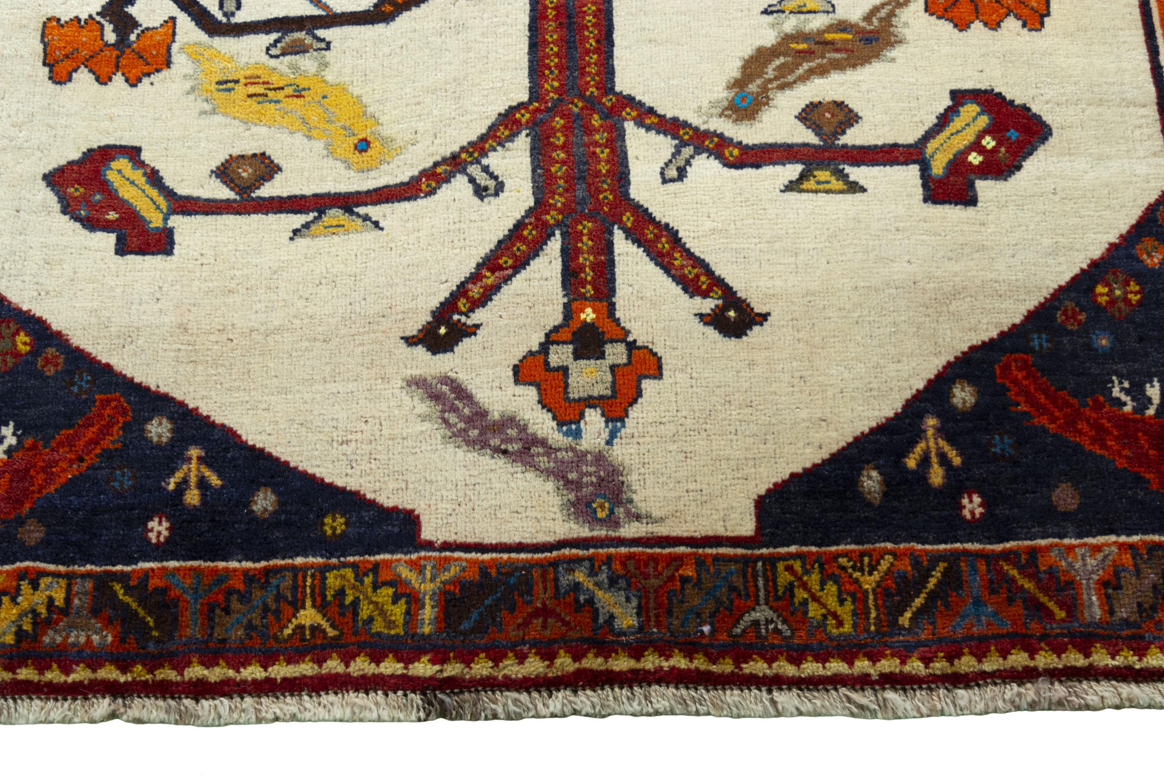 This beautiful rug is a Persian Gabbeh and thus belongs to the highest quality Gabbeh rugs. The rugs are knotted by nomads or semi-nomads in Iran following traditional handicraft. The simple motifs and patterns are mostly inspired by the nomads' close environment. For example camels, trees or bushes can be found on the traditional rugs. Persian Gabbeh rugs are made of wool from locally raised flocks of sheep. The wool is therefore mostly still spun by hand. Thus each of these oriental rugs embodies a unique character of centuries-old culture.