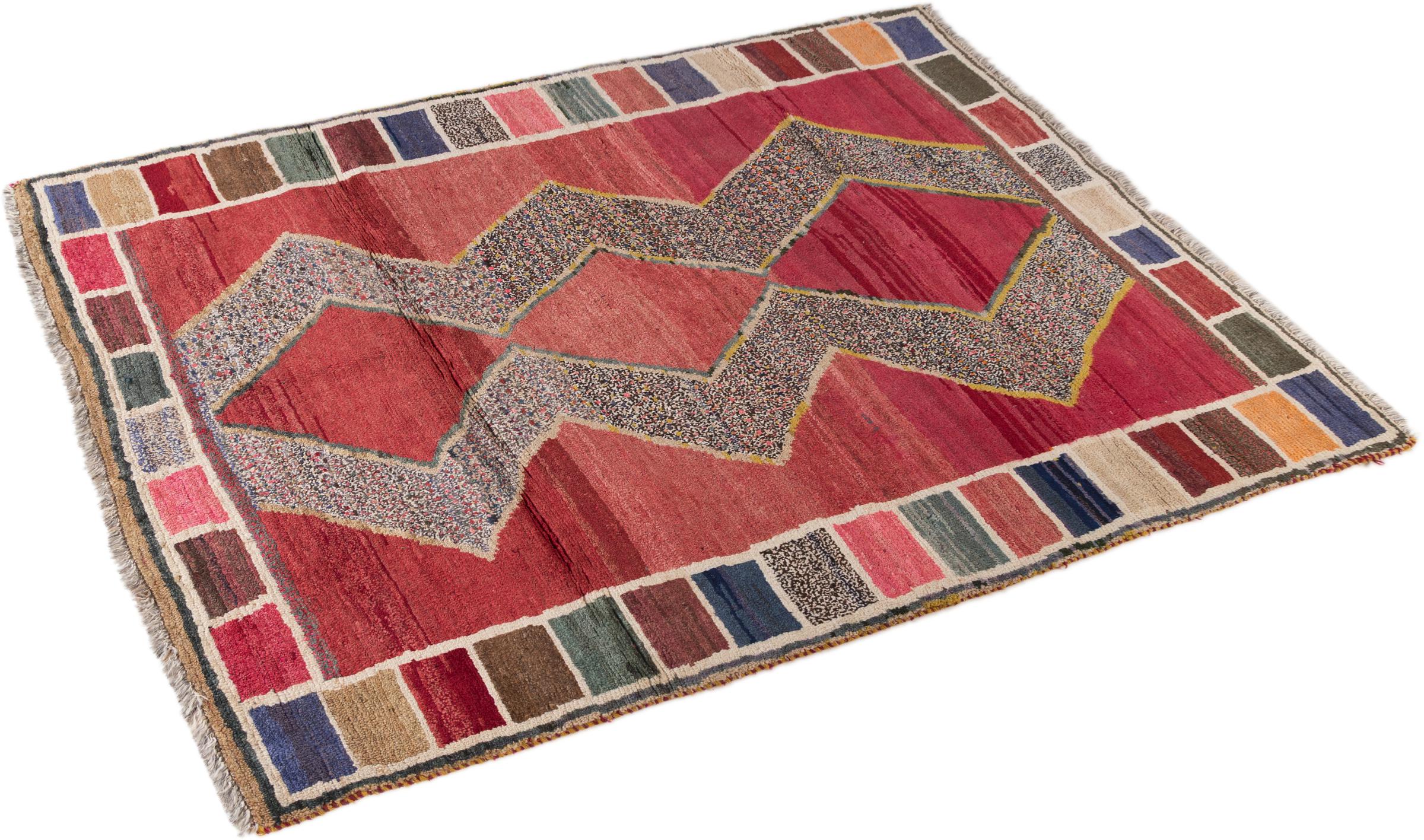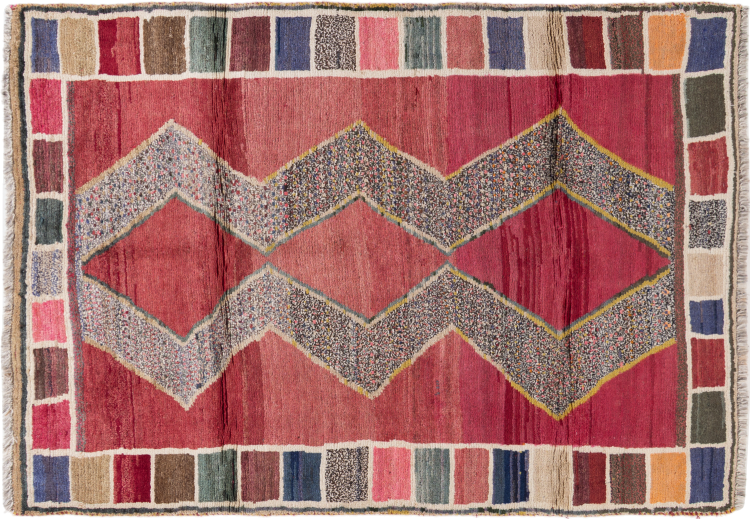 This beautiful rug is a Persian Gabbeh and thus belongs to the highest quality Gabbeh rugs. The rugs are knotted by nomads or semi-nomads in Iran following traditional handicraft. The simple motifs and patterns are mostly inspired by the nomads' close environment. For example camels, trees or bushes can be found on the traditional rugs. Persian Gabbeh rugs are made of wool from locally raised flocks of sheep. The wool is therefore mostly still spun by hand. Thus each of these oriental rugs embodies a unique character of centuries-old culture.