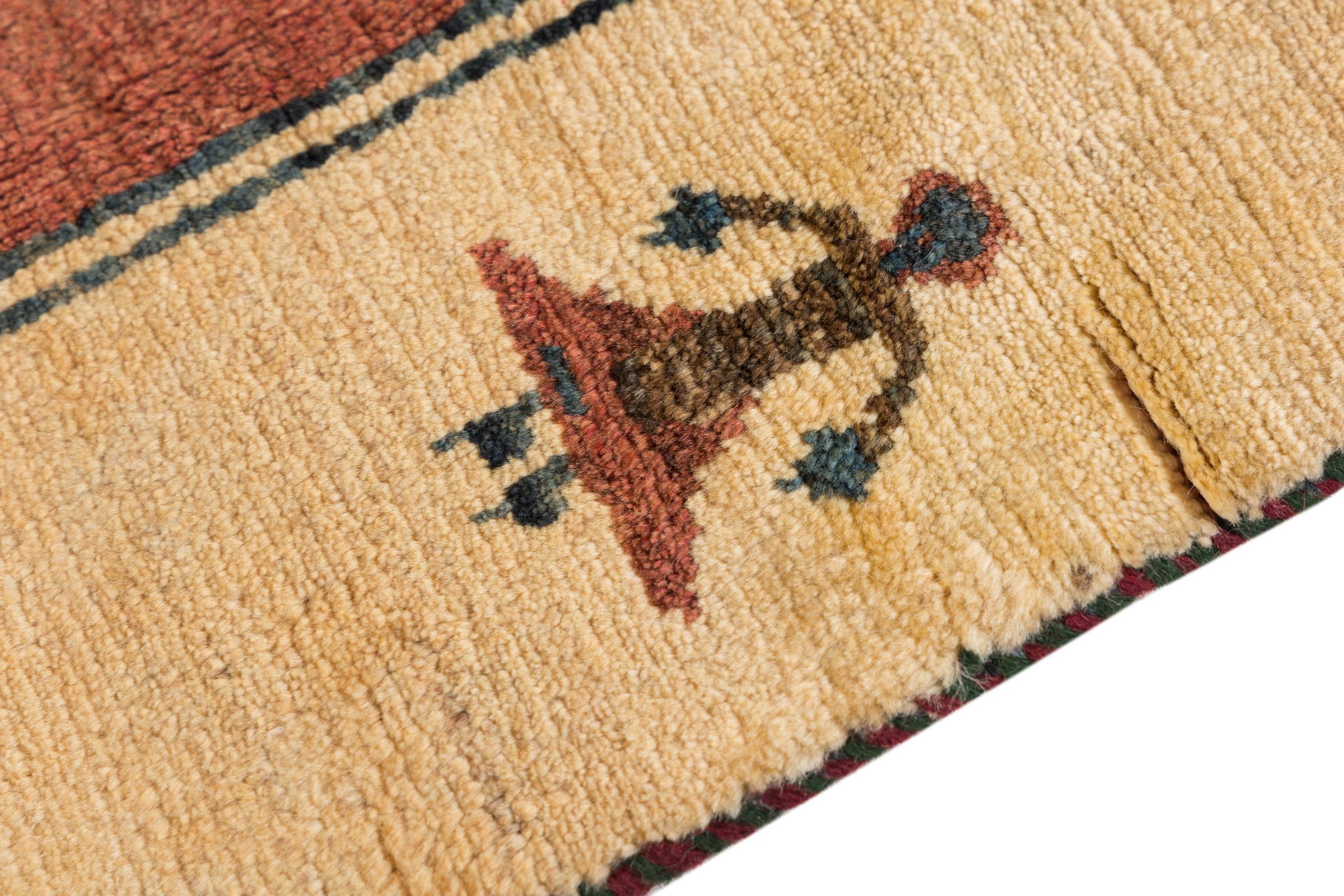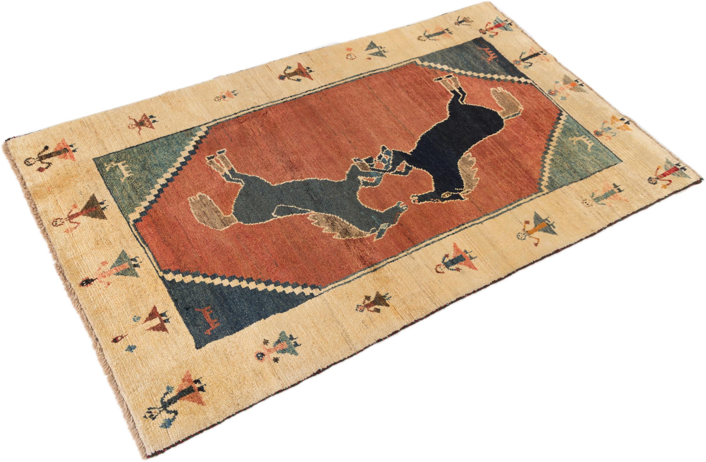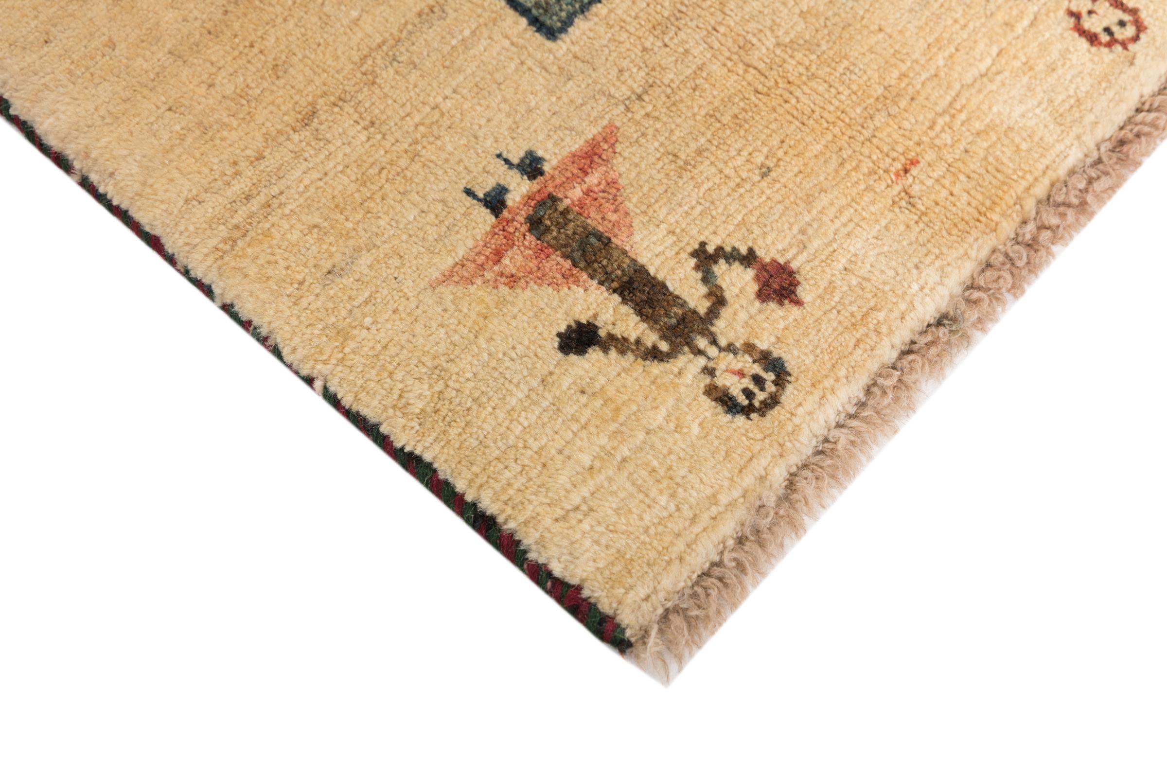 This beautiful rug is a Persian Gabbeh and thus belongs to the highest quality Gabbeh rugs. The rugs are knotted by nomads or semi-nomads in Iran following traditional handicraft. The simple motifs and patterns are mostly inspired by the nomads' close environment. For example camels, trees or bushes can be found on the traditional rugs. Persian Gabbeh rugs are made of wool from locally raised flocks of sheep. The wool is therefore mostly still spun by hand. Thus each of these oriental rugs embodies a unique character of centuries-old culture.