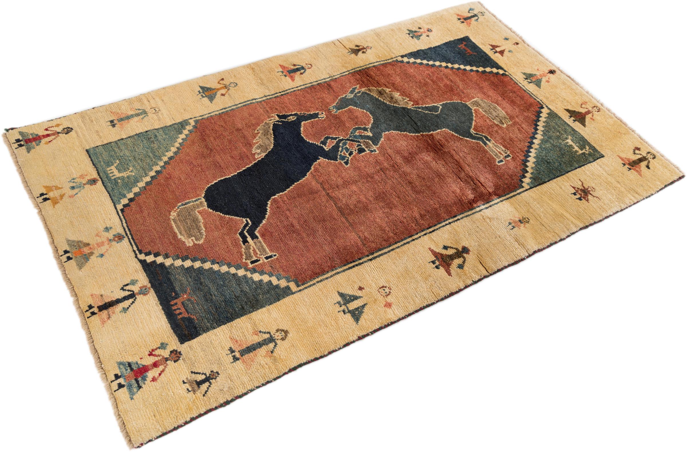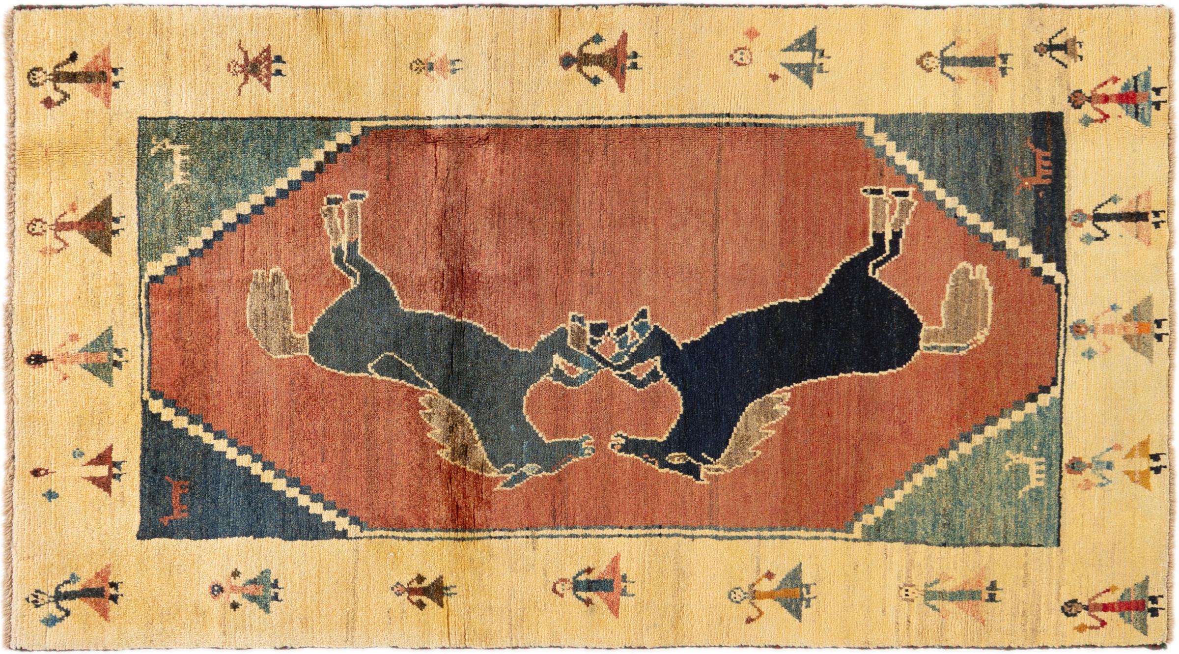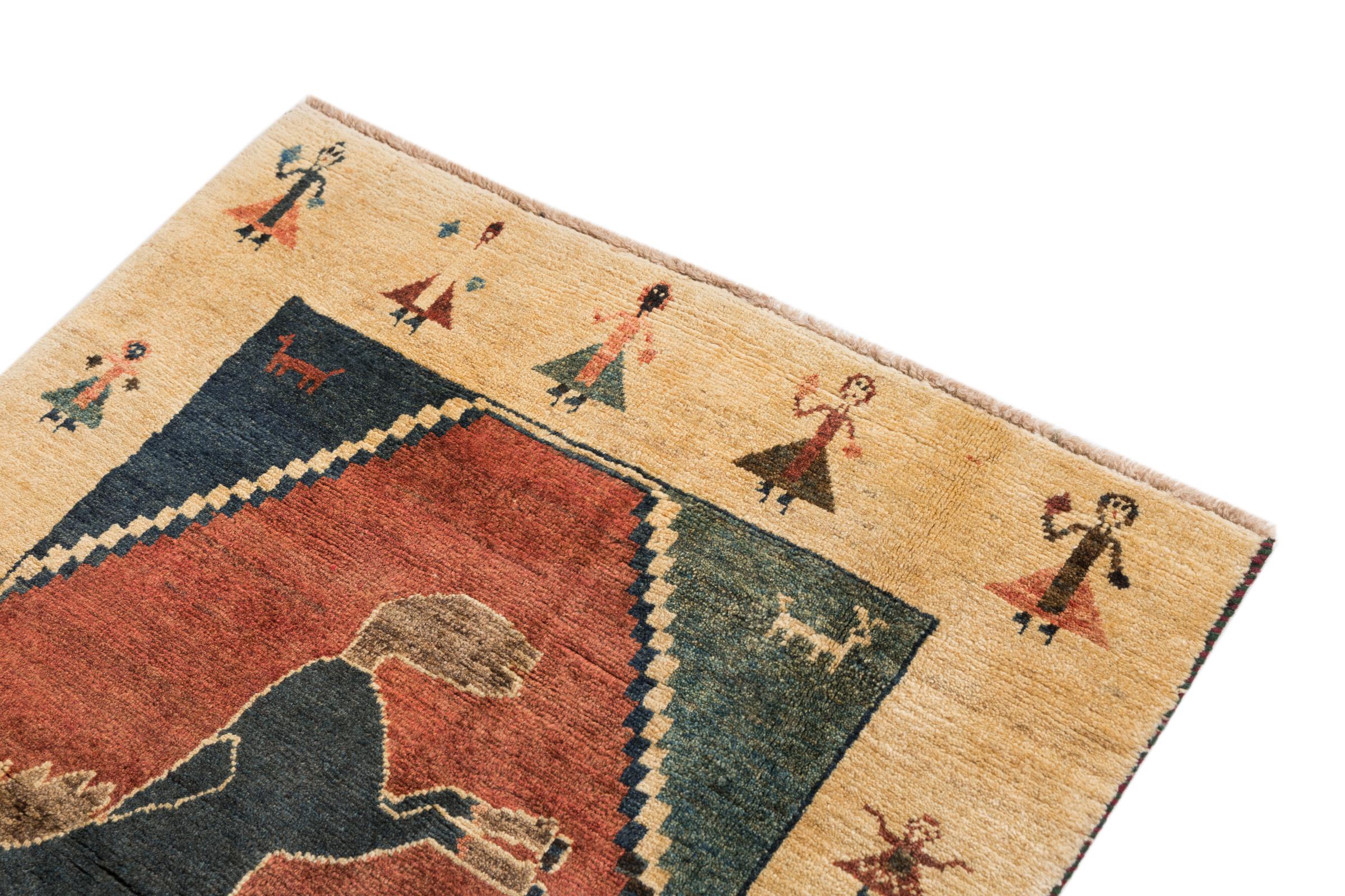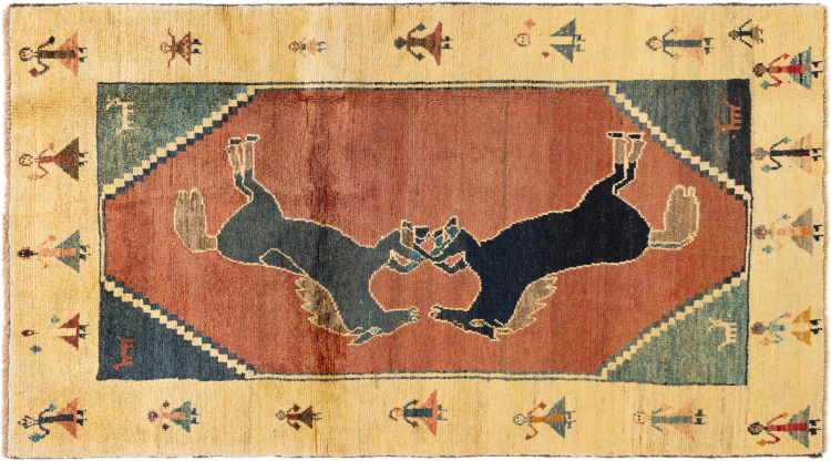 This beautiful rug is a Persian Gabbeh and thus belongs to the highest quality Gabbeh rugs. The rugs are knotted by nomads or semi-nomads in Iran following traditional handicraft. The simple motifs and patterns are mostly inspired by the nomads' close environment. For example camels, trees or bushes can be found on the traditional rugs. Persian Gabbeh rugs are made of wool from locally raised flocks of sheep. The wool is therefore mostly still spun by hand. Thus each of these oriental rugs embodies a unique character of centuries-old culture.