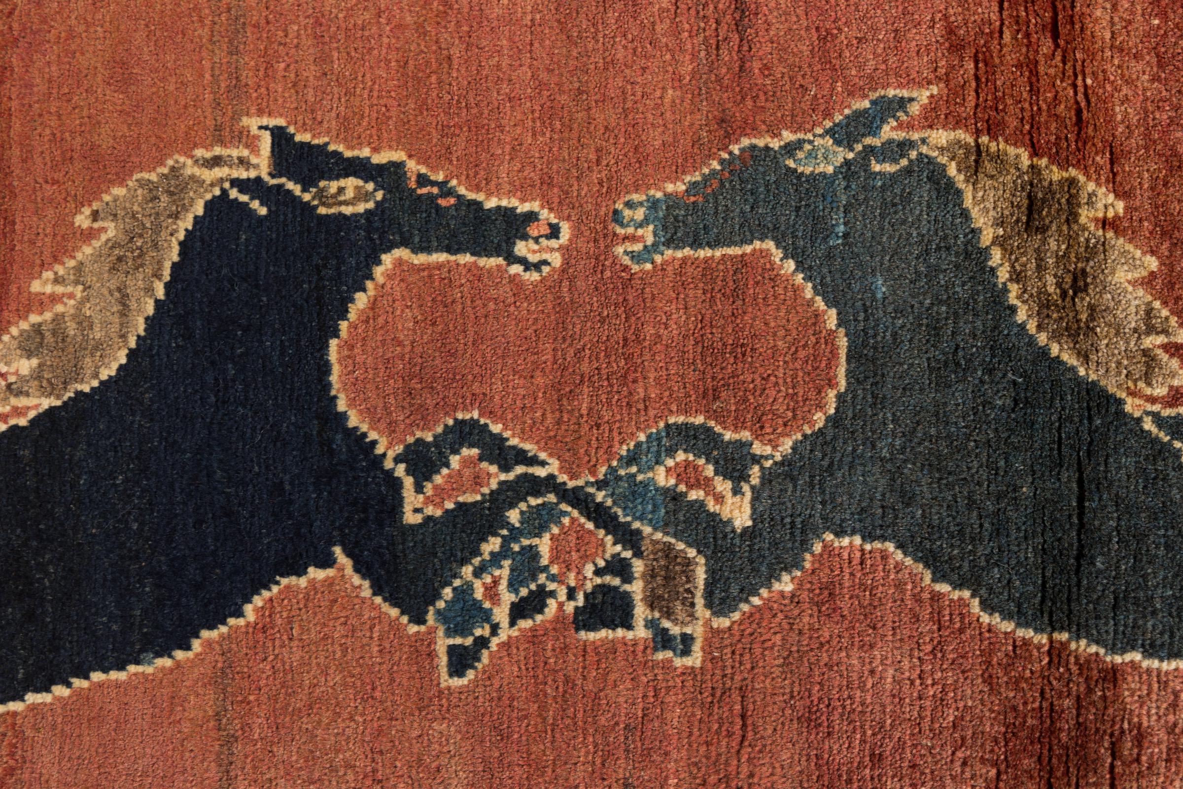 Carpet ID: 295637008540 Size: 190x102 cm Thickness: ap. 15 mm Knot density: 72 000 - 90 000 / m² Manufacturing: Knotted by hand Pile: Handspun wool Warp: Sheep wool Origin: Persia Age: Old/Semi antique, over 50 years Weight: ap. 8 kg Also know as Gabbe, Ghabbeh In stock: Unique - Only 1 in stock