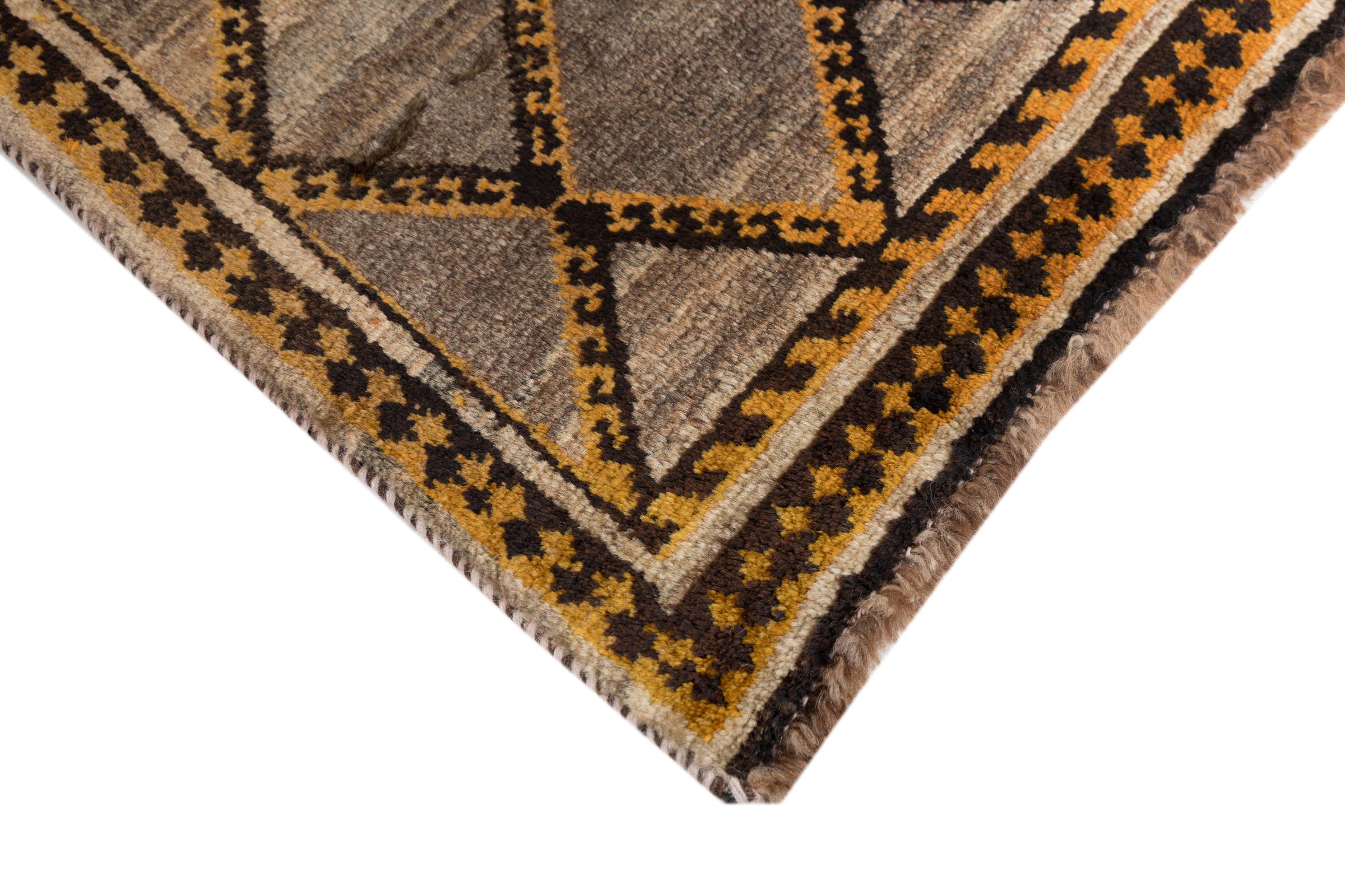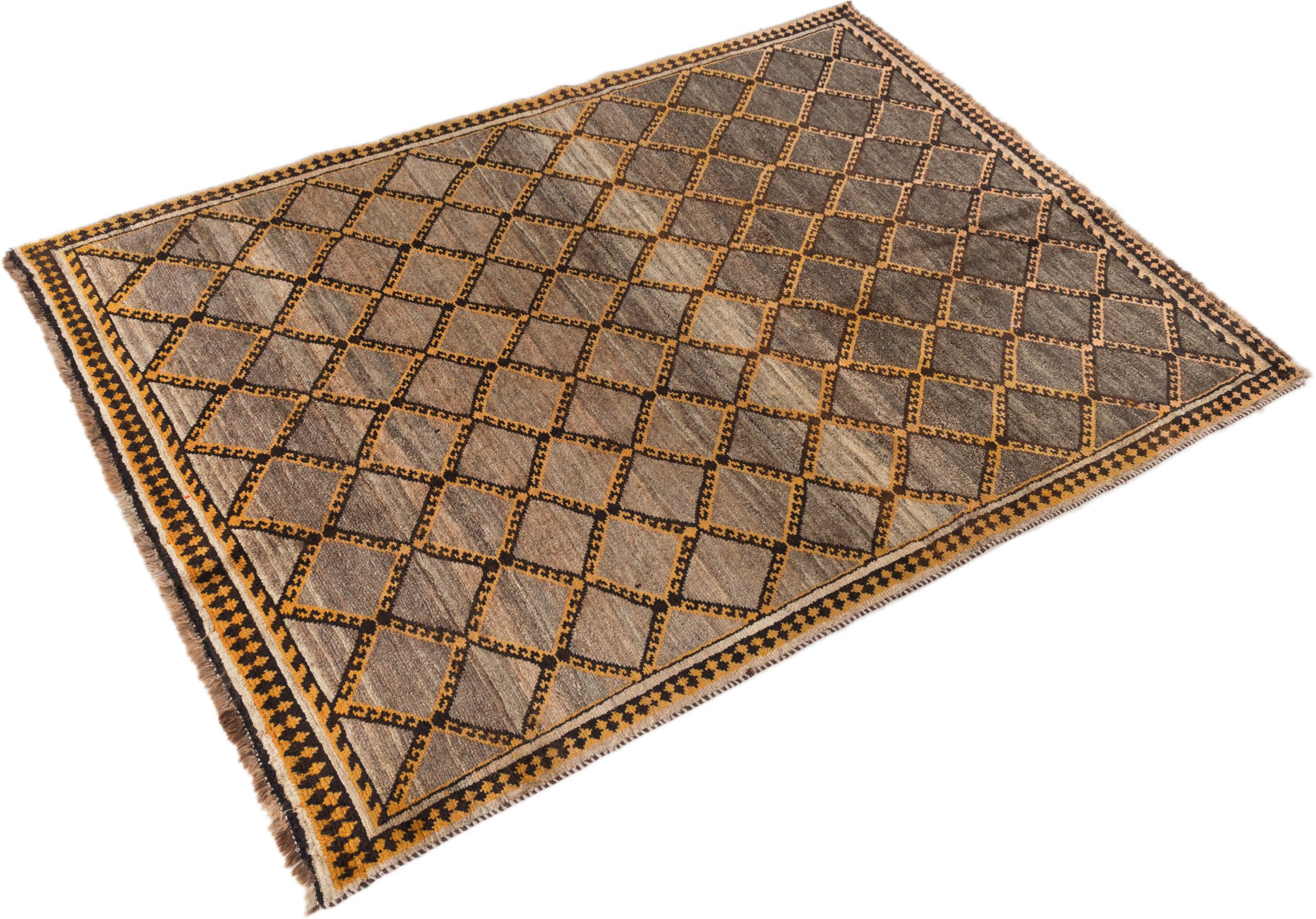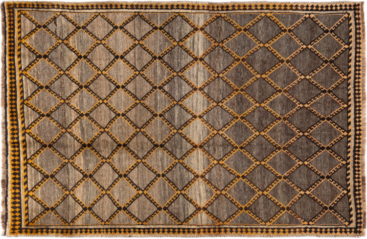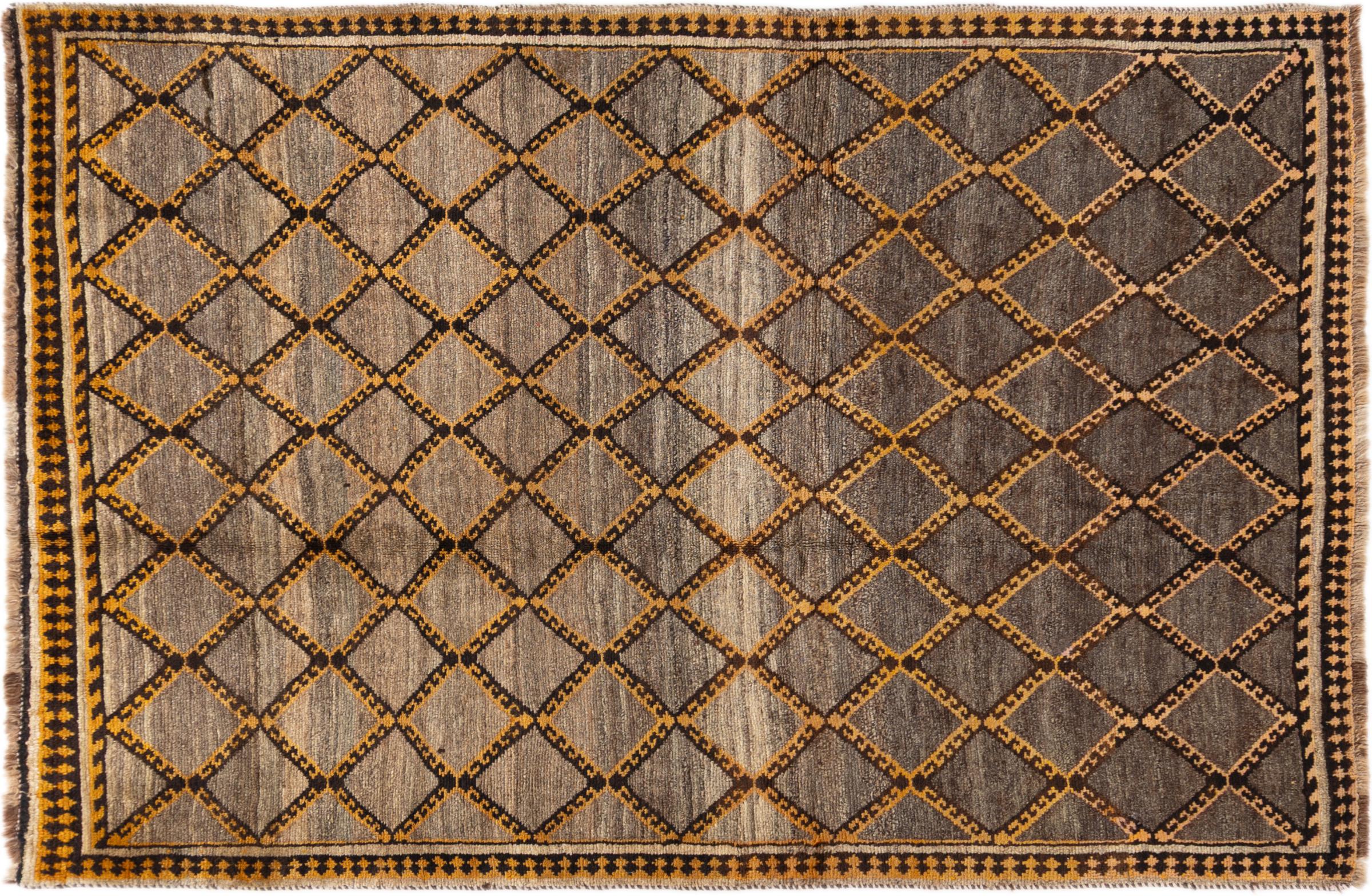 This beautiful rug is a Persian Gabbeh and thus belongs to the highest quality Gabbeh rugs. The rugs are knotted by nomads or semi-nomads in Iran following traditional handicraft. The simple motifs and patterns are mostly inspired by the nomads' close environment. For example camels, trees or bushes can be found on the traditional rugs. Persian Gabbeh rugs are made of wool from locally raised flocks of sheep. The wool is therefore mostly still spun by hand. Thus each of these oriental rugs embodies a unique character of centuries-old culture.