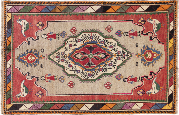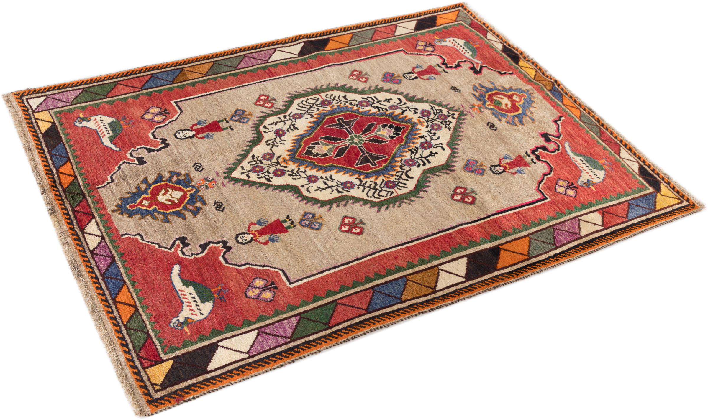 This beautiful rug is a Persian Gabbeh and thus belongs to the highest quality Gabbeh rugs. The rugs are knotted by nomads or semi-nomads in Iran following traditional handicraft. The simple motifs and patterns are mostly inspired by the nomads' close environment. For example camels, trees or bushes can be found on the traditional rugs. Persian Gabbeh rugs are made of wool from locally raised flocks of sheep. The wool is therefore mostly still spun by hand. Thus each of these oriental rugs embodies a unique character of centuries-old culture.