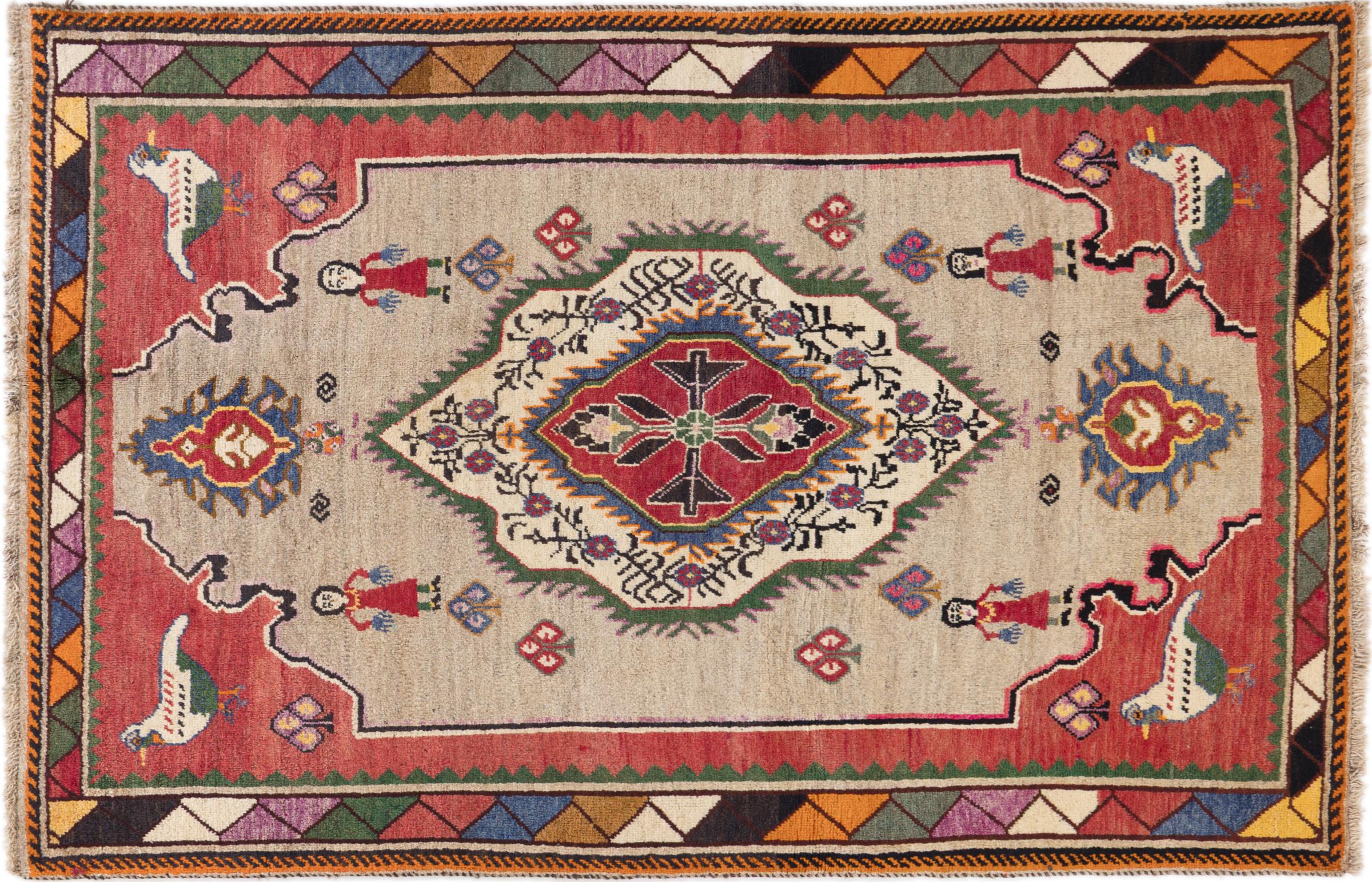 Carpet ID: 296301002657 Size: 198x128 cm Thickness: ap. 15 mm Knot density: 72 000 - 90 000 / m² Manufacturing: Knotted by hand Pile: Handspun wool Warp: Sheep wool Origin: Persia Age: Old/Semi antique, over 50 years Weight: ap. 10 kg Also know as Gabbe, Ghabbeh In stock: Unique - Only 1 in stock
