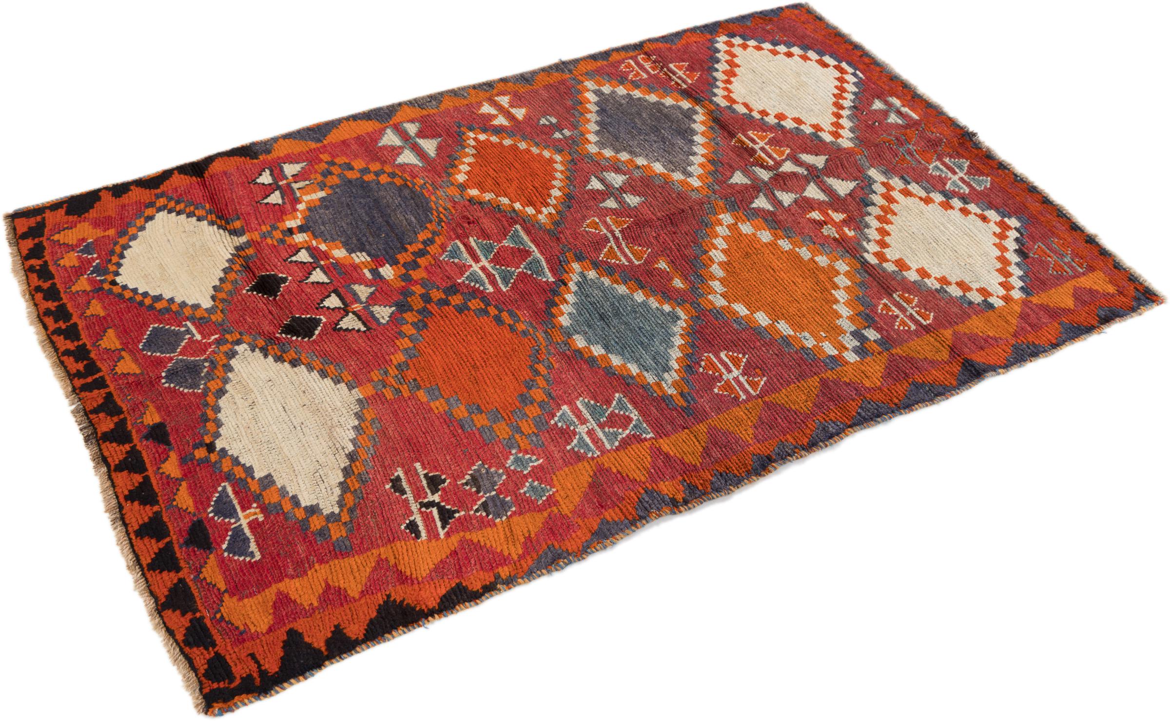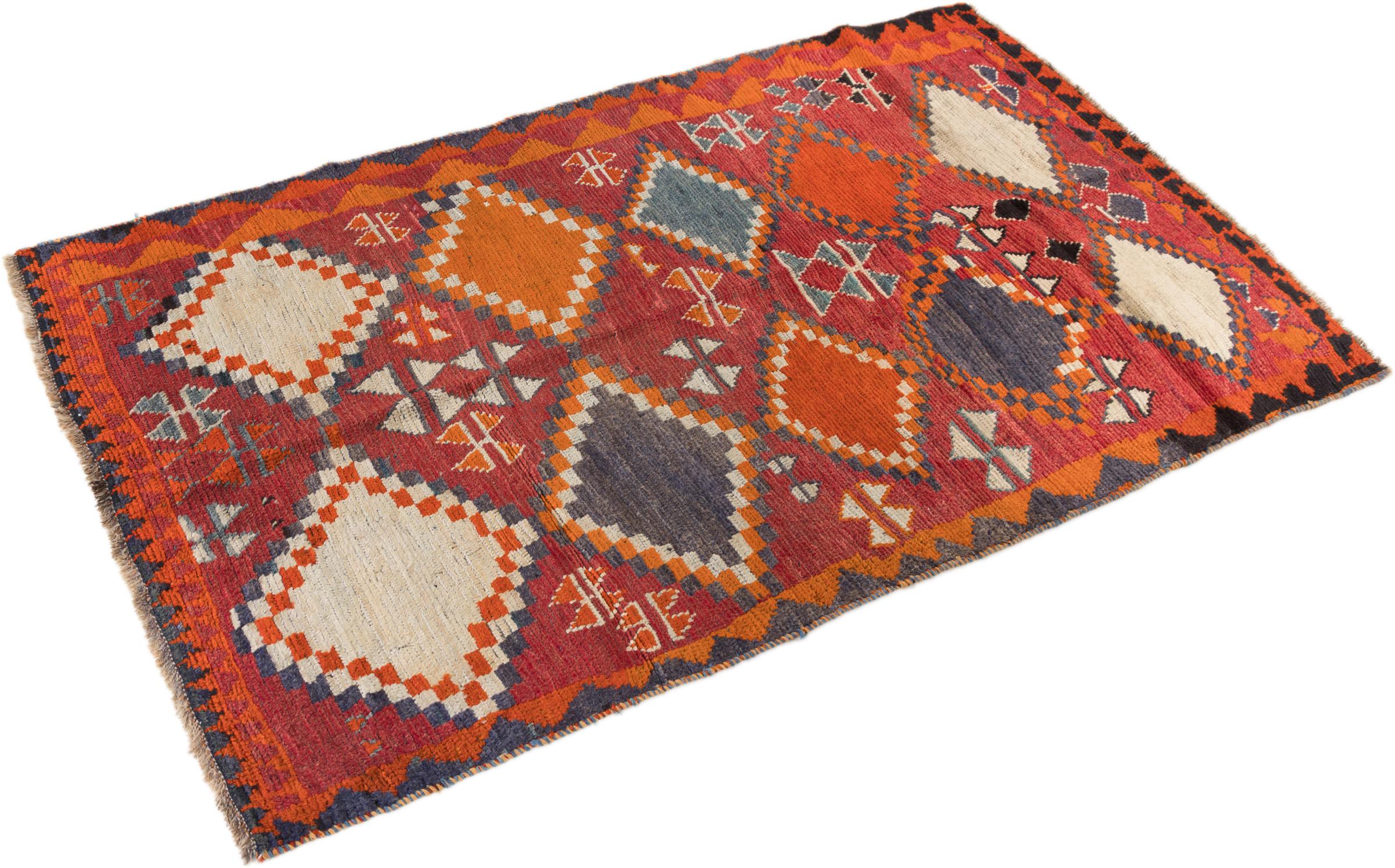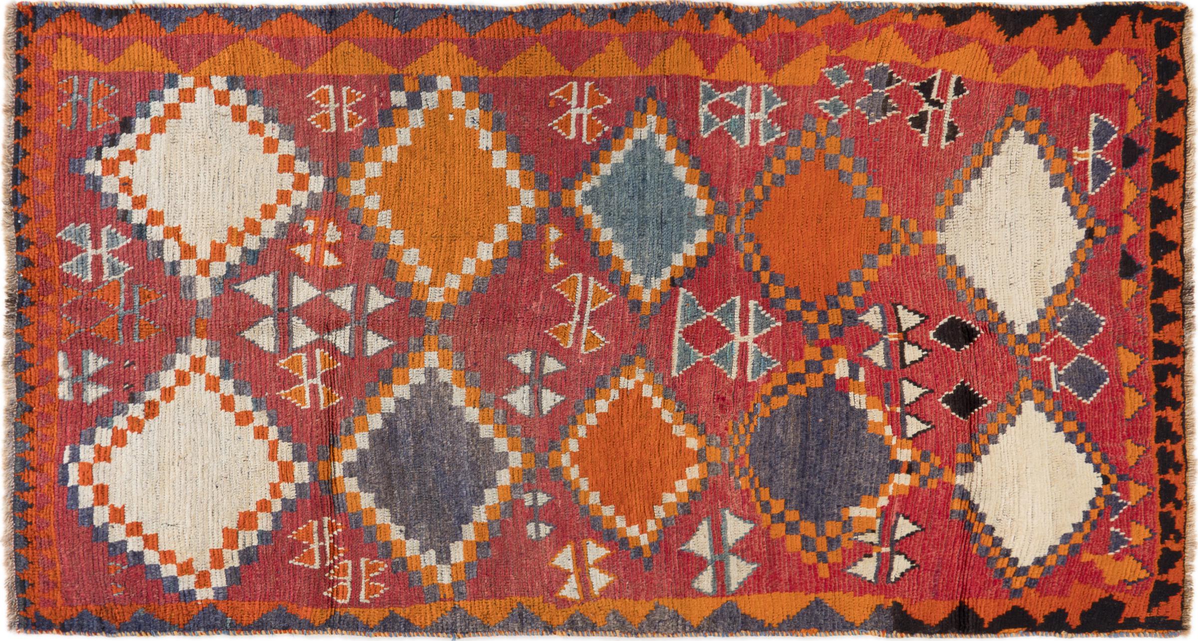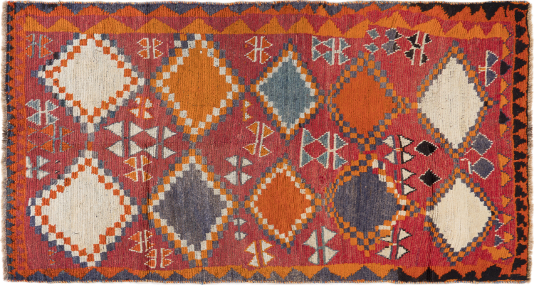 Carpet ID: 296298004668 Size: 204x110 cm Thickness: ap. 15 mm Knot density: 200 000 - 250 000 / m² Manufacturing: Knotted by hand Pile: Handspun wool Warp: Sheep wool Origin: Persia Age: Old/Semi antique, over 50 years Weight: ap. 9 kg Also know as Gabbe, Ghabbeh In stock: Unique - Only 1 in stock