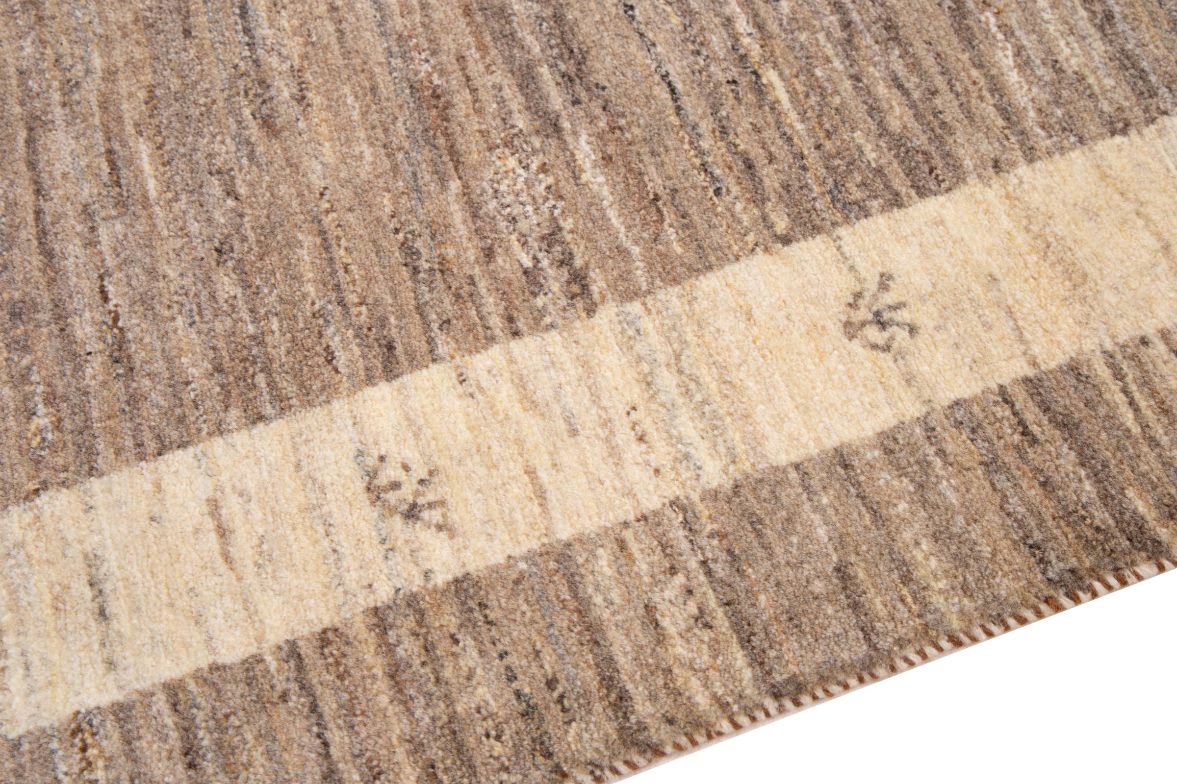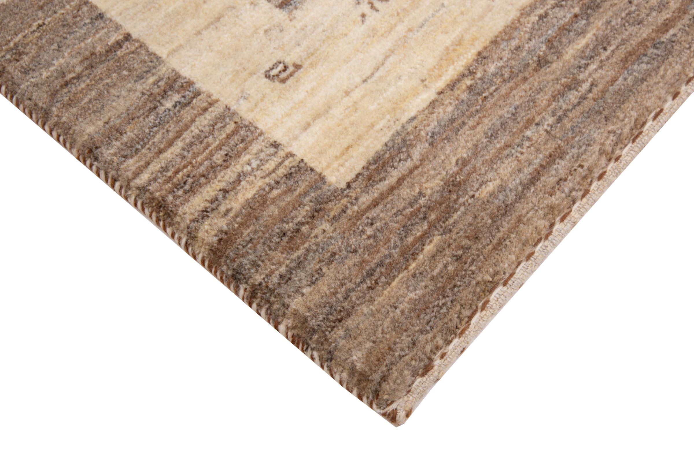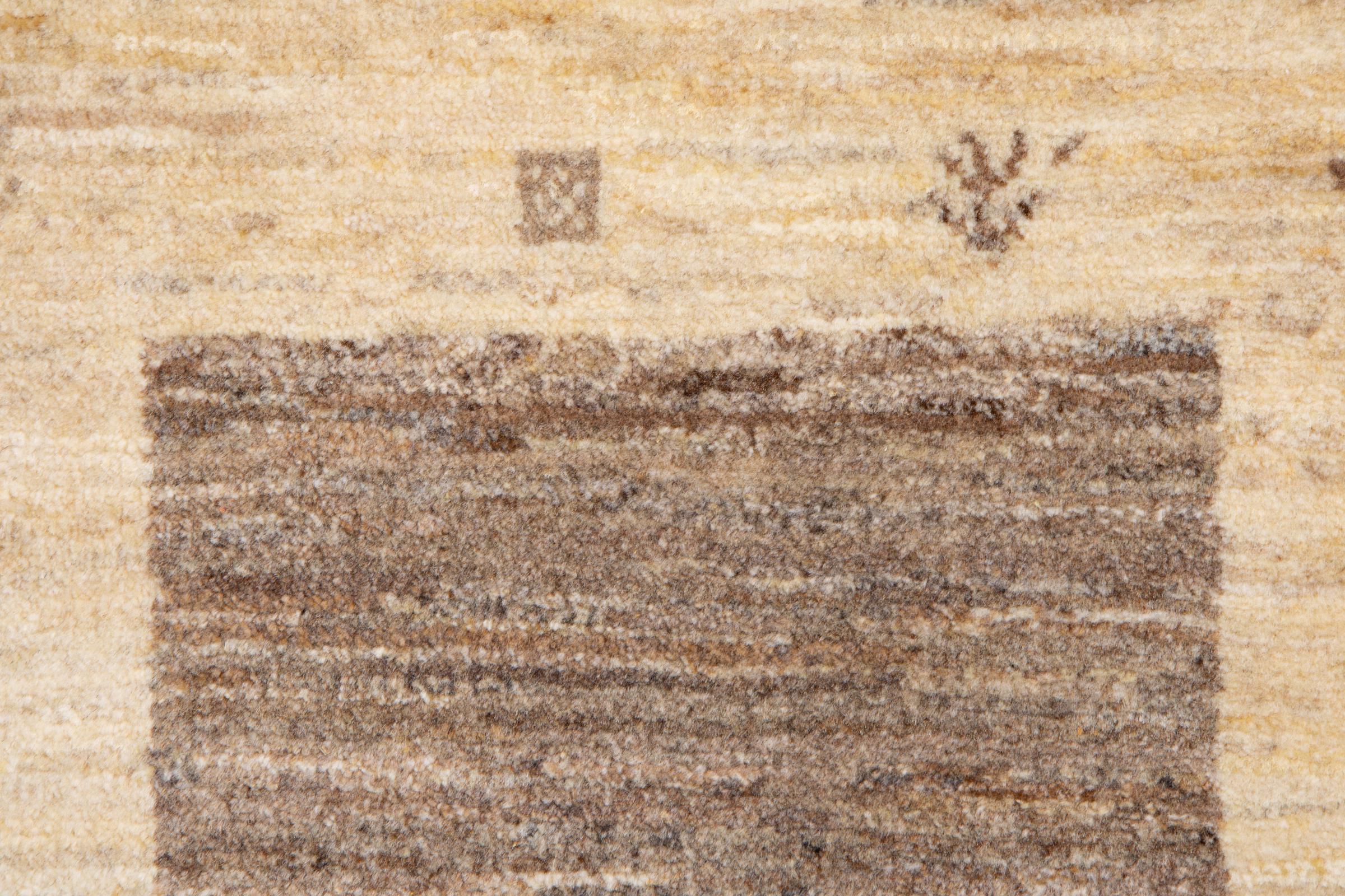 This beautiful rug is a Persian Gabbeh and thus belongs to the highest quality Gabbeh rugs. The rugs are knotted by nomads or semi-nomads in Iran following traditional handicraft. The simple motifs and patterns are mostly inspired by the nomads' close environment. For example camels, trees or bushes can be found on the traditional rugs. Persian Gabbeh rugs are made of wool from locally raised flocks of sheep. The wool is therefore mostly still spun by hand. Thus each of these oriental rugs embodies a unique character of centuries-old culture.