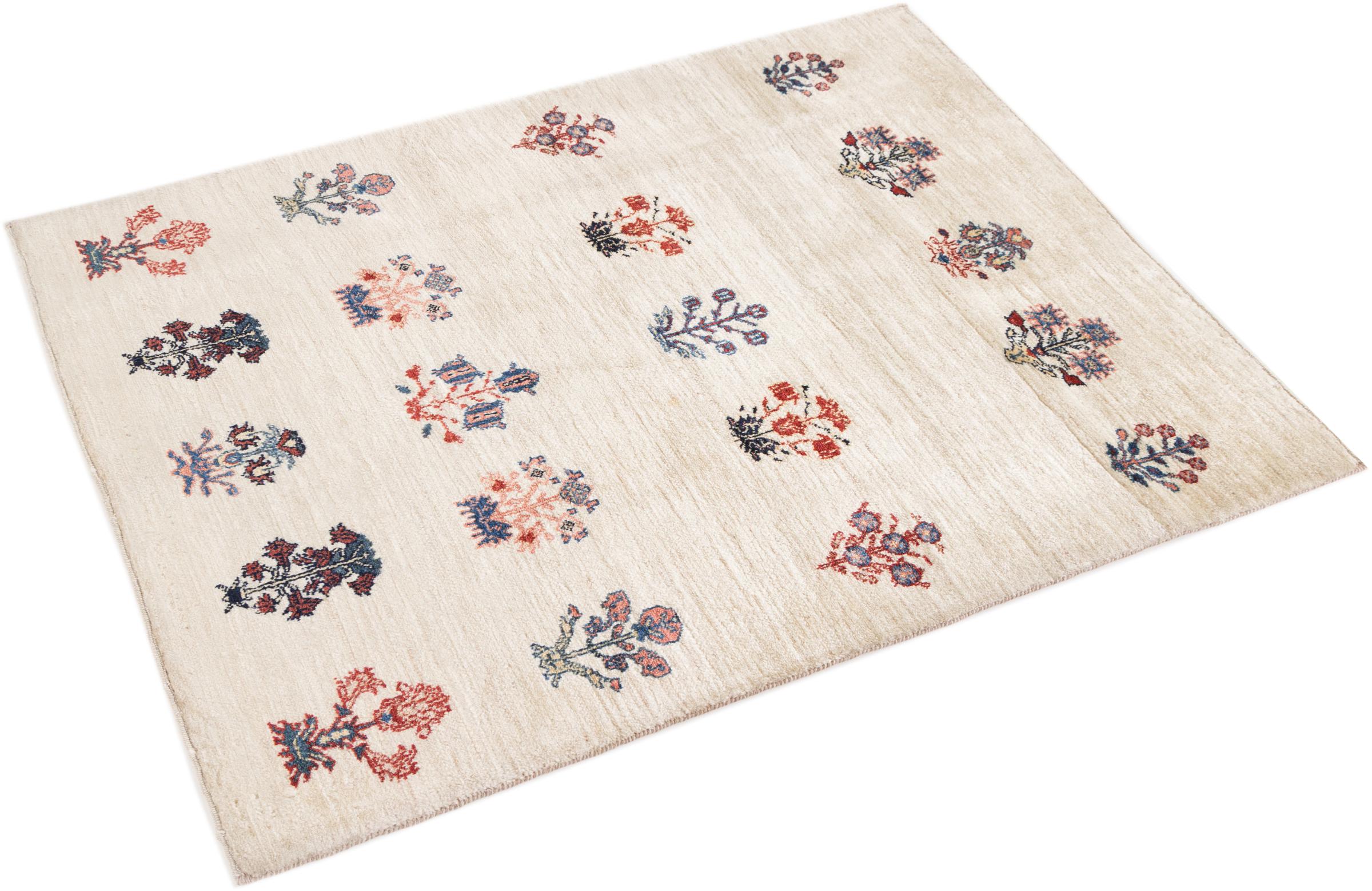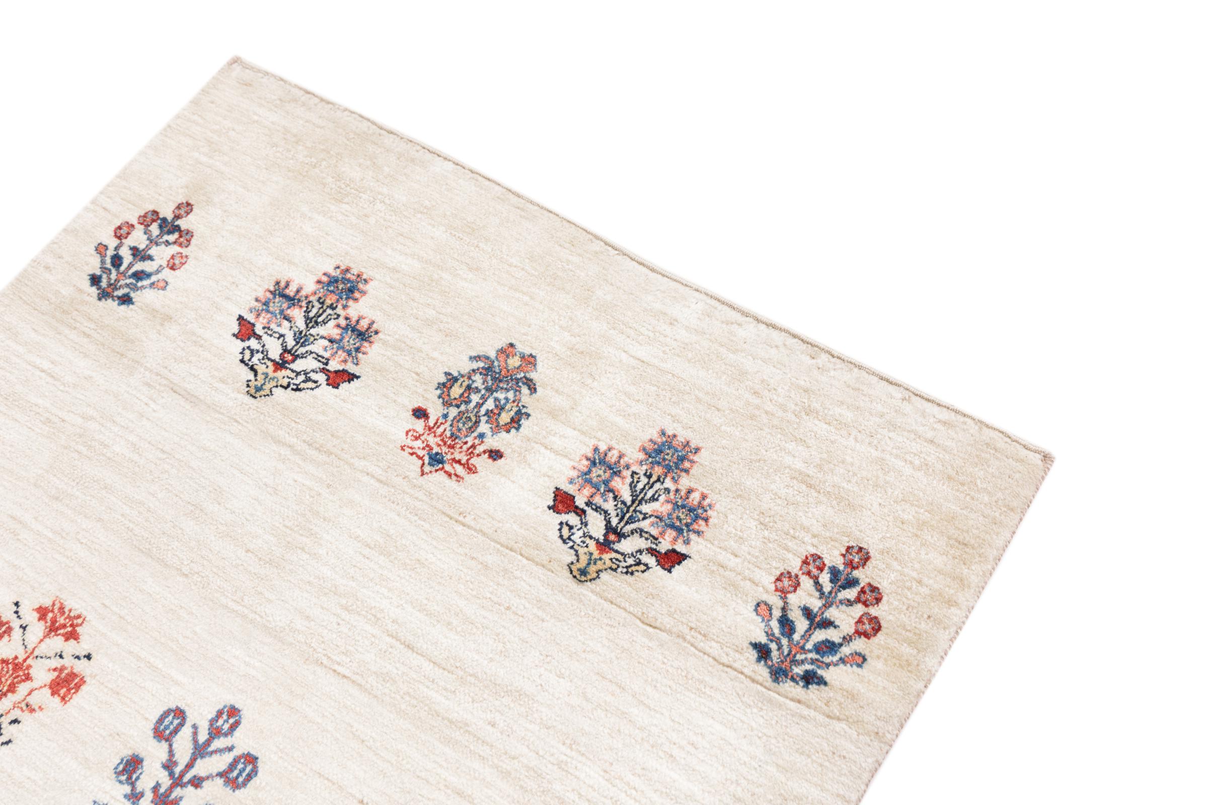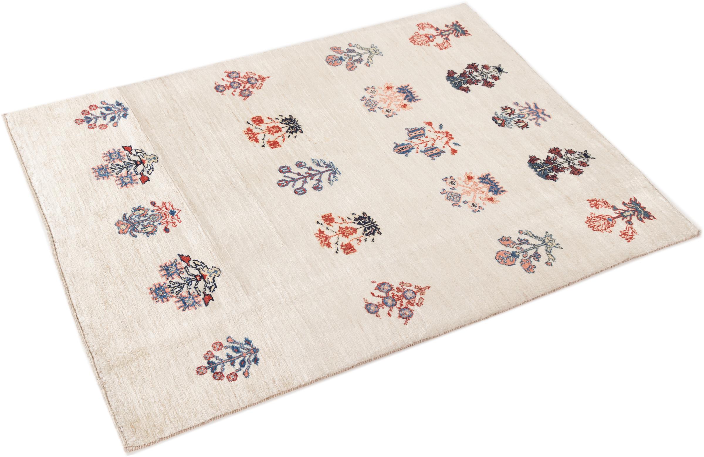This beautiful rug is a Persian Gabbeh and thus belongs to the highest quality Gabbeh rugs. The rugs are knotted by nomads or semi-nomads in Iran following traditional handicraft. The simple motifs and patterns are mostly inspired by the nomads' close environment. For example camels, trees or bushes can be found on the traditional rugs. Persian Gabbeh rugs are made of wool from locally raised flocks of sheep. The wool is therefore mostly still spun by hand. Thus each of these oriental rugs embodies a unique character of centuries-old culture.