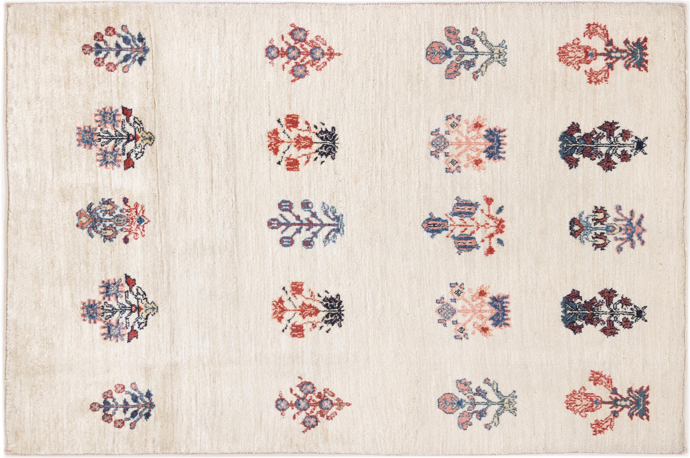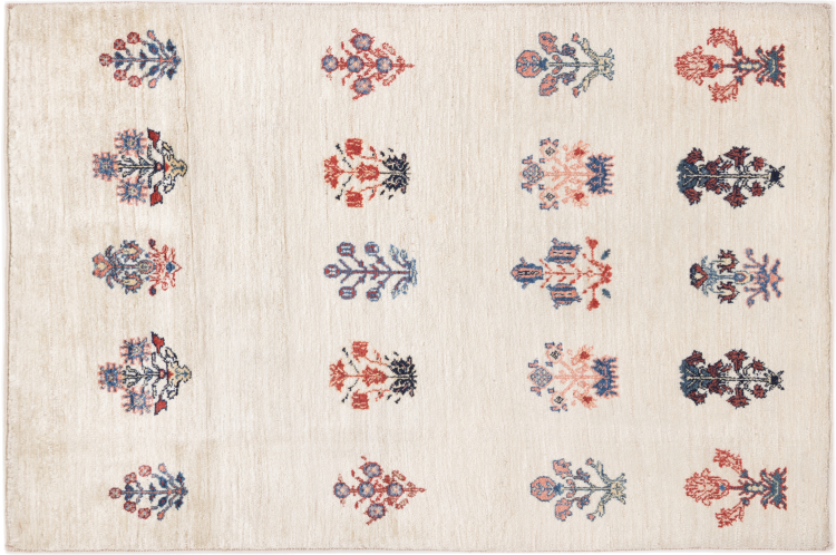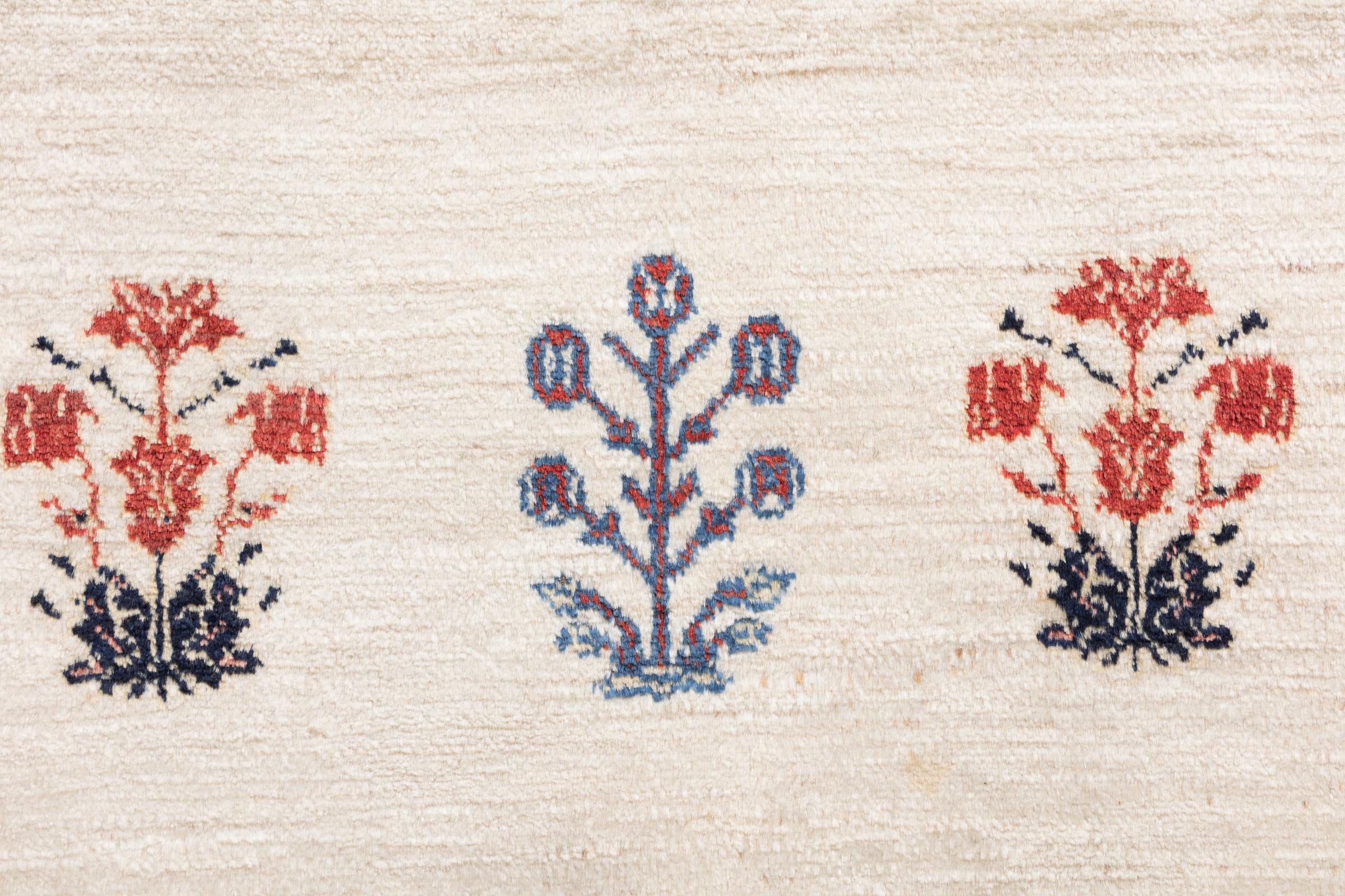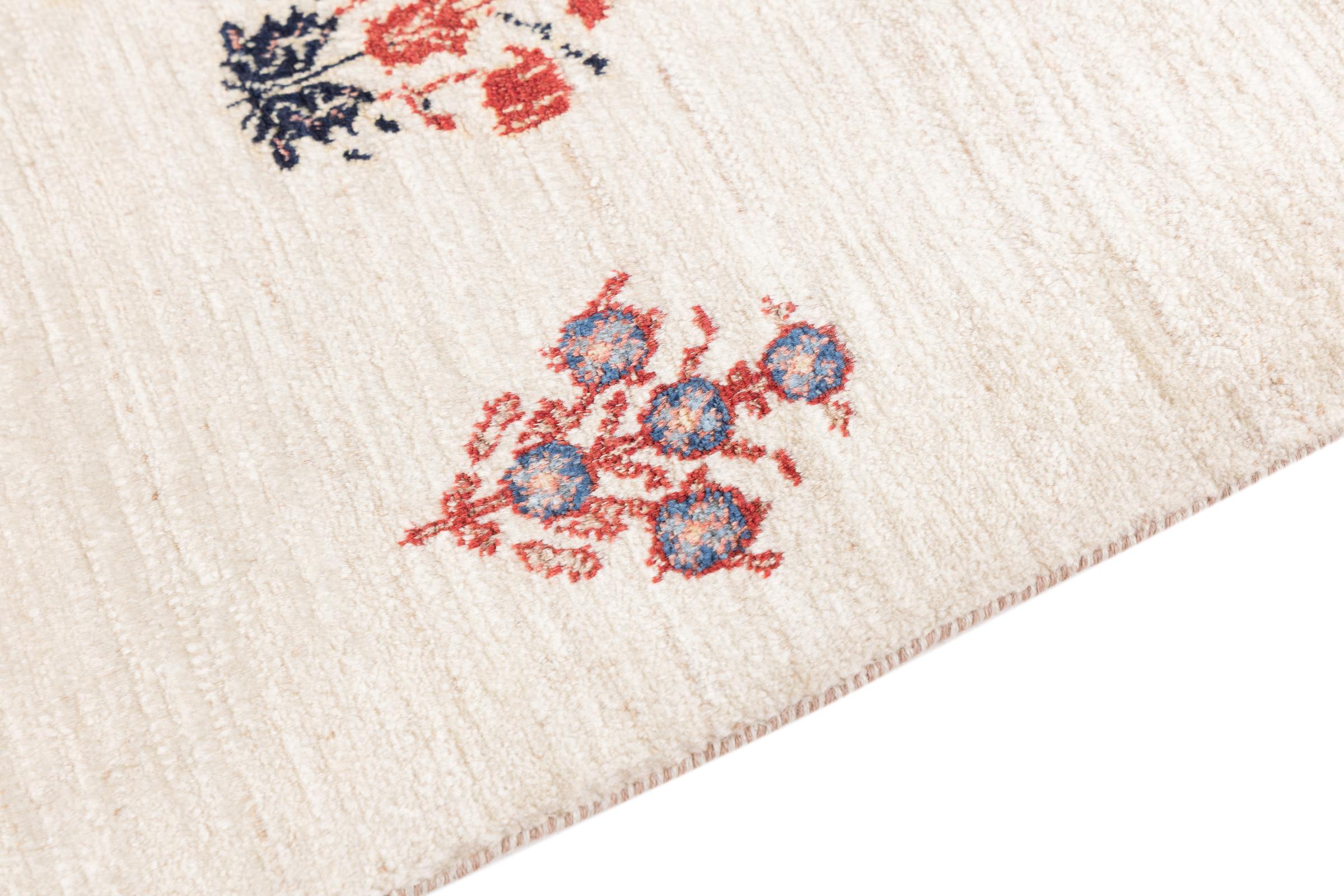 This beautiful rug is a Persian Gabbeh and thus belongs to the highest quality Gabbeh rugs. The rugs are knotted by nomads or semi-nomads in Iran following traditional handicraft. The simple motifs and patterns are mostly inspired by the nomads' close environment. For example camels, trees or bushes can be found on the traditional rugs. Persian Gabbeh rugs are made of wool from locally raised flocks of sheep. The wool is therefore mostly still spun by hand. Thus each of these oriental rugs embodies a unique character of centuries-old culture.