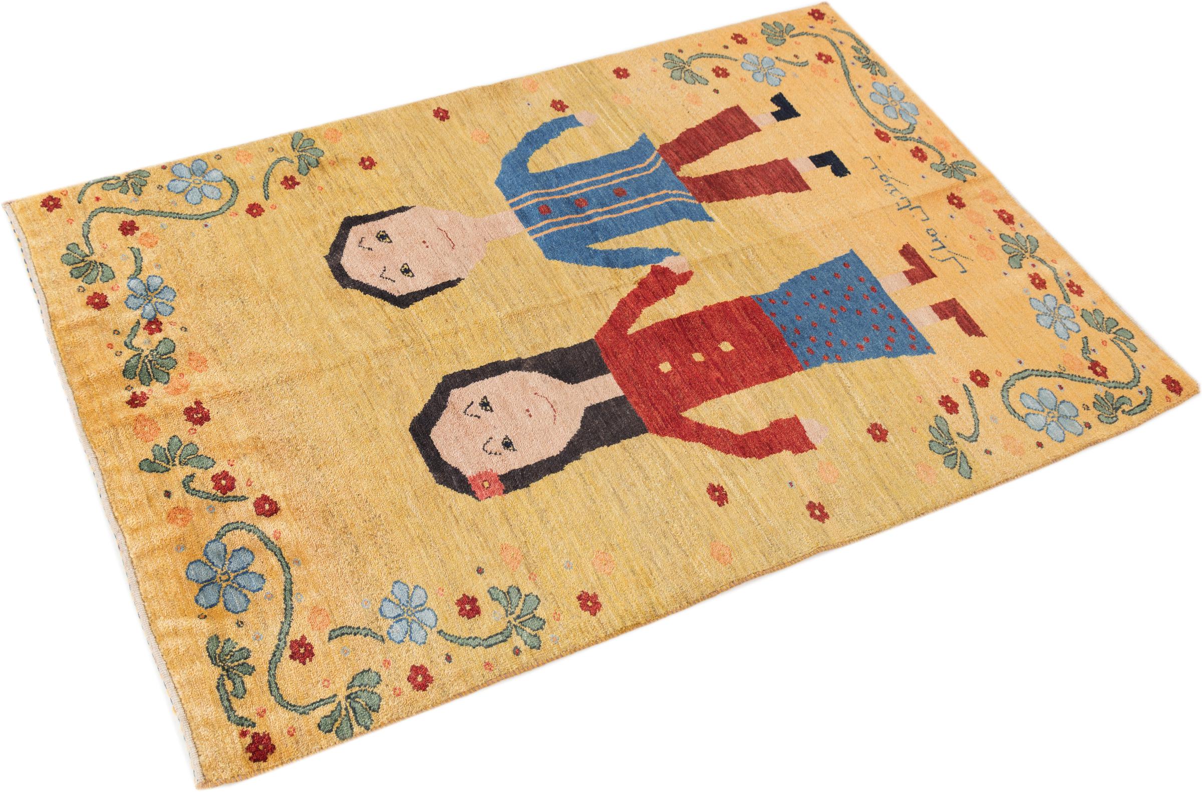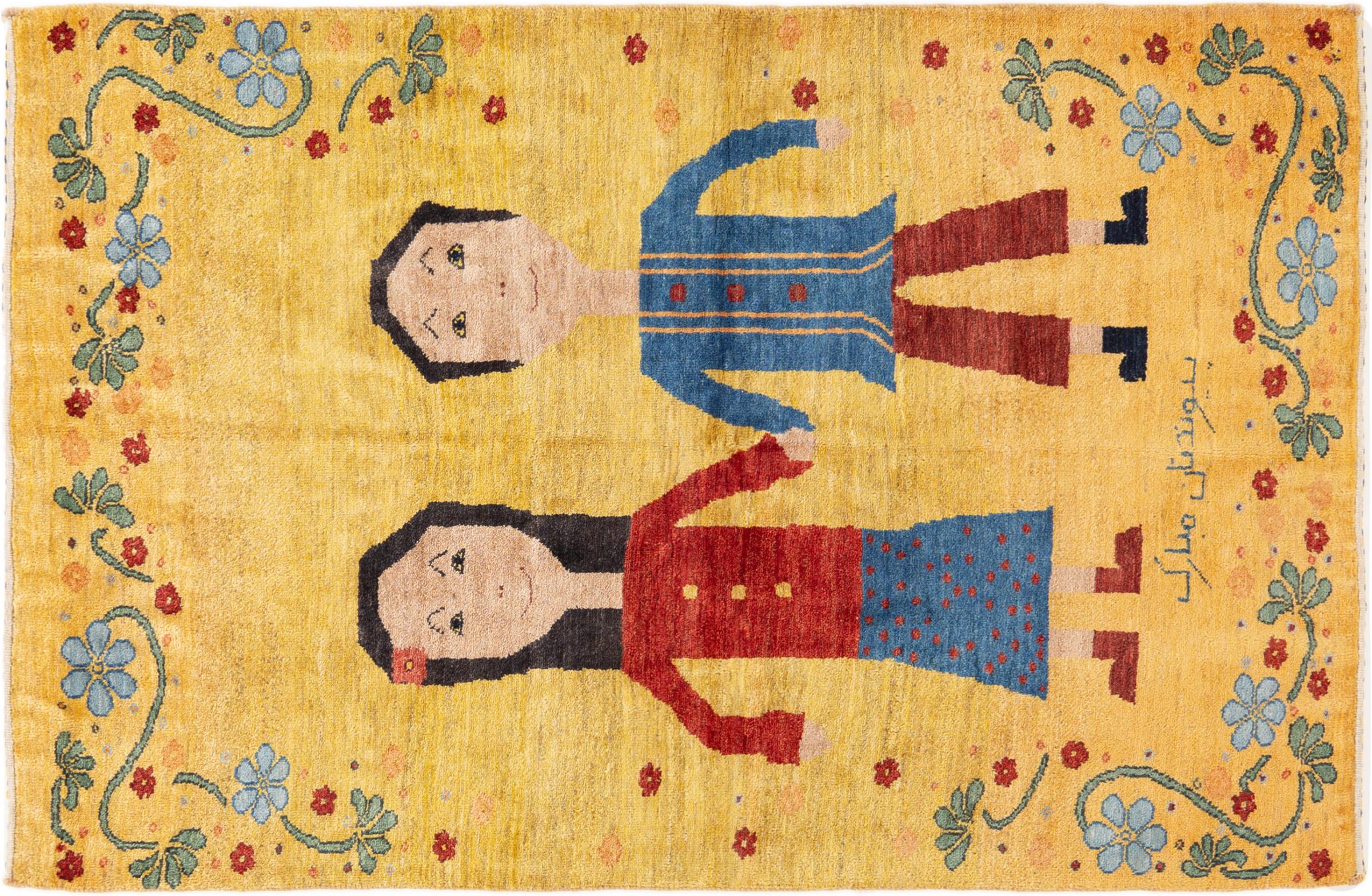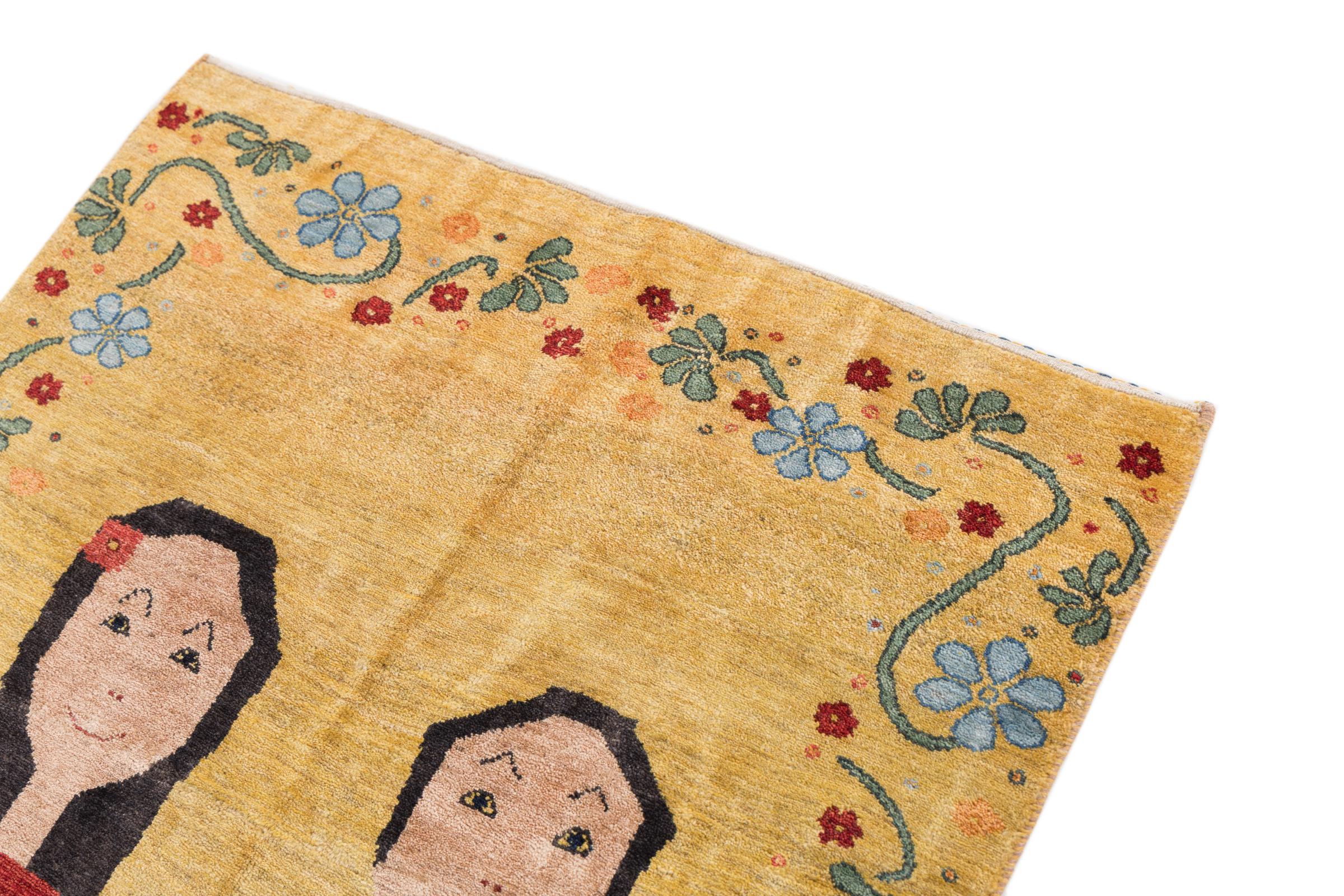 This beautiful rug is a Persian Gabbeh and thus belongs to the highest quality Gabbeh rugs. The rugs are knotted by nomads or semi-nomads in Iran following traditional handicraft. The simple motifs and patterns are mostly inspired by the nomads' close environment. For example camels, trees or bushes can be found on the traditional rugs. Persian Gabbeh rugs are made of wool from locally raised flocks of sheep. The wool is therefore mostly still spun by hand. Thus each of these oriental rugs embodies a unique character of centuries-old culture.