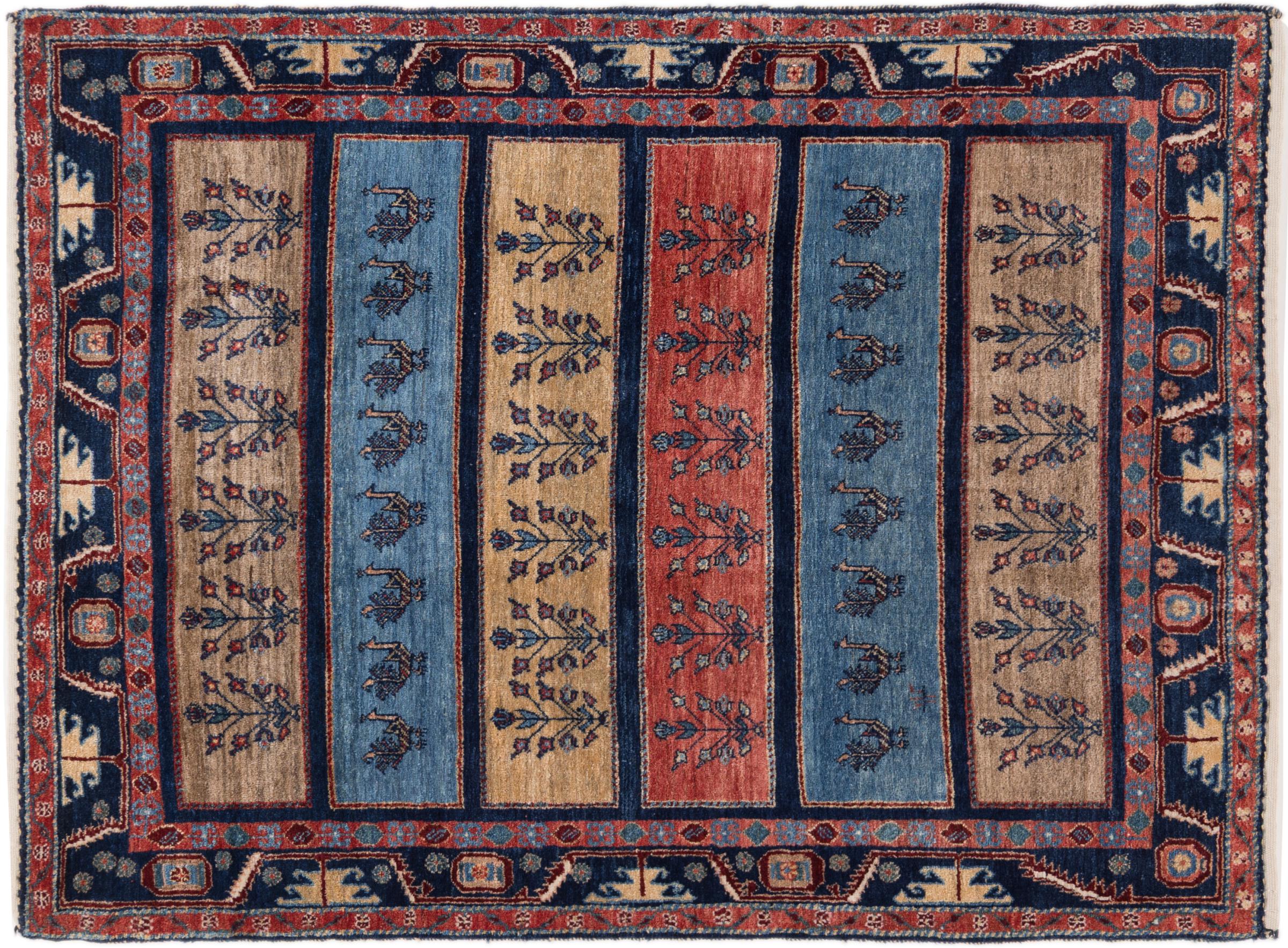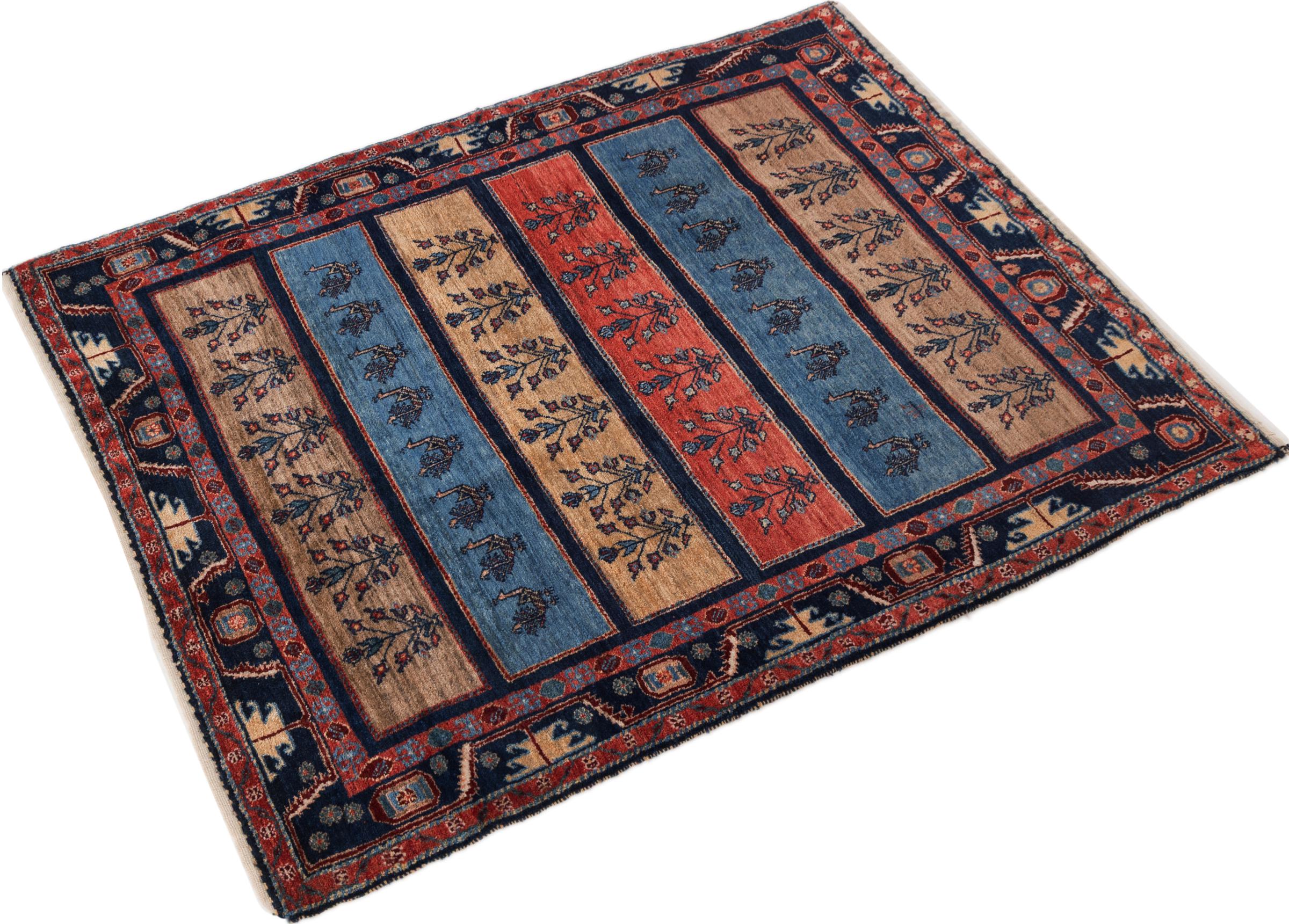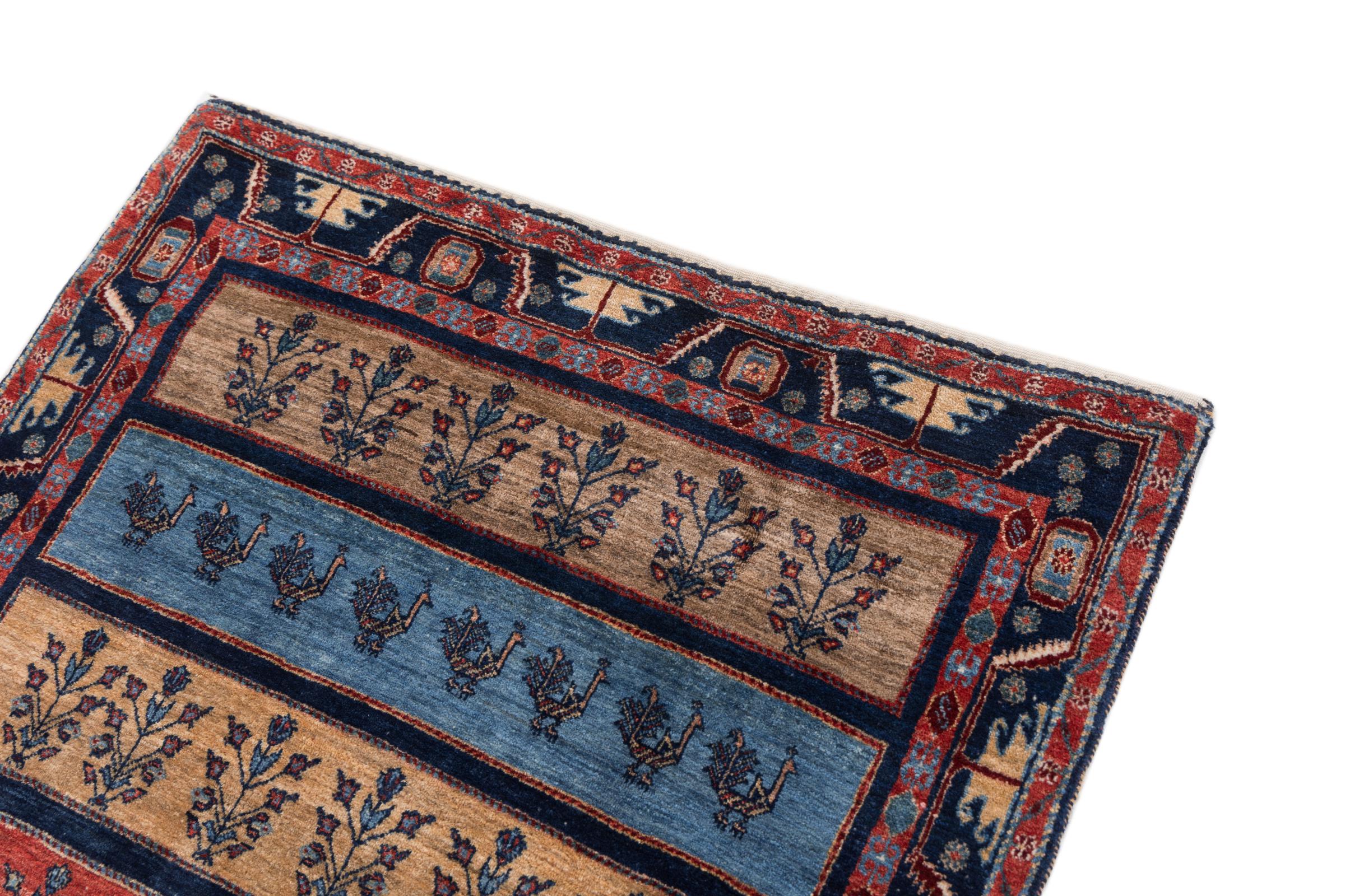 This beautiful rug is a Persian Gabbeh and thus belongs to the highest quality Gabbeh rugs. The rugs are knotted by nomads or semi-nomads in Iran following traditional handicraft. The simple motifs and patterns are mostly inspired by the nomads' close environment. For example camels, trees or bushes can be found on the traditional rugs. Persian Gabbeh rugs are made of wool from locally raised flocks of sheep. The wool is therefore mostly still spun by hand. Thus each of these oriental rugs embodies a unique character of centuries-old culture.