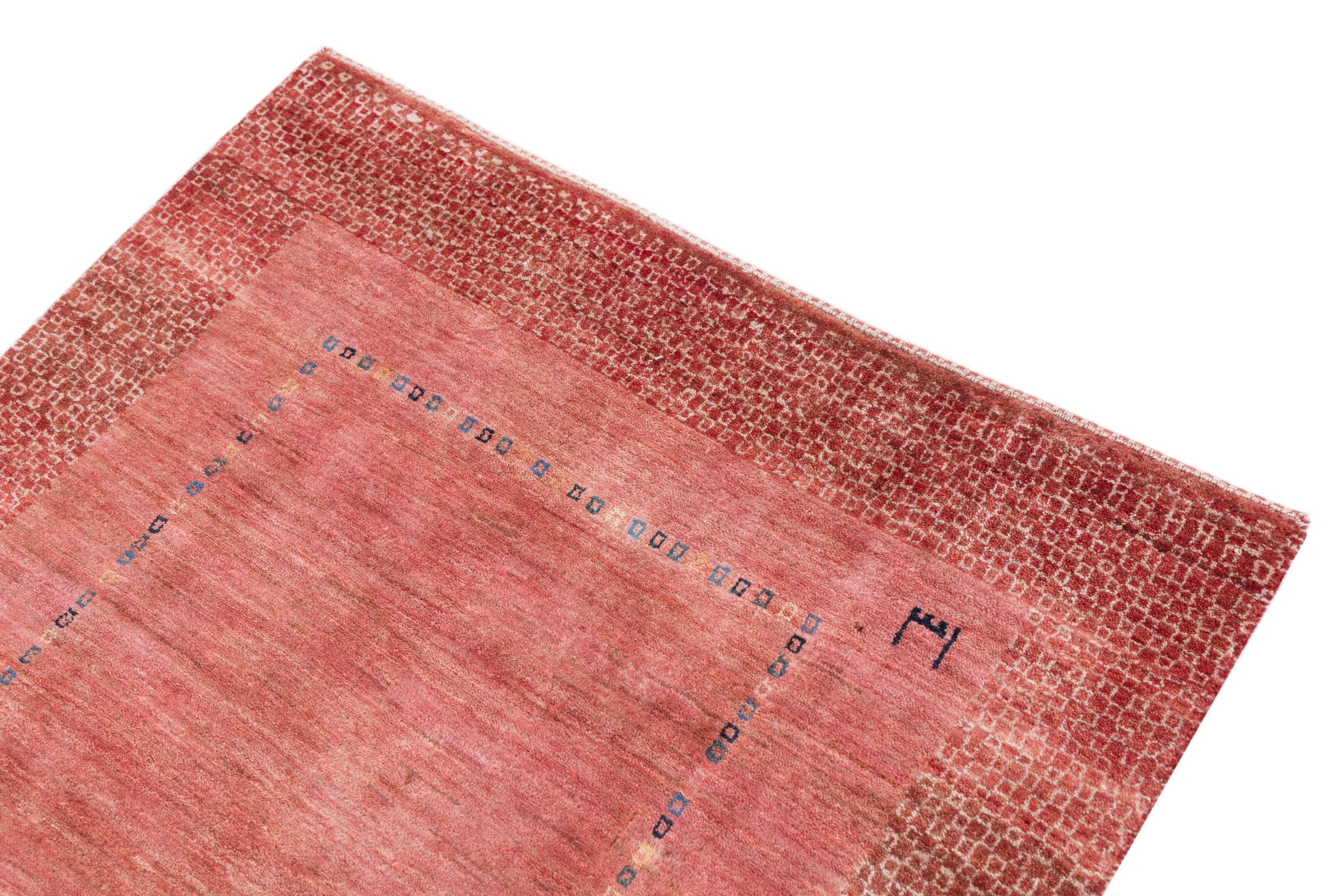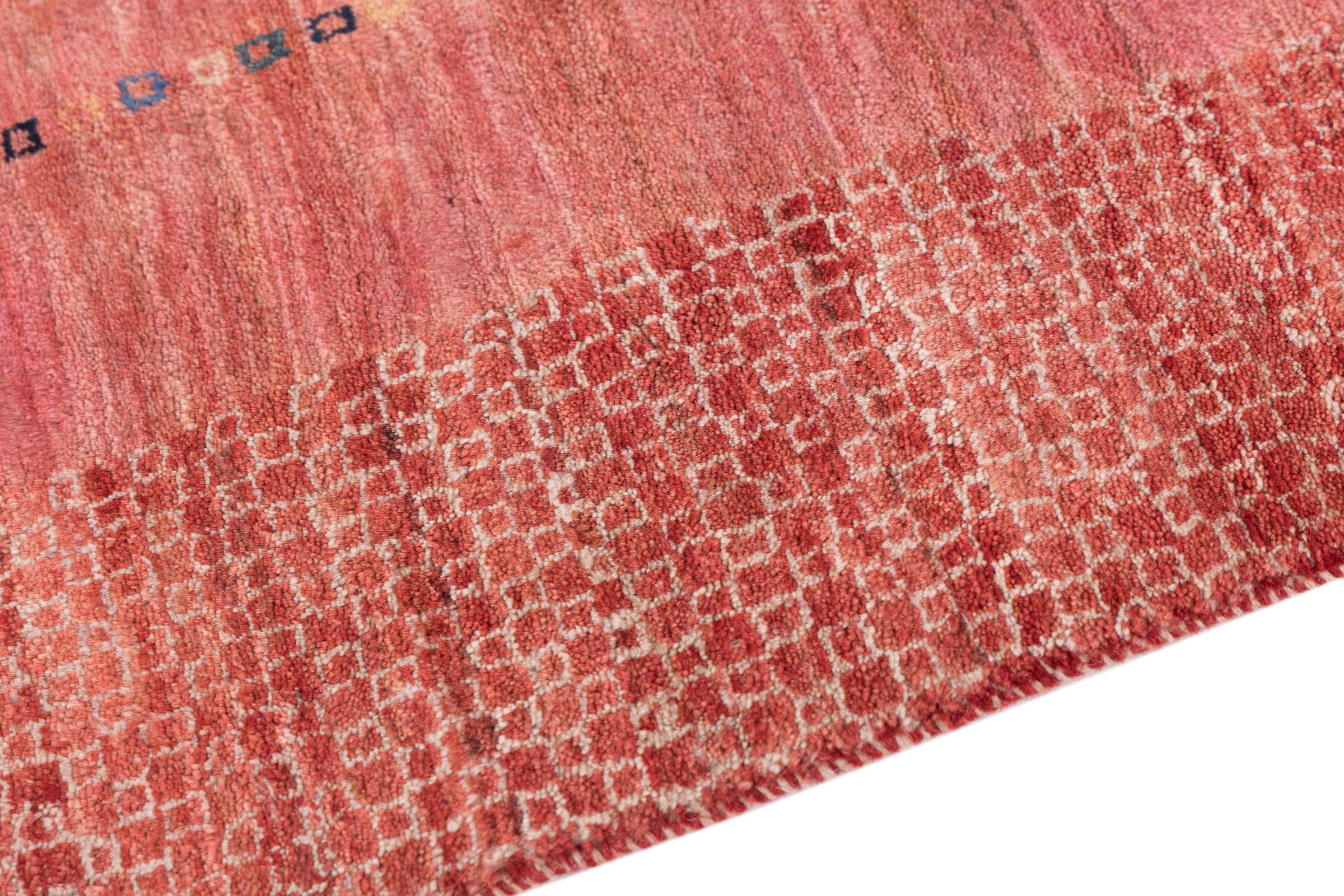 This beautiful rug is a Persian Gabbeh and thus belongs to the highest quality Gabbeh rugs. The rugs are knotted by nomads or semi-nomads in Iran following traditional handicraft. The simple motifs and patterns are mostly inspired by the nomads' close environment. For example camels, trees or bushes can be found on the traditional rugs. Persian Gabbeh rugs are made of wool from locally raised flocks of sheep. The wool is therefore mostly still spun by hand. Thus each of these oriental rugs embodies a unique character of centuries-old culture.