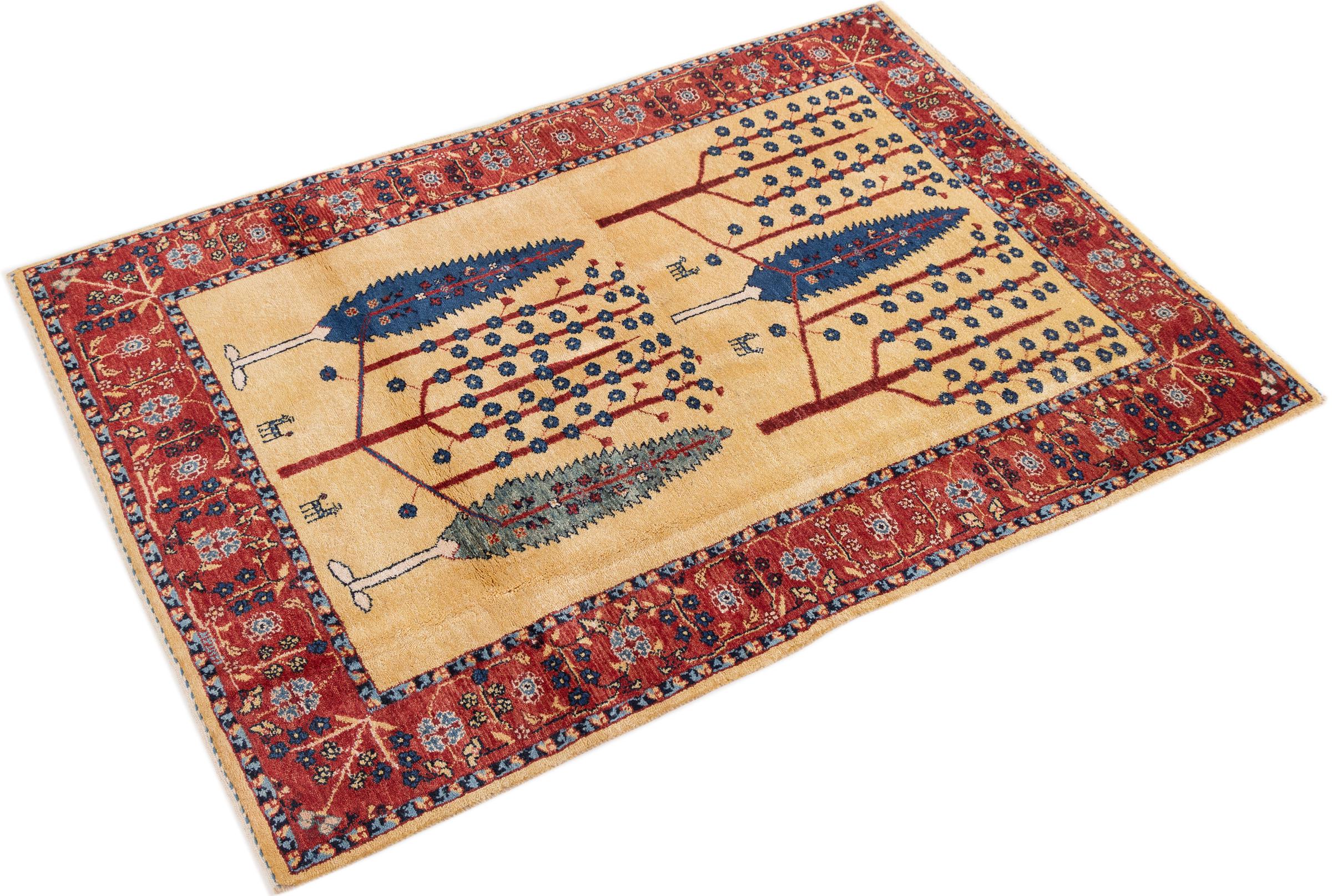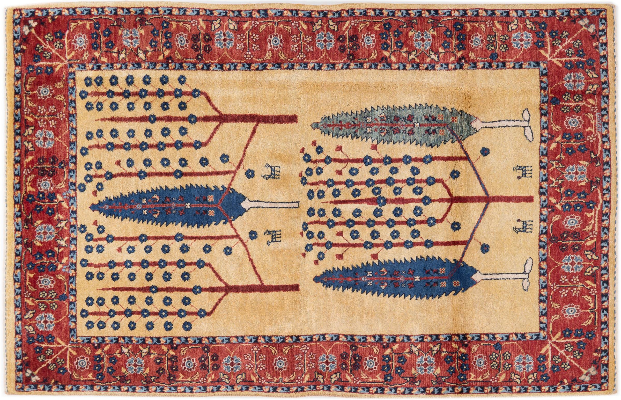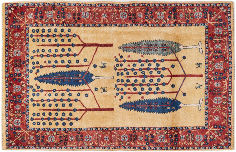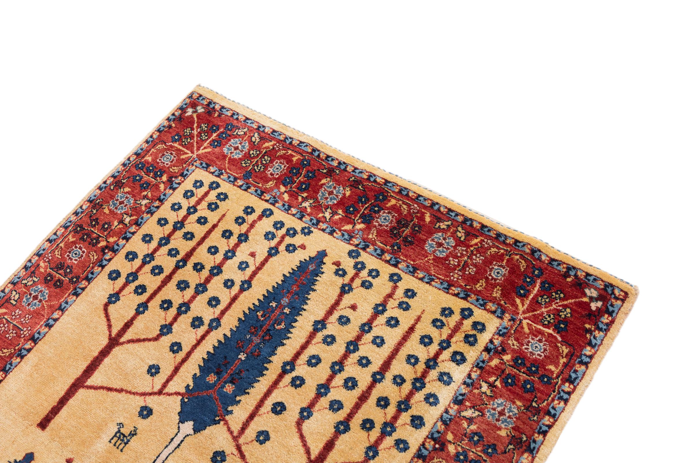 This beautiful rug is a Persian Gabbeh and thus belongs to the highest quality Gabbeh rugs. The rugs are knotted by nomads or semi-nomads in Iran following traditional handicraft. The simple motifs and patterns are mostly inspired by the nomads' close environment. For example camels, trees or bushes can be found on the traditional rugs. Persian Gabbeh rugs are made of wool from locally raised flocks of sheep. The wool is therefore mostly still spun by hand. Thus each of these oriental rugs embodies a unique character of centuries-old culture.