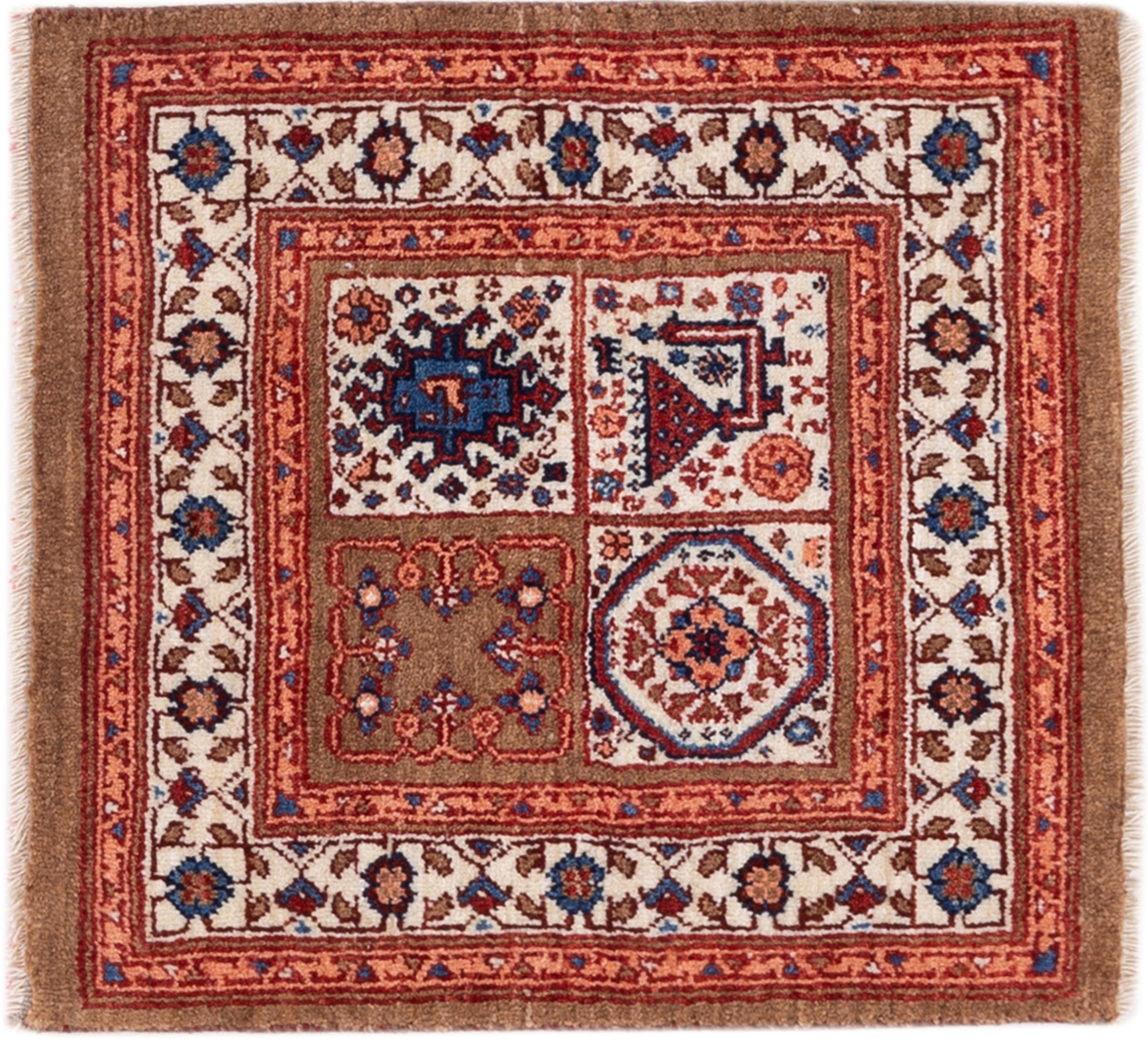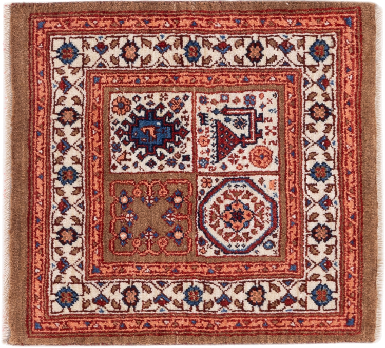 Carpet ID: 287549009798955 Size: 54x54 cm Thickness: ap. 12 mm Knot density: 160 000 - 200 000 / m² Manufacturing: Knotted by hand Pile: Handspun wool Warp: Sheep wool Origin: Persia Age: New Weight: ap. 1 kg In stock: Unique - Only 1 in stock