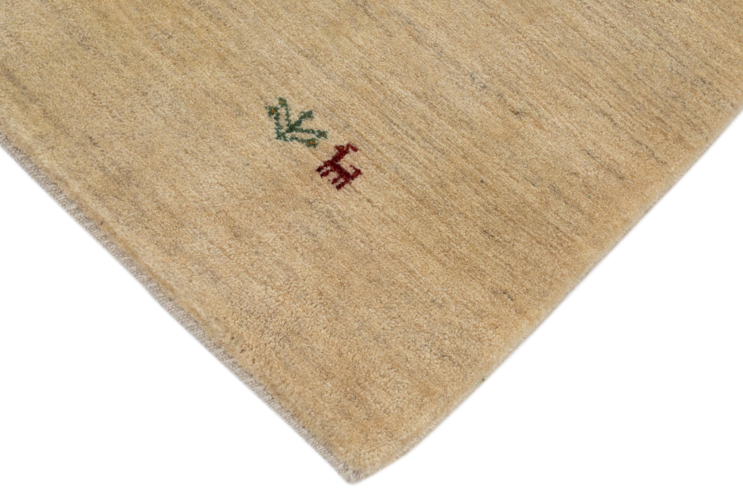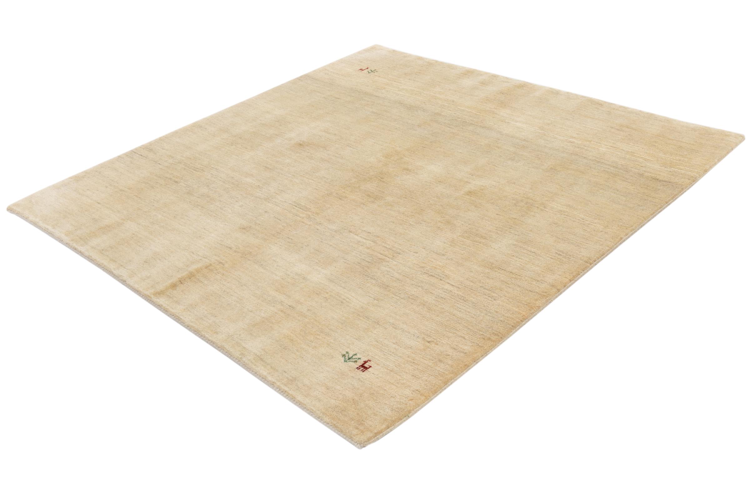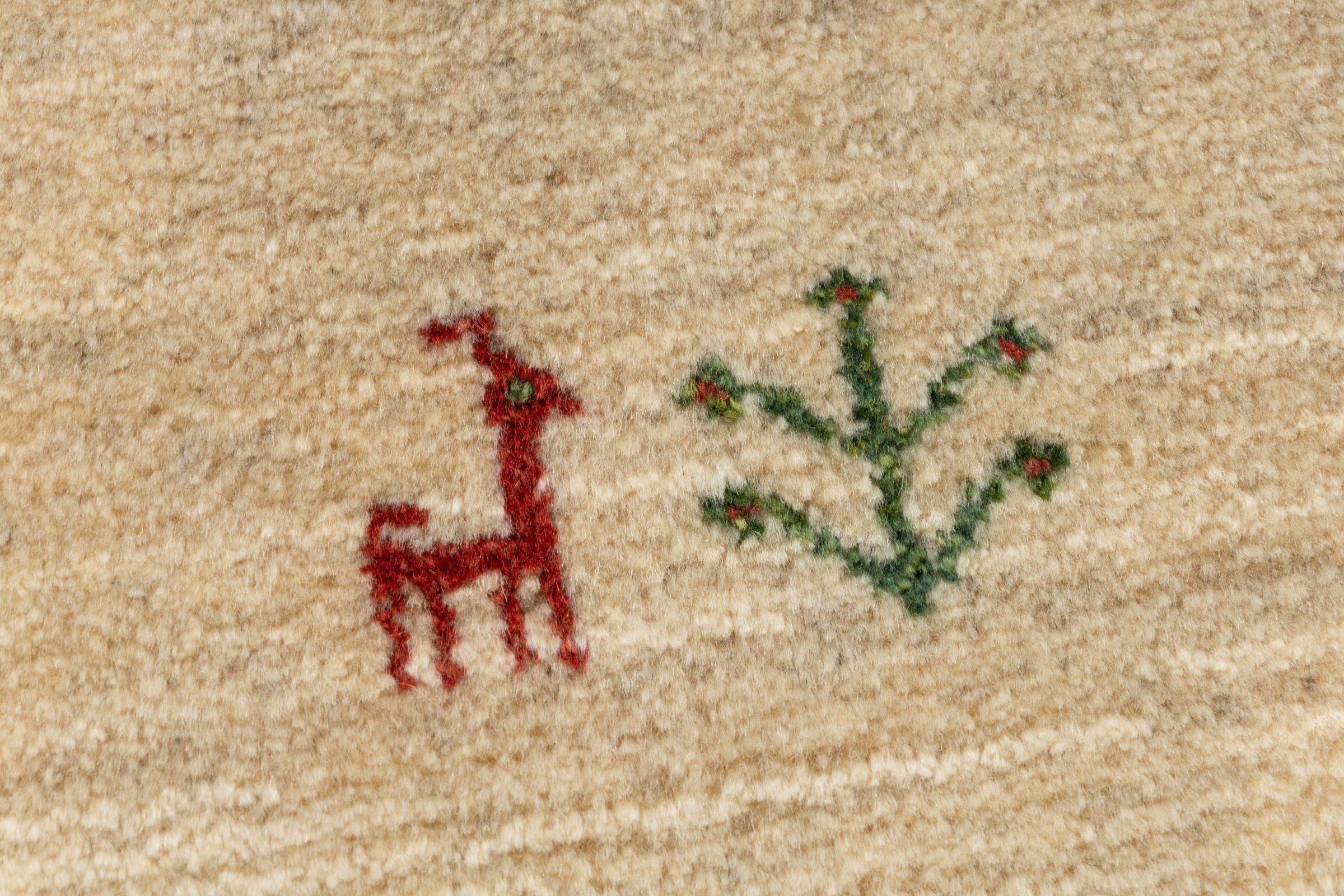 This beautiful rug is a Persian Gabbeh and thus belongs to the highest quality Gabbeh rugs. The rugs are knotted by nomads or semi-nomads in Iran following traditional handicraft. The simple motifs and patterns are mostly inspired by the nomads' close environment. For example camels, trees or bushes can be found on the traditional rugs. Persian Gabbeh rugs are made of wool from locally raised flocks of sheep. The wool is therefore mostly still spun by hand. Thus each of these oriental rugs embodies a unique character of centuries-old culture.