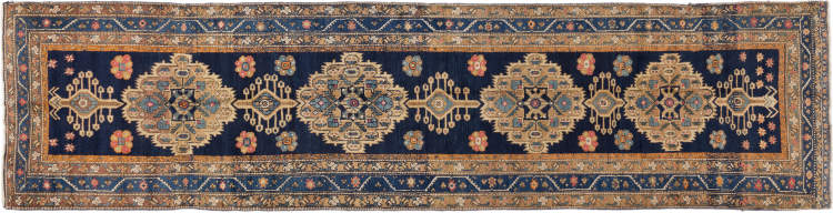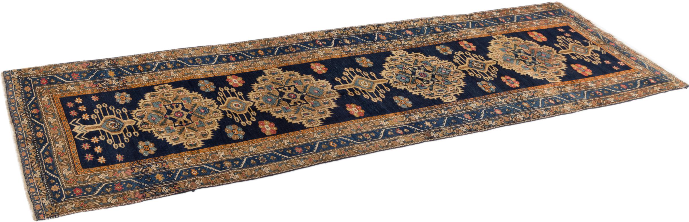 Carpet ID: 2984250044 Size: 435x108 cm Thickness: ap. 5 mm Knot density: 72 000 - 90 000 / m² Manufacturing: Knotted by hand Pile: Handspun wool Warp: Sheep wool Condition / Conservation Perfect Origin: Azerbaijan / Russia Age: Antique, over 80 years Weight: ap. 9 kg In stock: Unique - Only 1 in stock