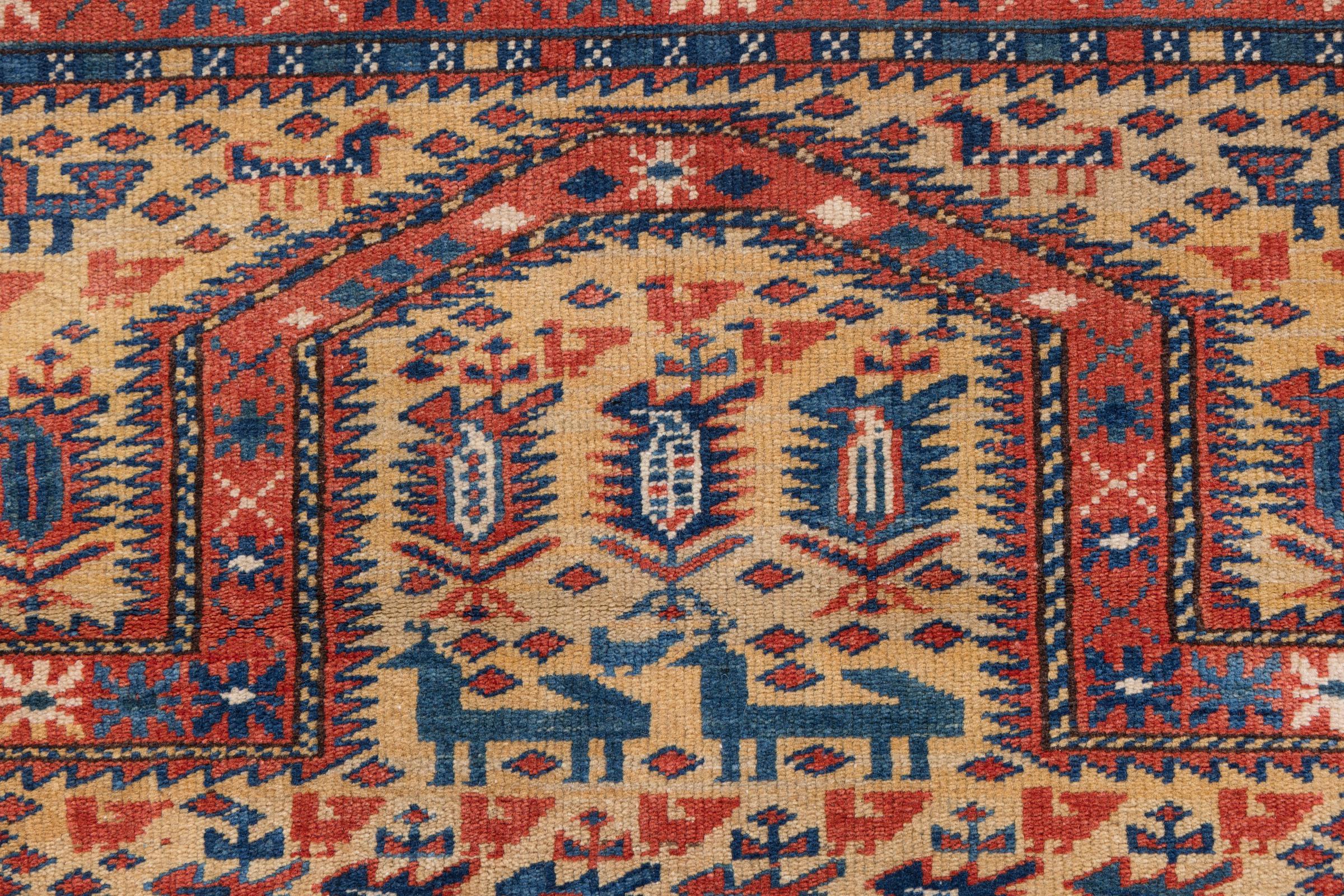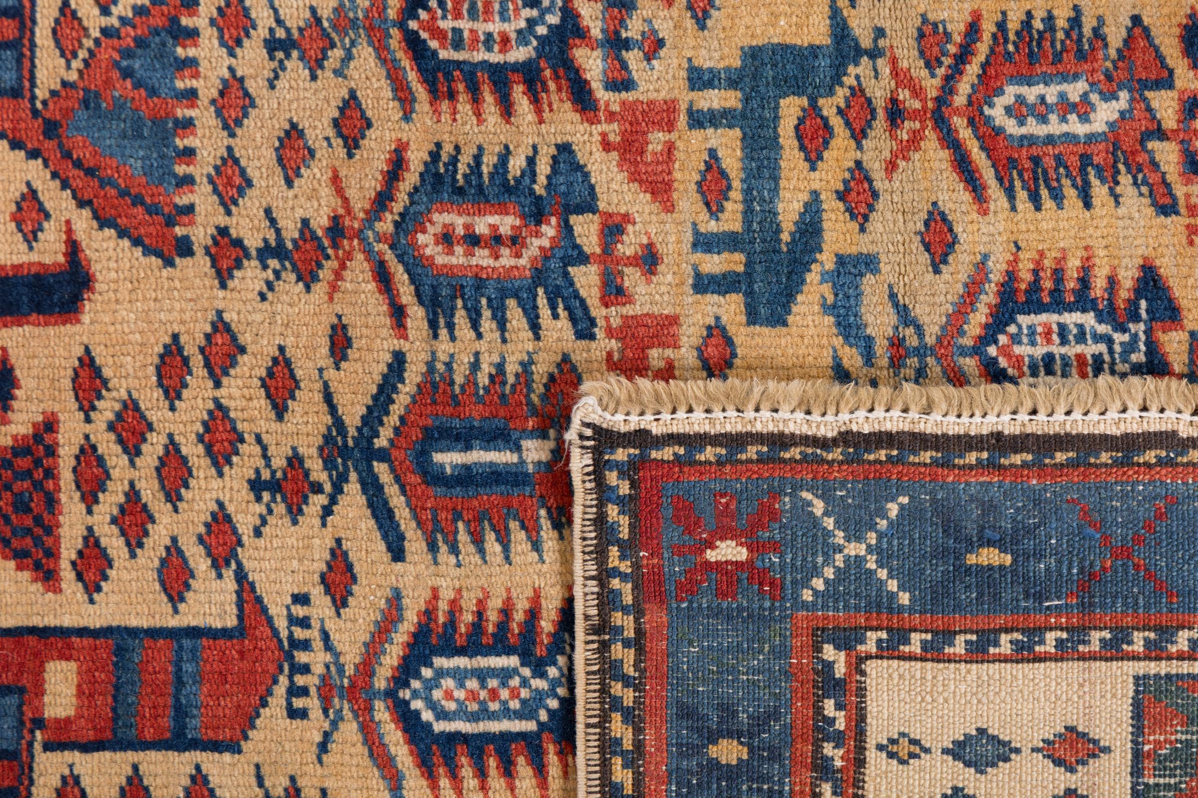 This handknotted Shirvan is a very robust carpet from eastern Caucasus, which catches one’s eye with its beautiful colouring and its beautiful decorating elements. Thanks to a very dense knotting it is also durable.
