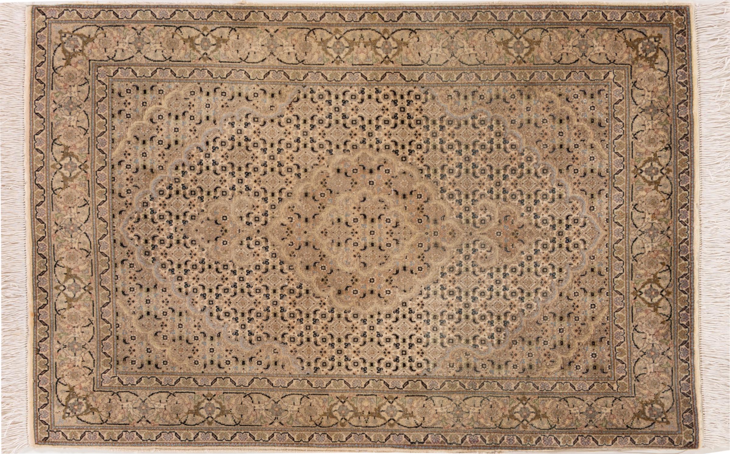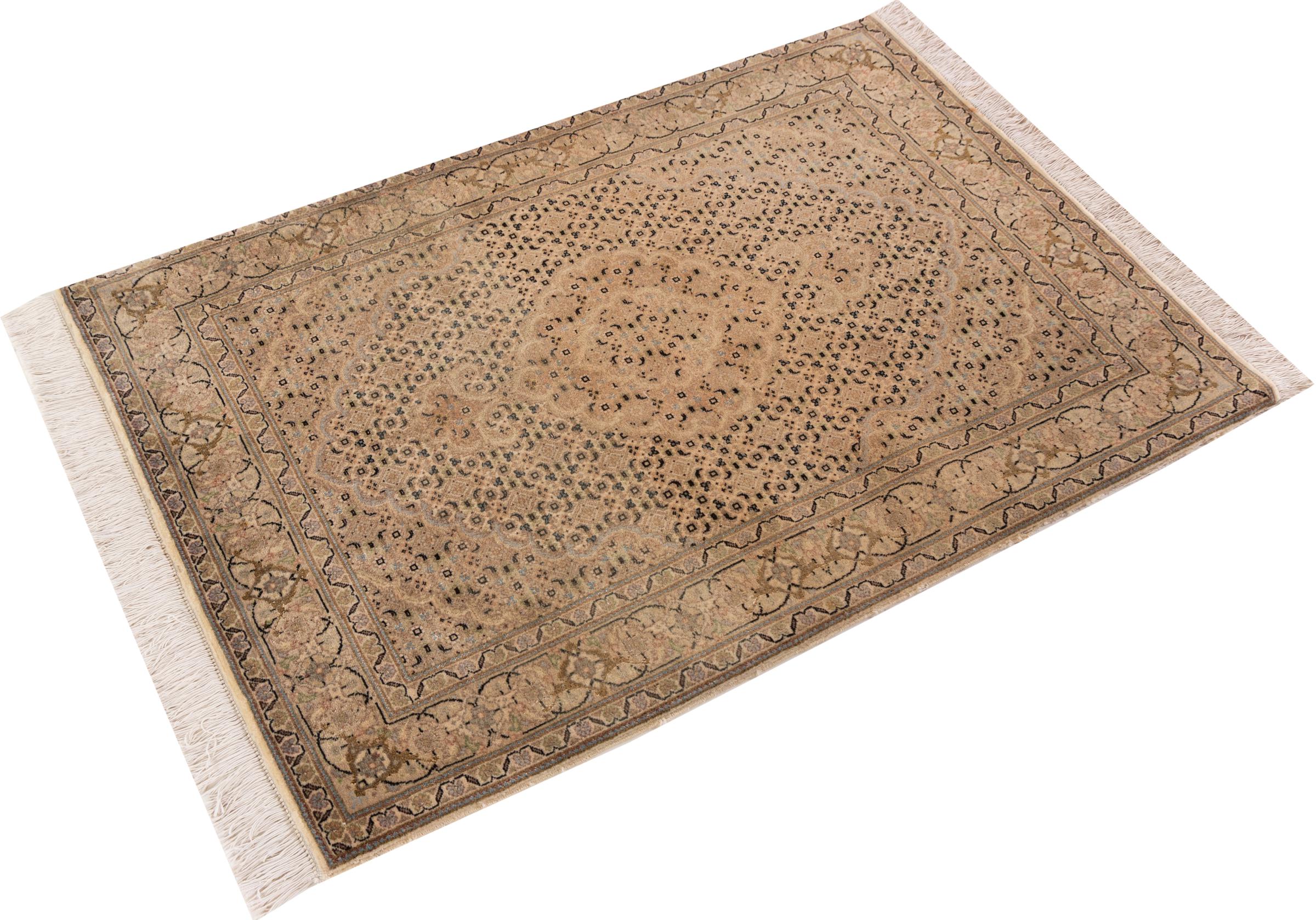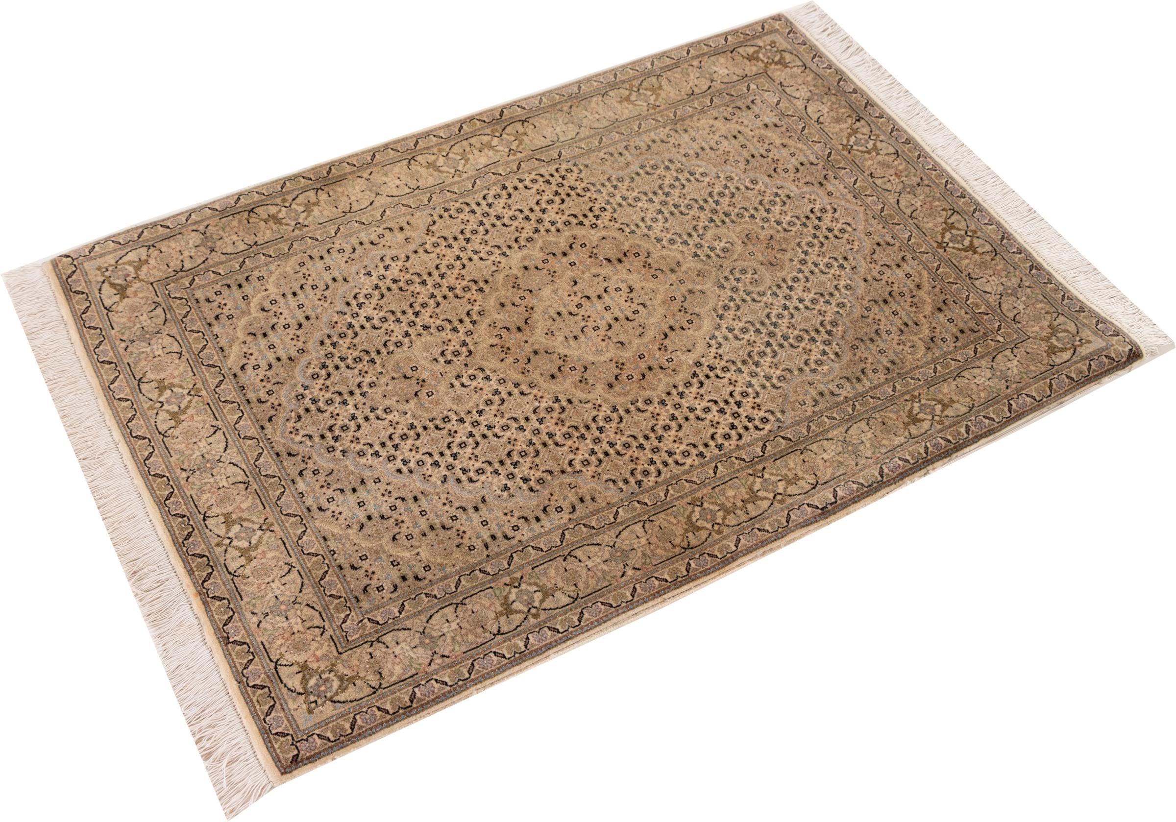 Carpet ID: 30698200105512 Size: 120x80 cm Thickness: ap. 7 mm Knot density: 440 000 - 490 000 / m² Manufacturing: Knotted by hand Pile: Wool with silk Warp: Cotton Origin: Persia Age: New Weight: ap. 3 kg Also know as Tabriz, Tabris, Täbris, Tebriz, Tebris, 40Raj, 50Raj In stock: Unique - Only 1 in stock