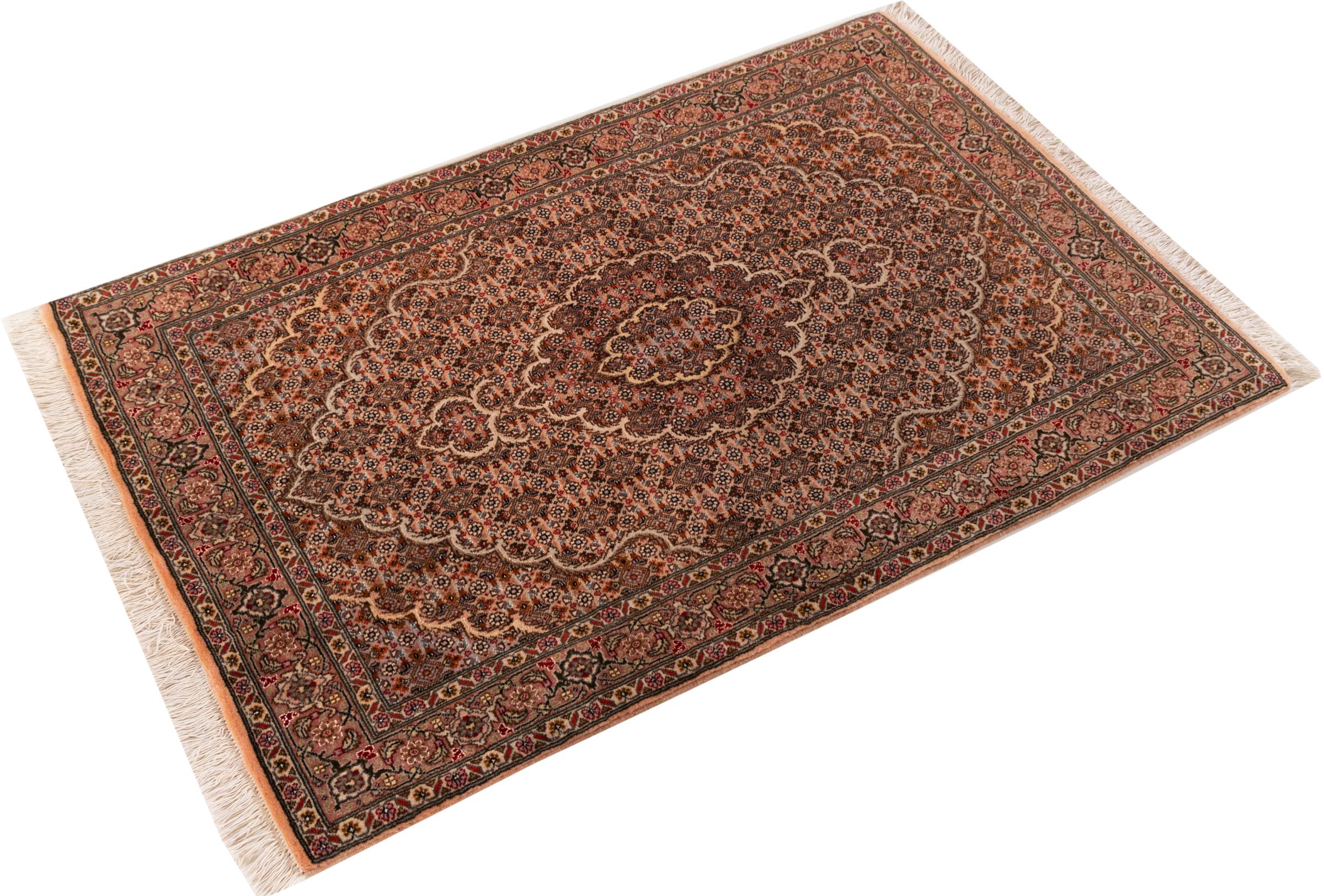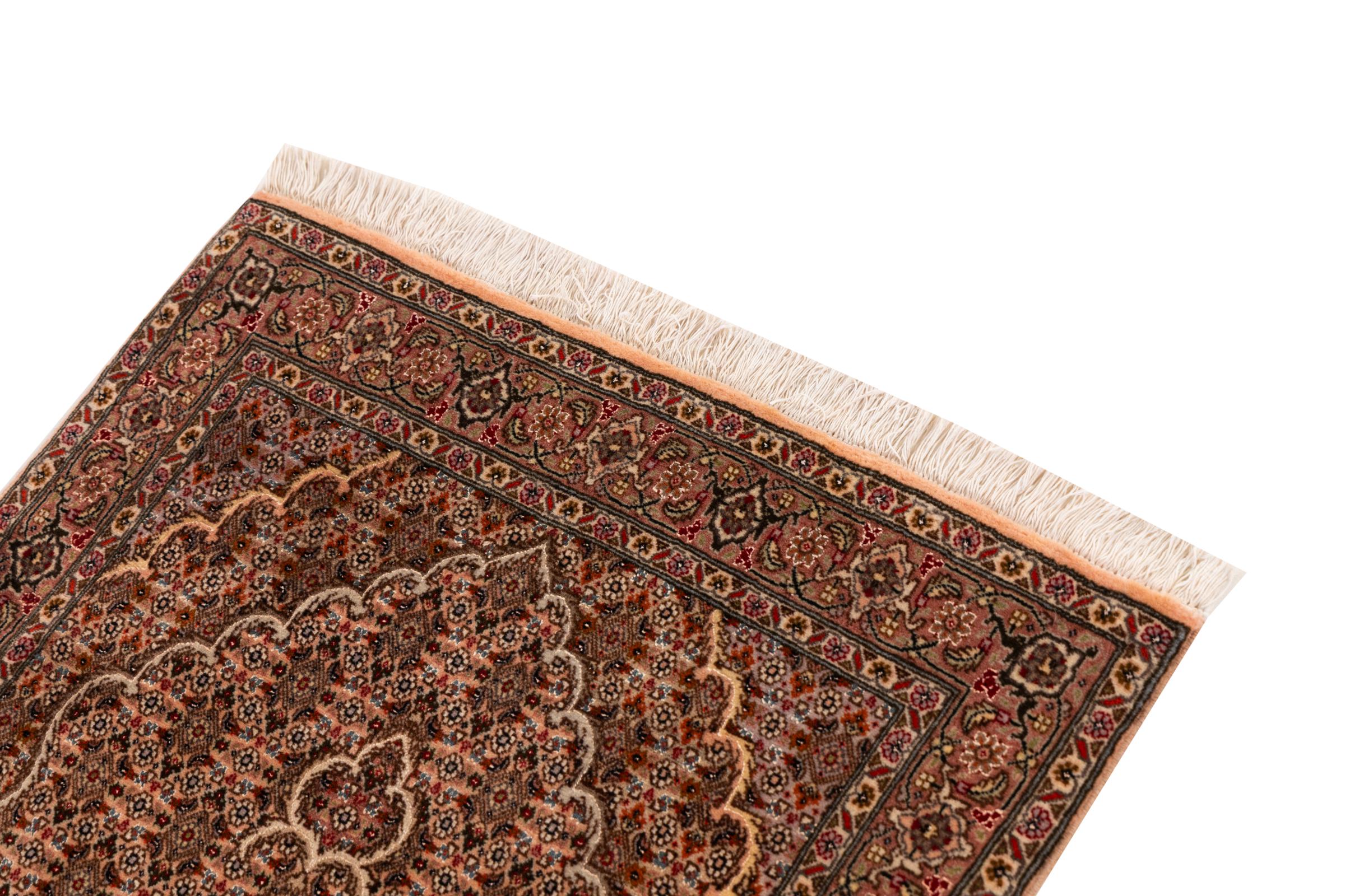Carpet ID: 30699400105524 Size: 127x78 cm Thickness: ap. 7 mm Knot density: 440 000 - 490 000 / m² Manufacturing: Knotted by hand Pile: Wool with silk Warp: Cotton Origin: Persia Age: New Weight: ap. 3 kg Also know as Tabriz, Tabris, Täbris, Tebriz, Tebris, 40Raj, 50Raj In stock: Unique - Only 1 in stock