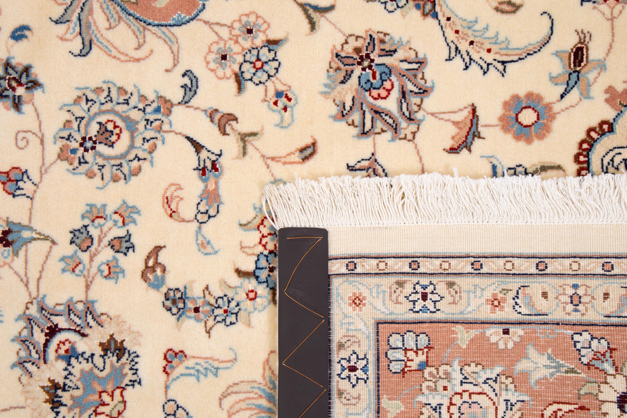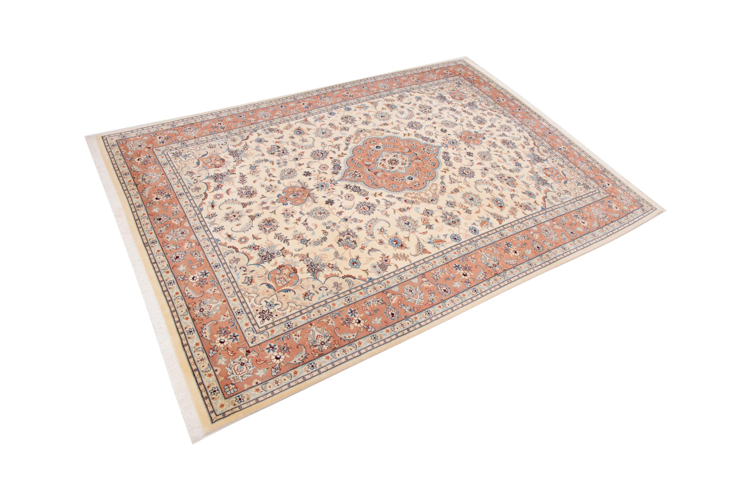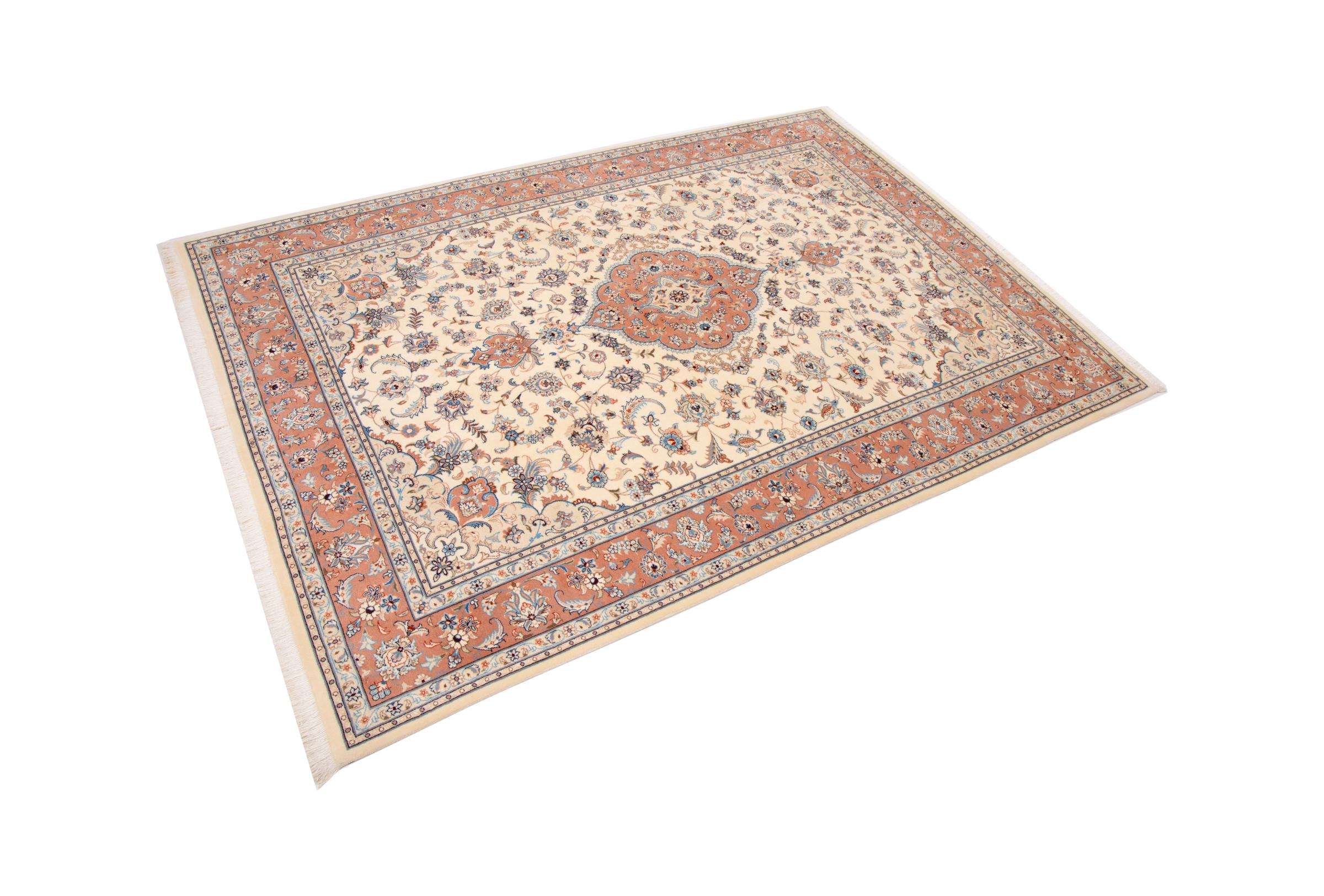 Carpet ID: 292968003339684 Size: 299x199 cm Thickness: ap. 7 mm Knot density: 440 000 - 490 000 / m² Manufacturing: Knotted by hand Pile: Wool with silk Warp: Cotton Origin: Persia Age: New Weight: ap. 18 kg Also know as Tabriz, Tabris, Täbris, Tebriz, Tebris, 40Raj, 50Raj In stock: Unique - Only 1 in stock