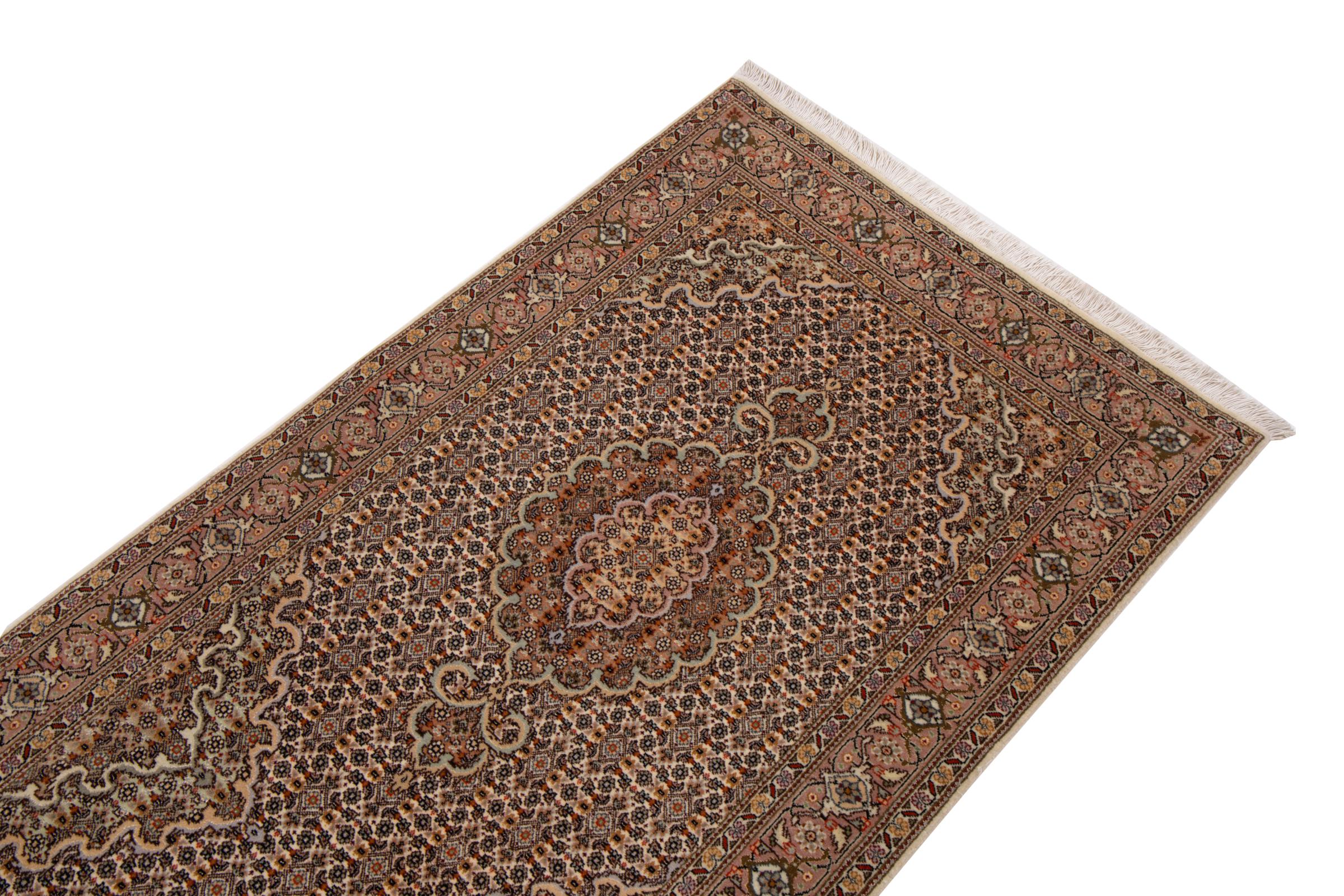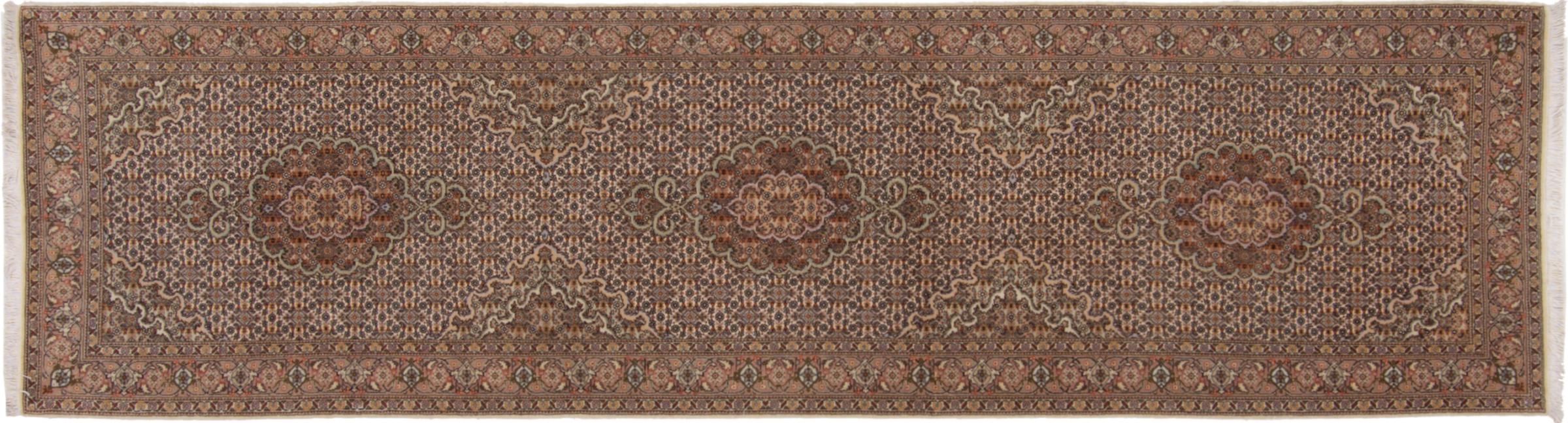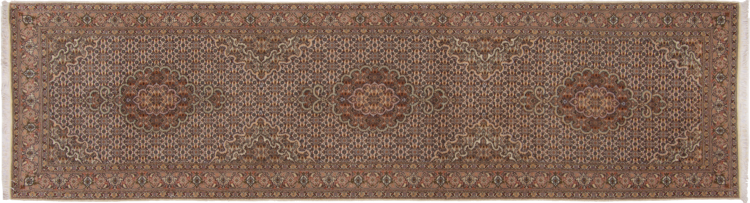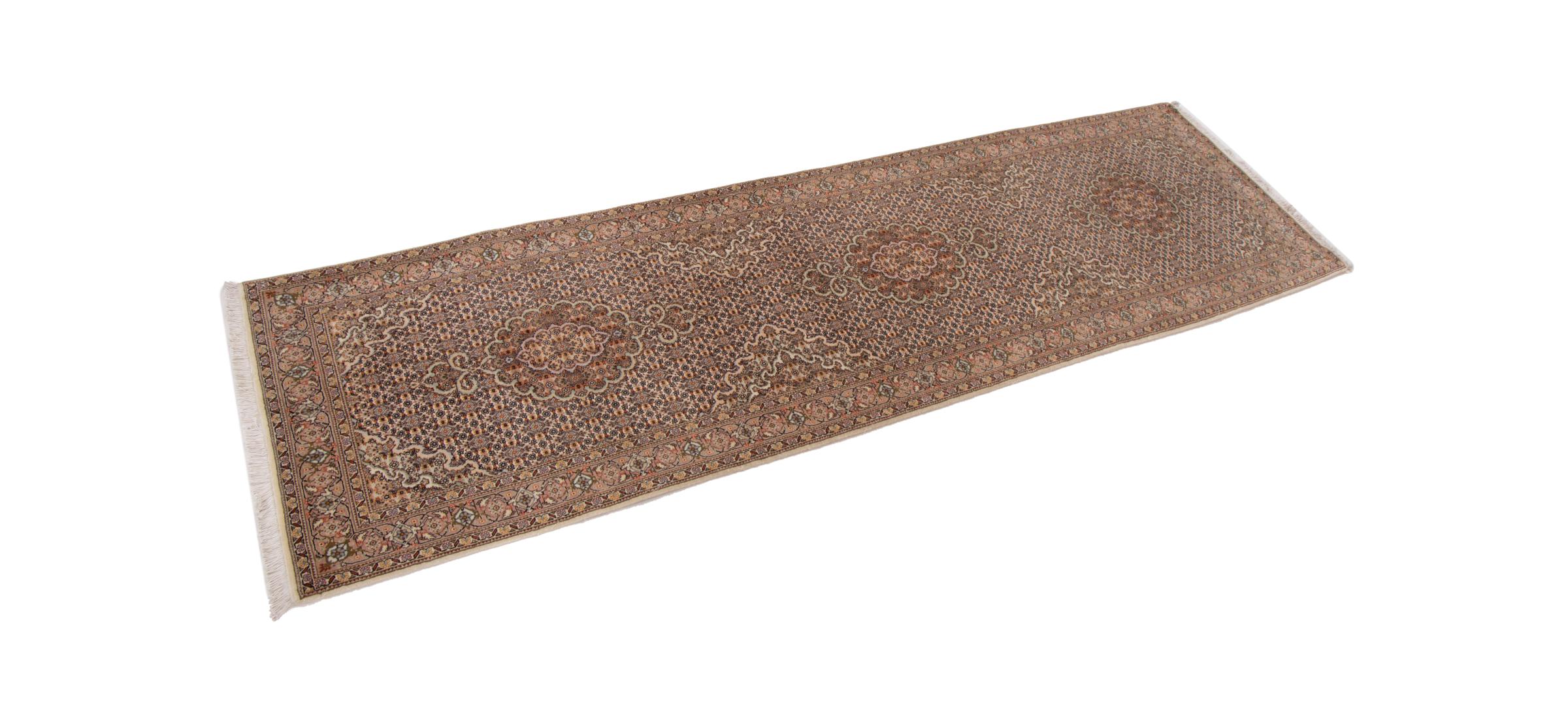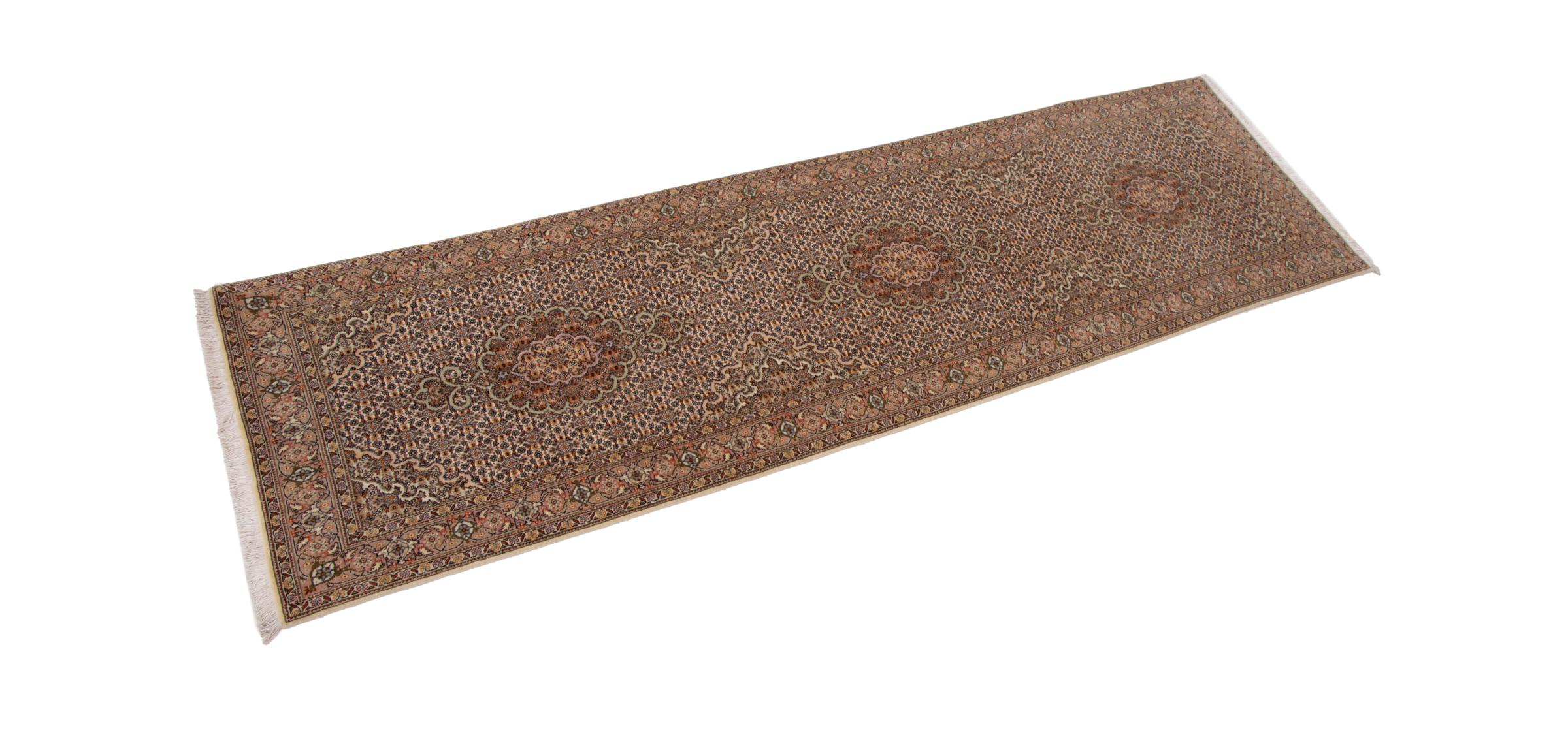 Carpet ID: 292837009745162 Size: 299x77 cm Thickness: ap. 7 mm Knot density: 440 000 - 490 000 / m² Manufacturing: Knotted by hand Pile: Wool with silk Warp: Cotton Origin: Persia Age: New Weight: ap. 7 kg Also know as Tabriz, Tabris, Täbris, Tebriz, Tebris, 40Raj, 50Raj In stock: Unique - Only 1 in stock