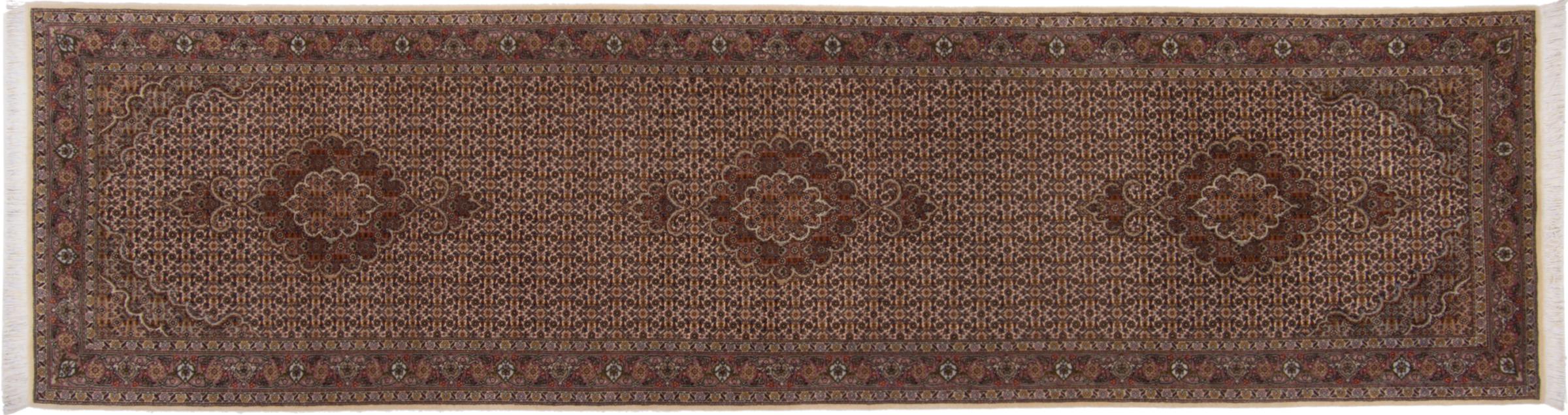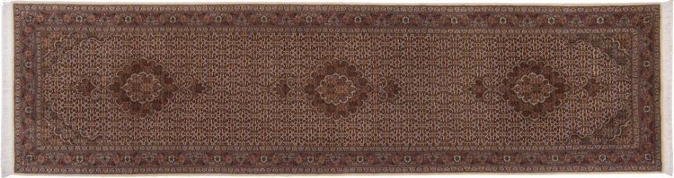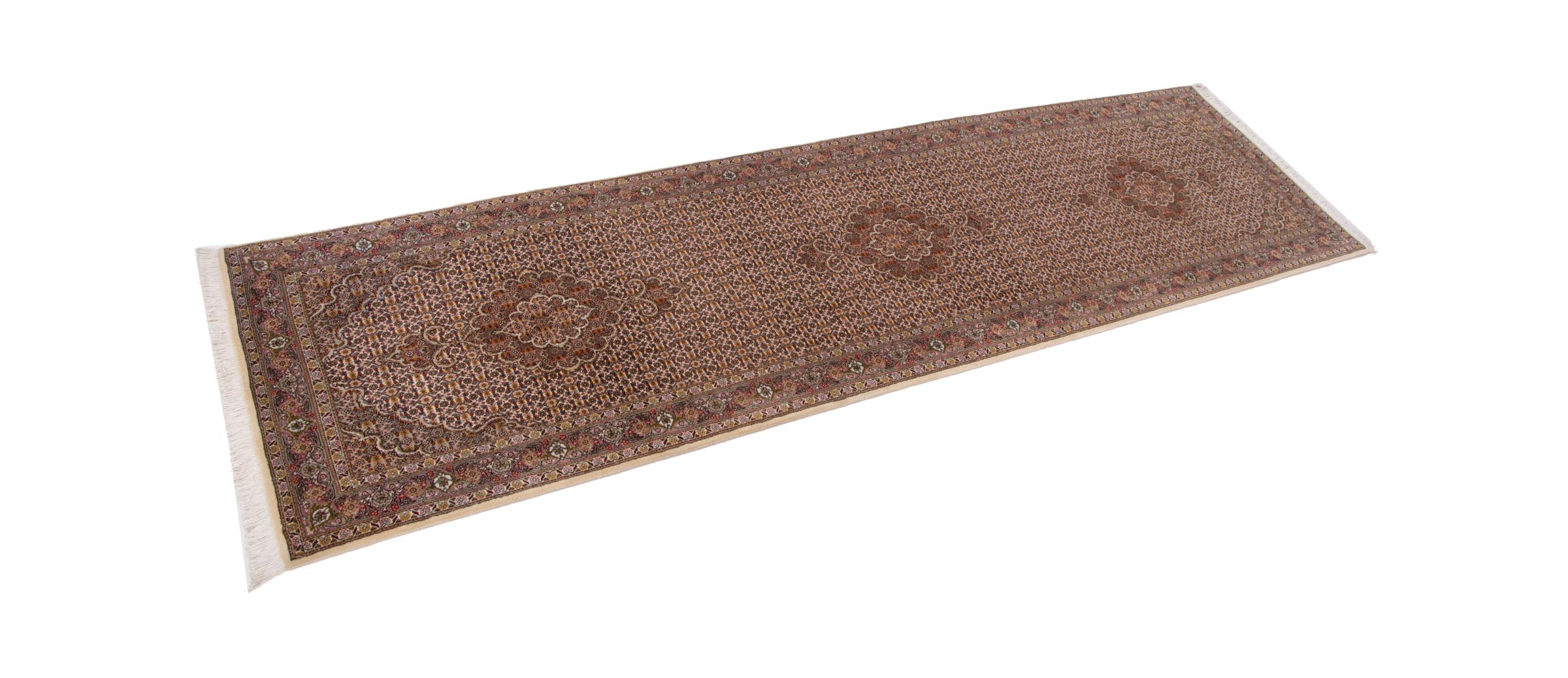 Carpet ID: 292841006149366 Size: 306x79 cm Thickness: ap. 7 mm Knot density: 440 000 - 490 000 / m² Manufacturing: Knotted by hand Pile: Wool with silk Warp: Cotton Origin: Persia Age: New Weight: ap. 7 kg Also know as Tabriz, Tabris, Täbris, Tebriz, Tebris, 40Raj, 50Raj In stock: Unique - Only 1 in stock