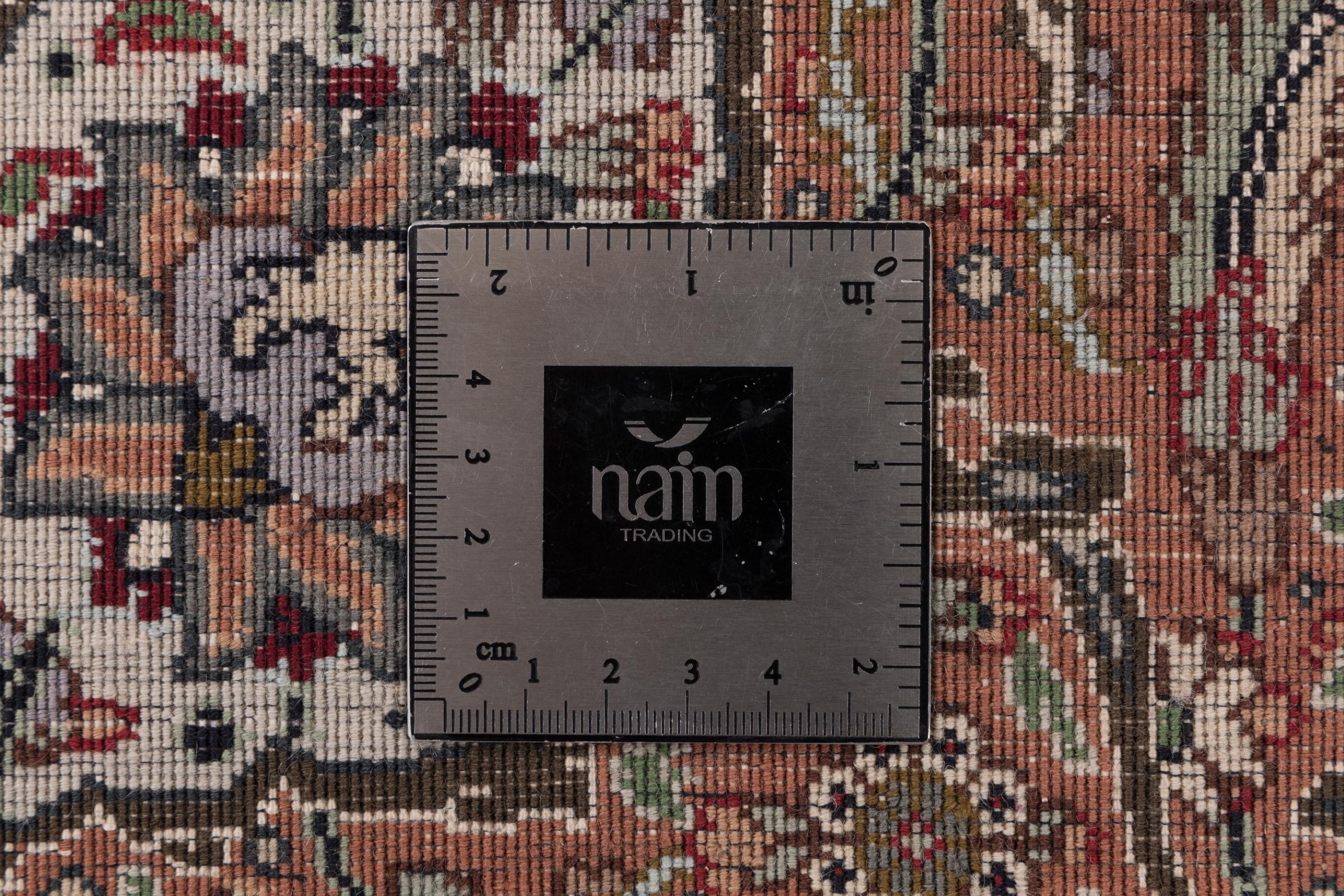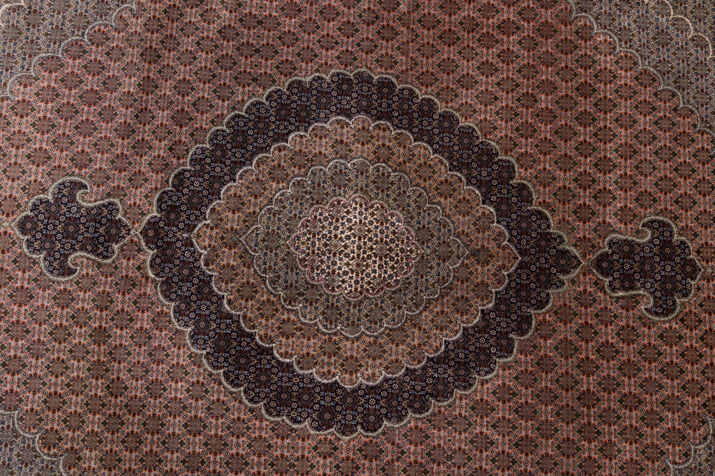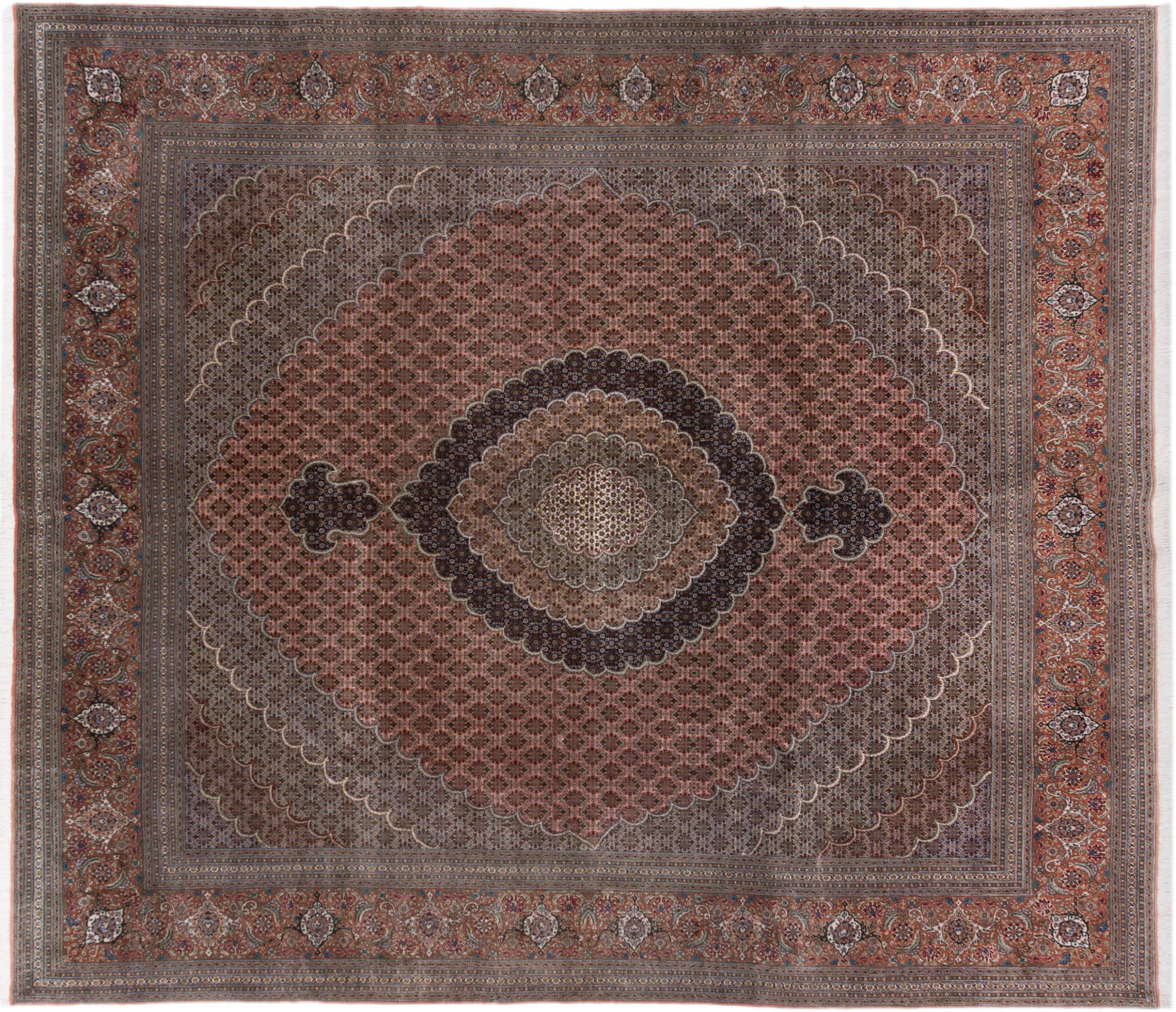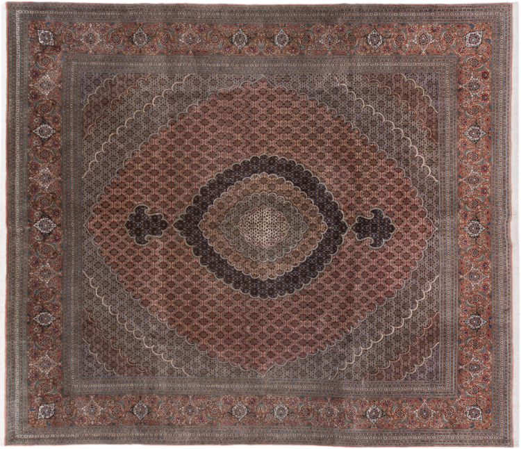 Carpet ID: 23173000104309 Size: 335x296 cm Thickness: ap. 7 mm Knot density: 440 000 - 490 000 / m² Manufacturing: Knotted by hand Pile: Wool with silk Warp: Cotton Origin: Persia Age: 20-30 years (New) Weight: ap. 30 kg Also know as Tabriz, Tabris, Täbris, Tebriz, Tebris, 40Raj, 50Raj In stock: Unique - Only 1 in stock