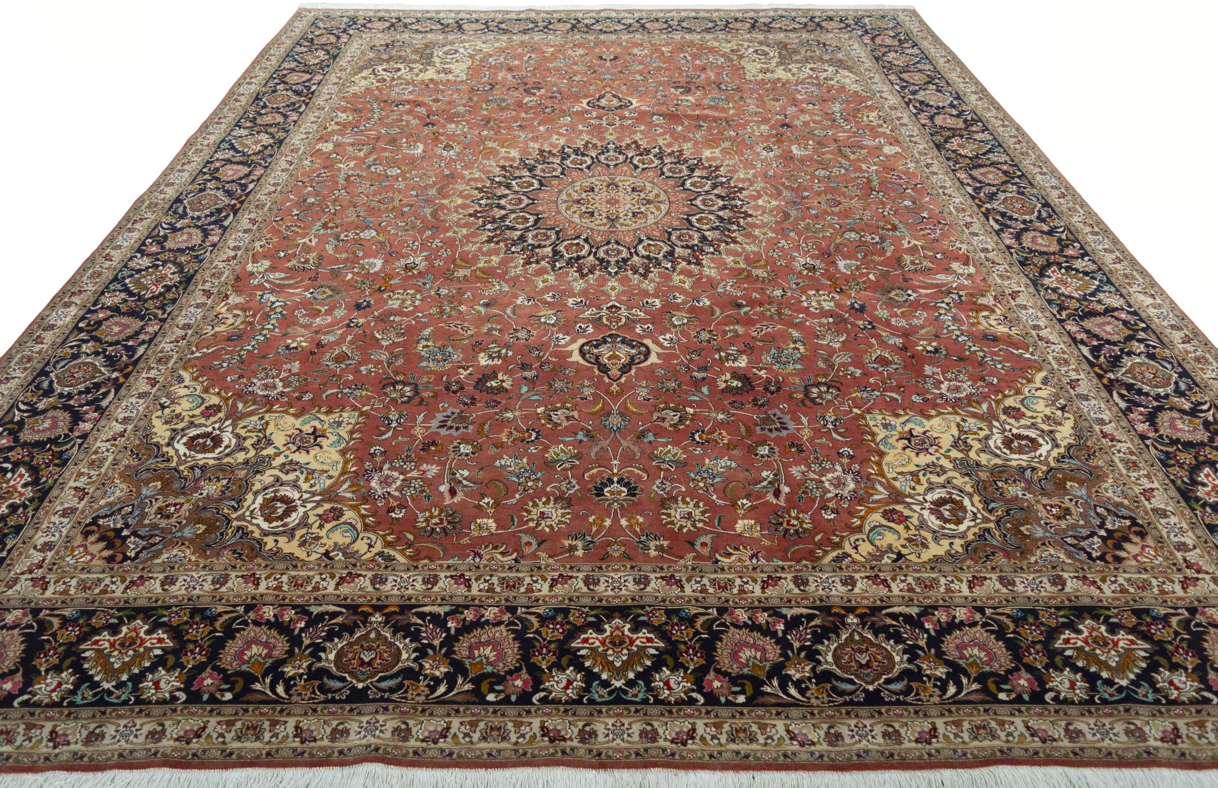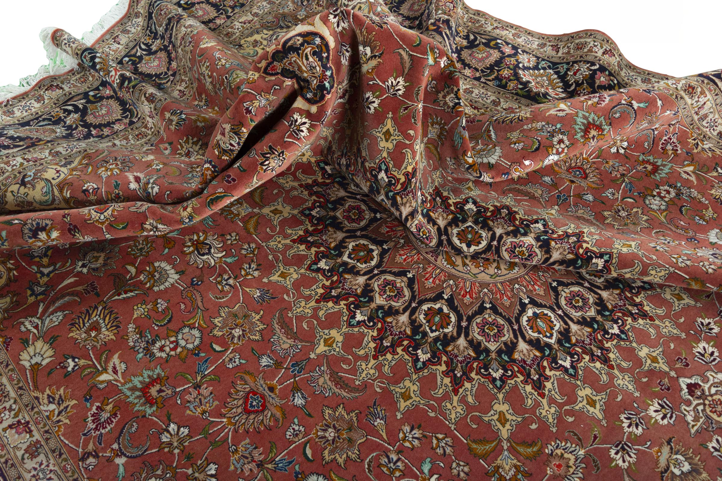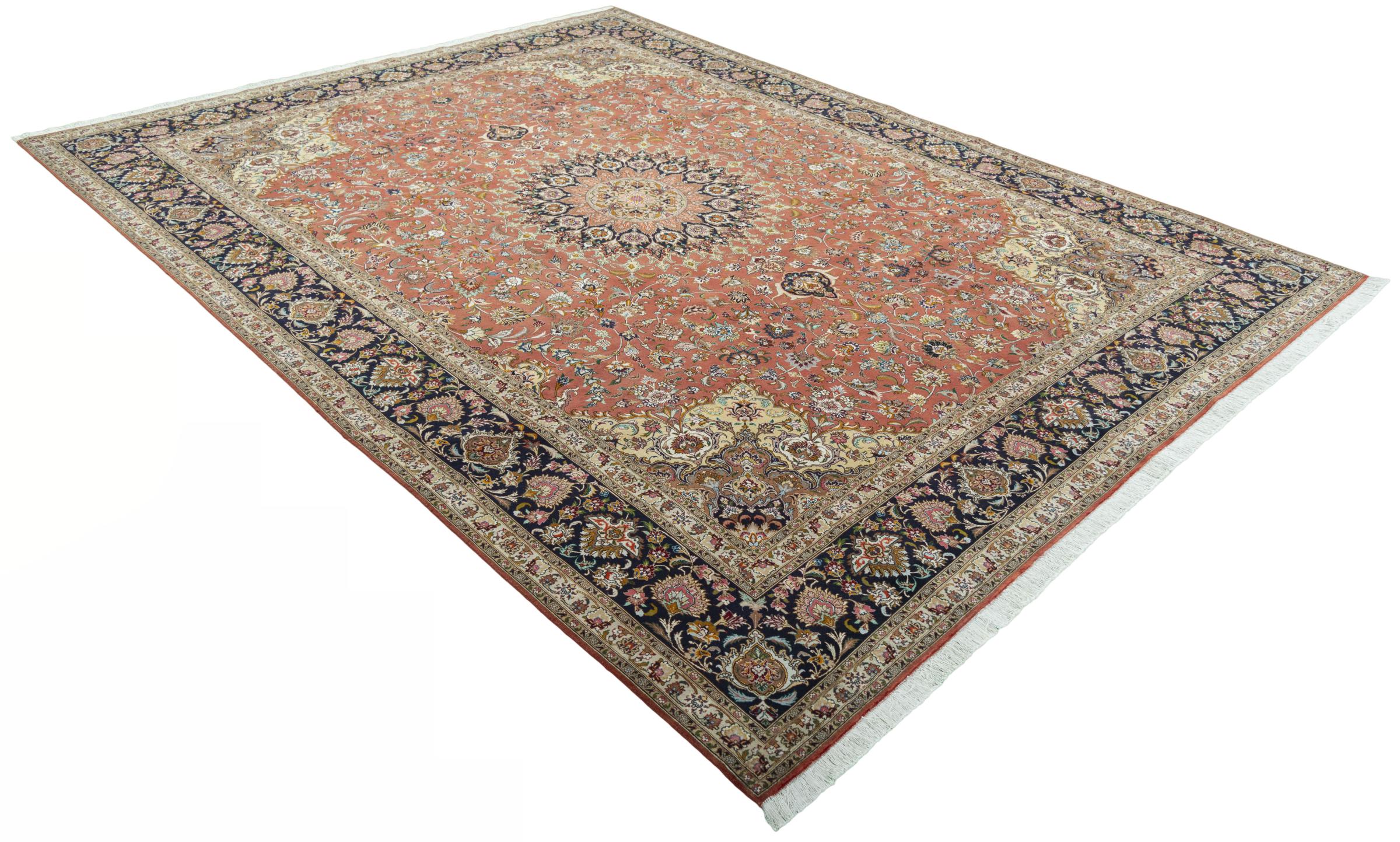 Carpet ID: 285311007168420 Size: 401x301 cm Thickness: ap. 7 mm Knot density: 450 000 - 500 000 / m² Manufacturing: Knotted by hand Pile: Cork wool with silk Warp: Cotton Origin: Persia Age: New Weight: ap. 36 kg Also know as Tabriz, Tabris, Täbris, Tebriz, Tebris, 40Raj, 50Raj In stock: Unique - Only 1 in stock