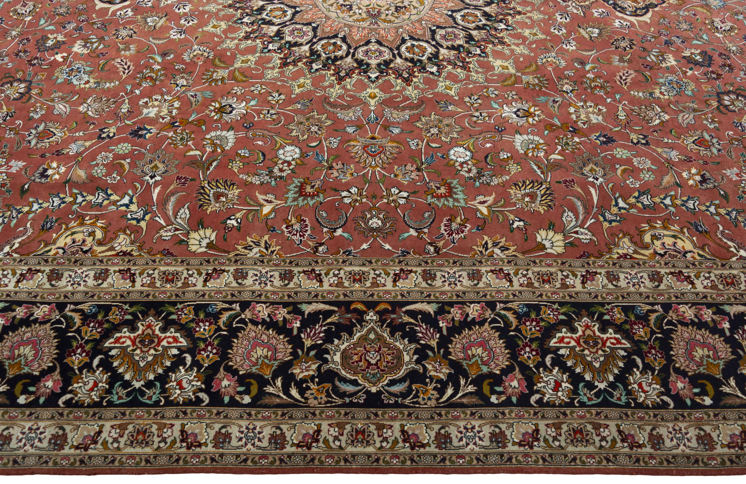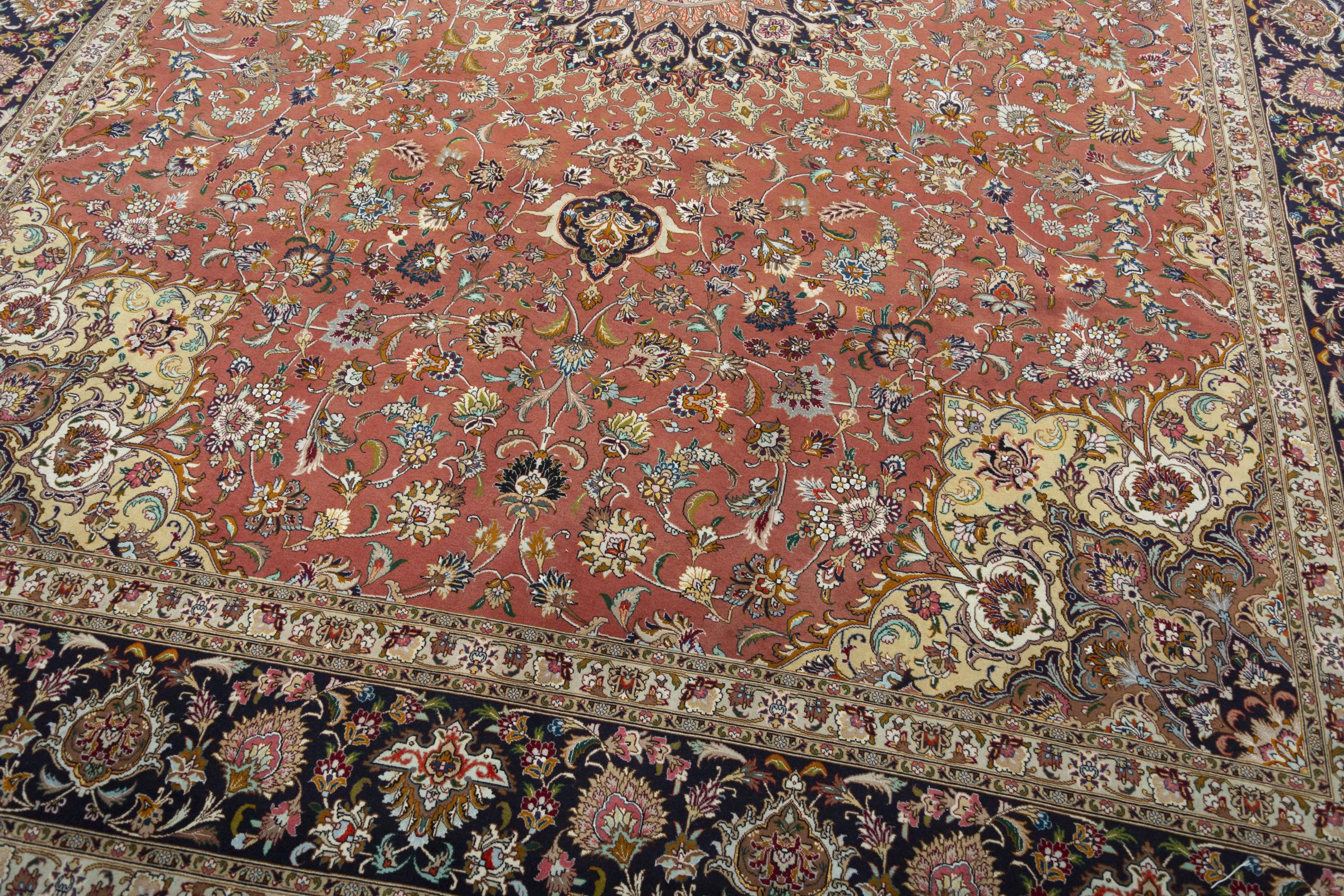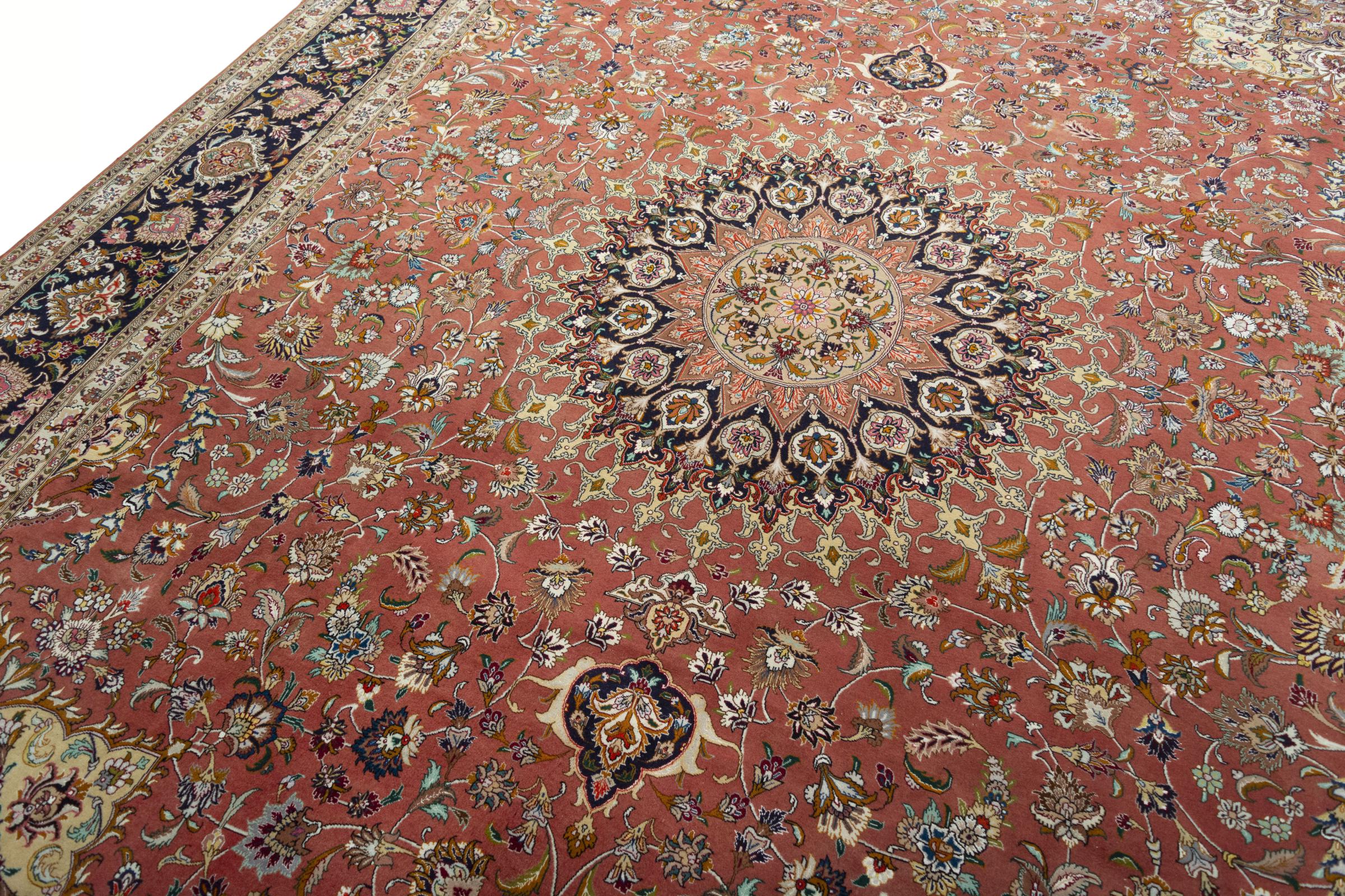 Carpet ID: 285311007168420 Size: 401x301 cm Thickness: ap. 7 mm Knot density: 450 000 - 500 000 / m² Manufacturing: Knotted by hand Pile: Cork wool with silk Warp: Cotton Origin: Persia Age: New Weight: ap. 36 kg Also know as Tabriz, Tabris, Täbris, Tebriz, Tebris, 40Raj, 50Raj In stock: Unique - Only 1 in stock
