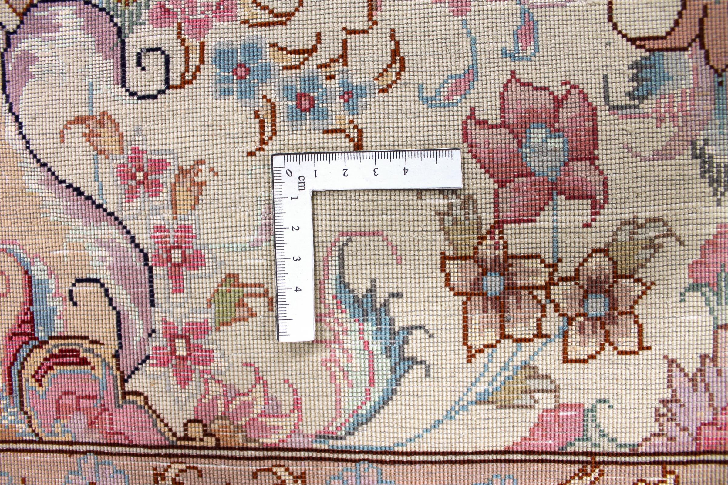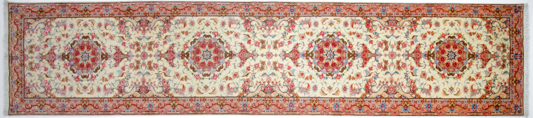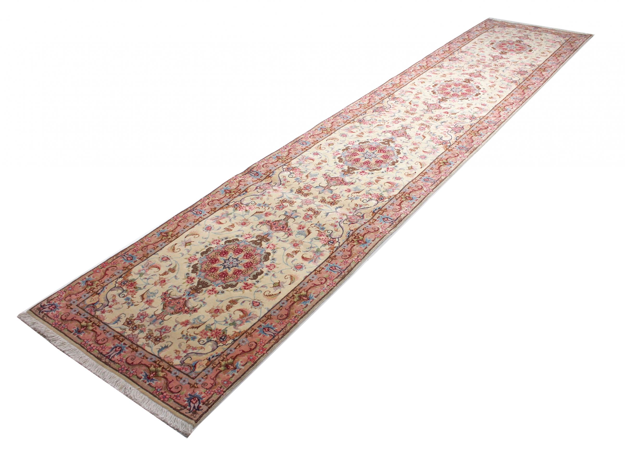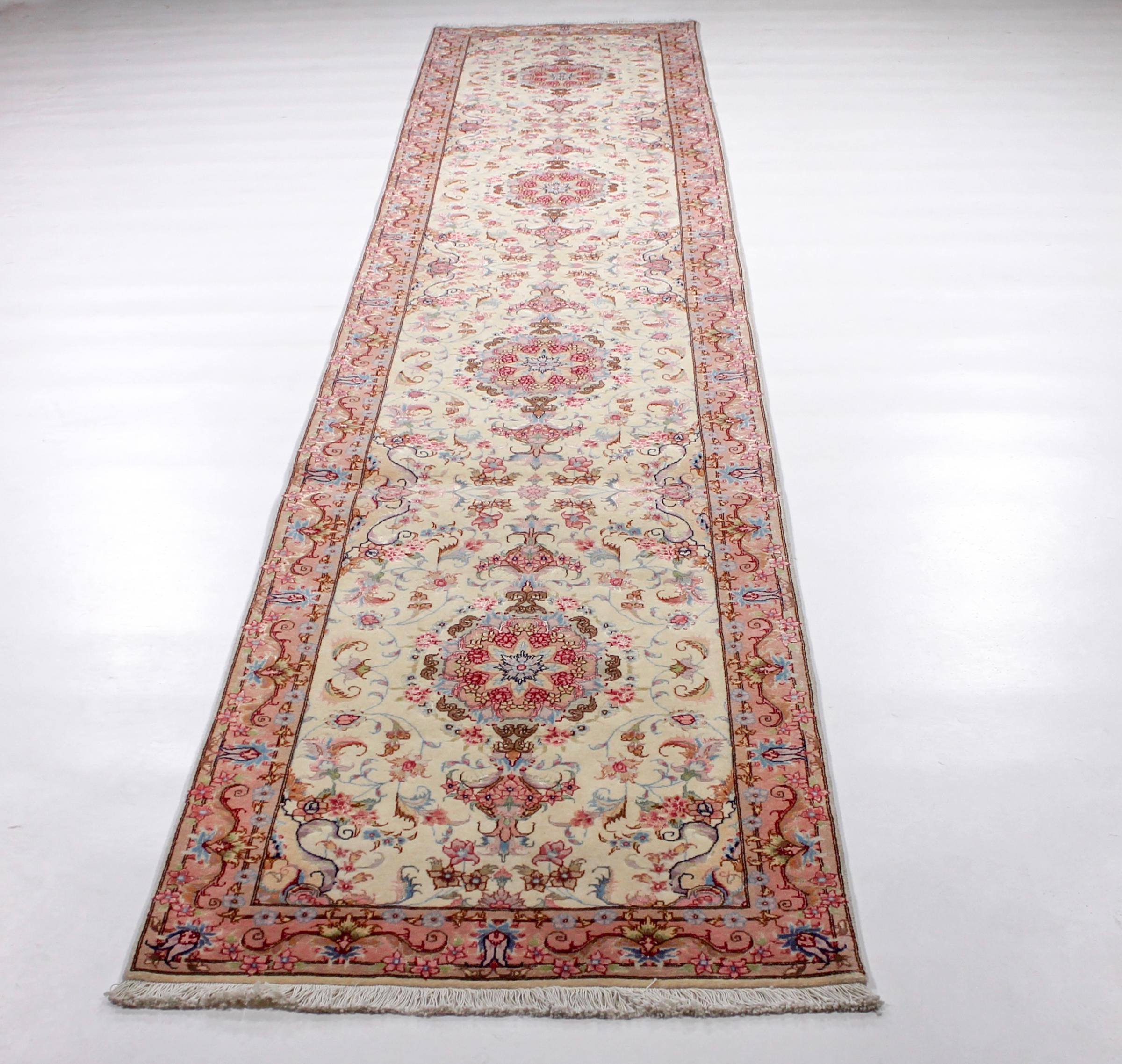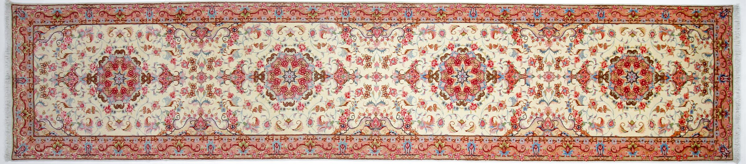 Carpet ID: 121088003628636 Size: 423x85 cm Thickness: ap. 7 mm Knot density: 500 000 - 550 000 / m² Manufacturing: Knotted by hand Pile: Wool with silk Warp: Cotton Origin: Persia Age: New Weight: ap. 11 kg Also know as Tabriz, Tabris, Täbris, Tebriz, Tebris, 40Raj, 50Raj In stock: Unique - Only 1 in stock