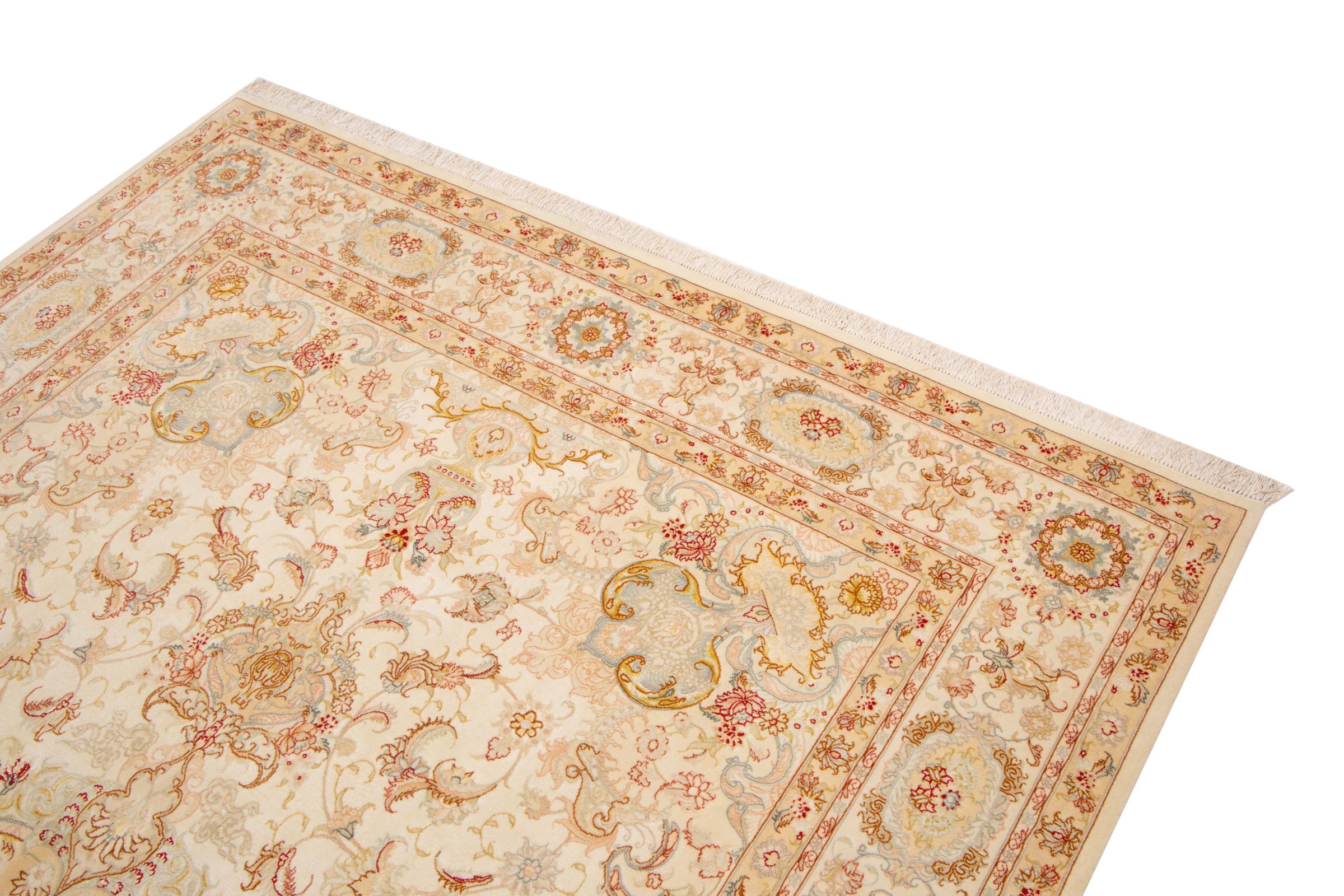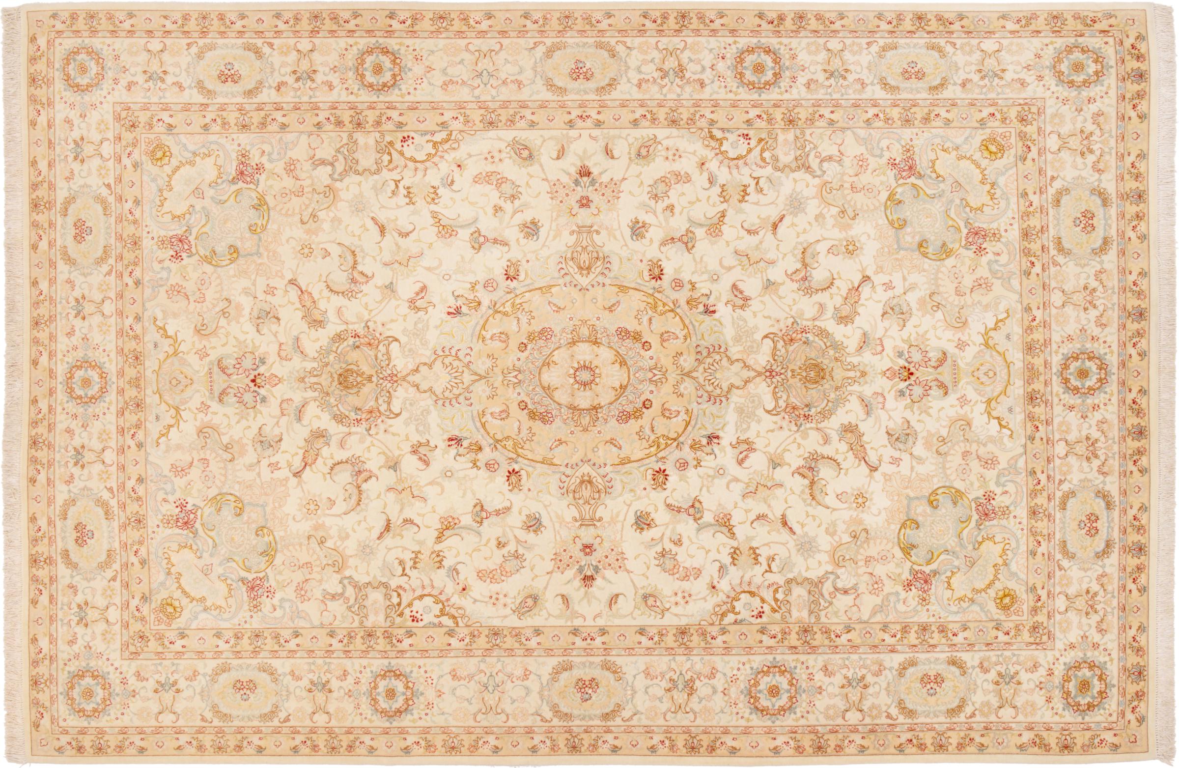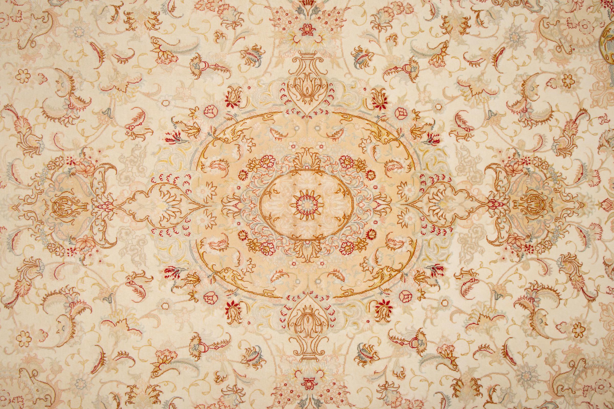 Carpet ID: 292975001468342 Size: 302x199 cm Thickness: ap. 7 mm Knot density: 440 000 - 490 000 / m² Manufacturing: Knotted by hand Pile: Wool with silk Warp: Silk Origin: Persia Age: New Weight: ap. 18 kg Also know as Tabriz, Tabris, Täbris, Tebriz, Tebris, 40Raj, 50Raj In stock: Unique - Only 1 in stock