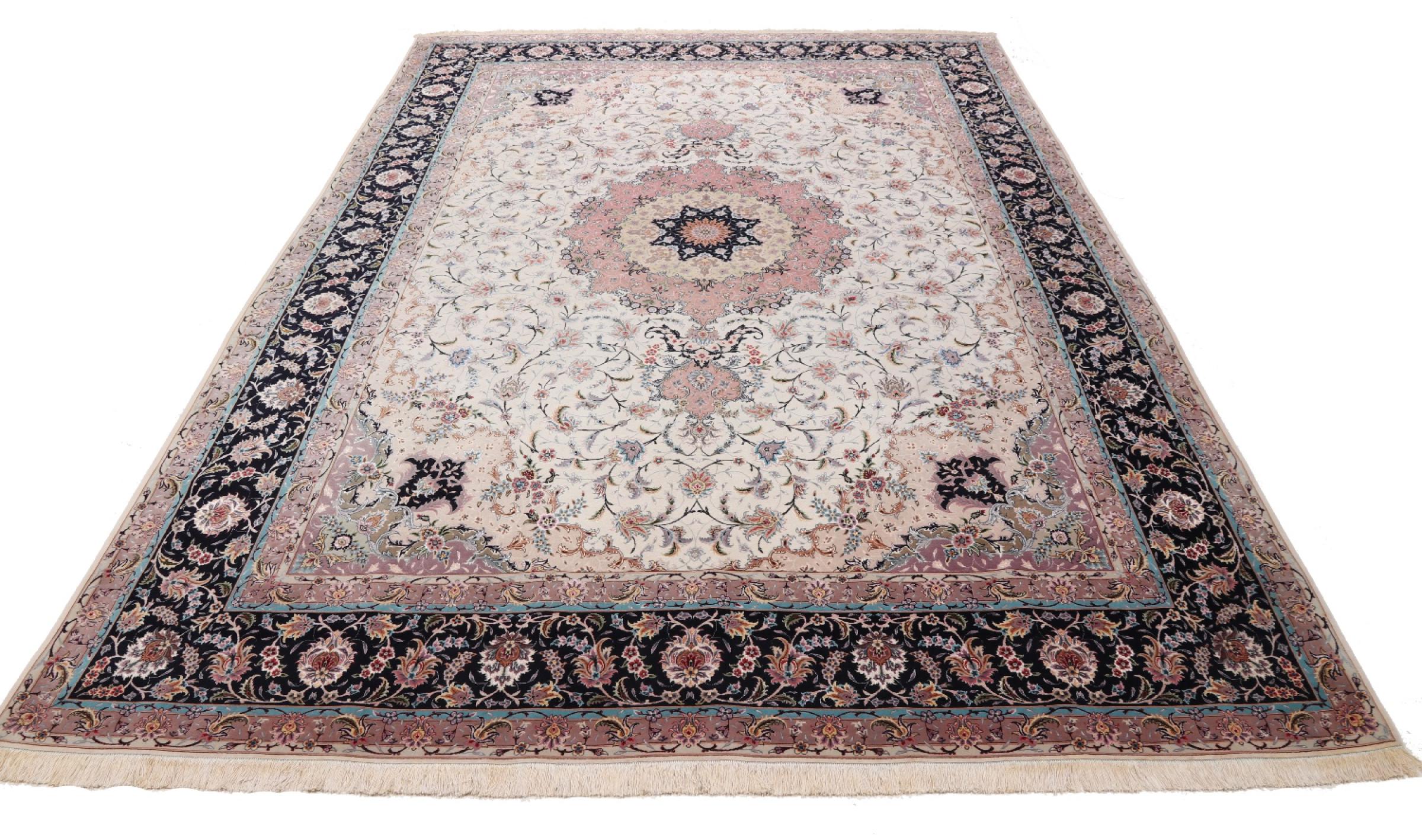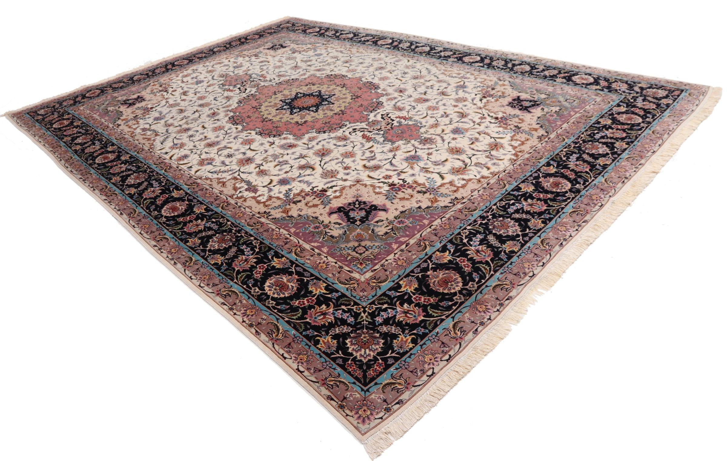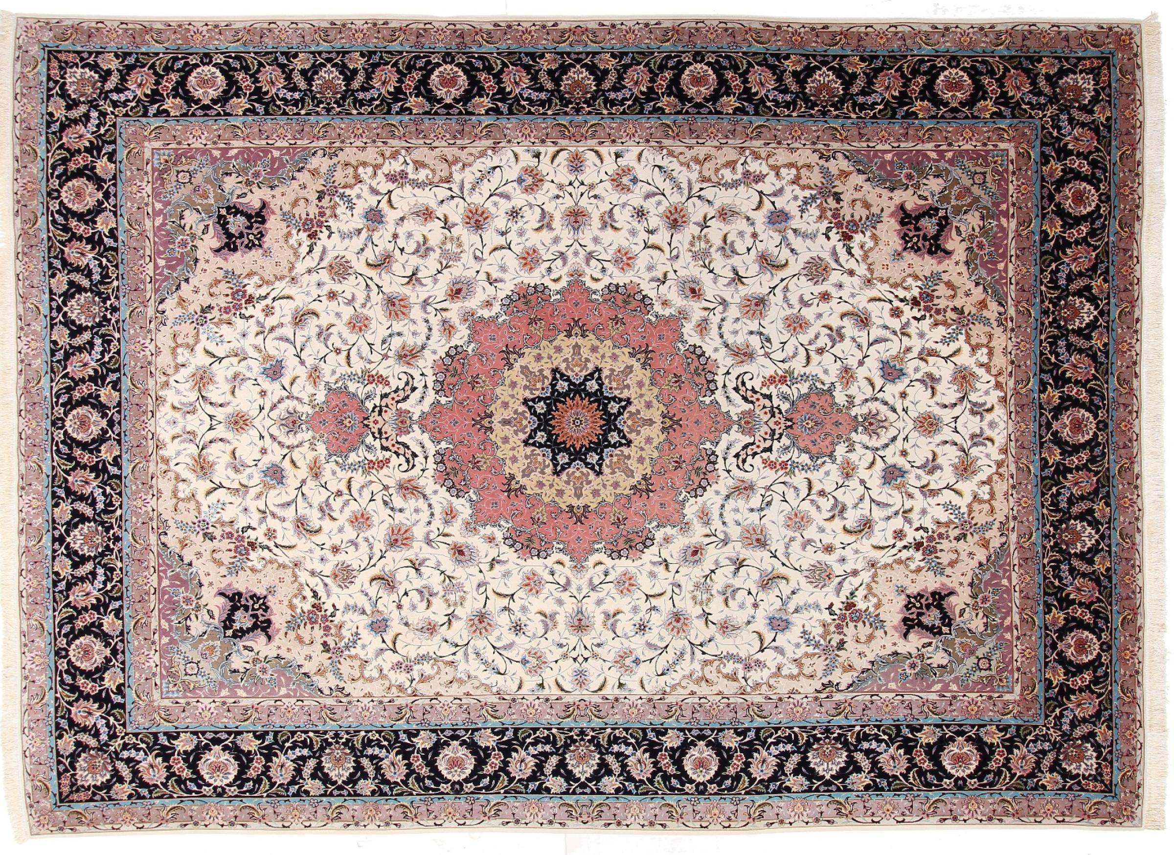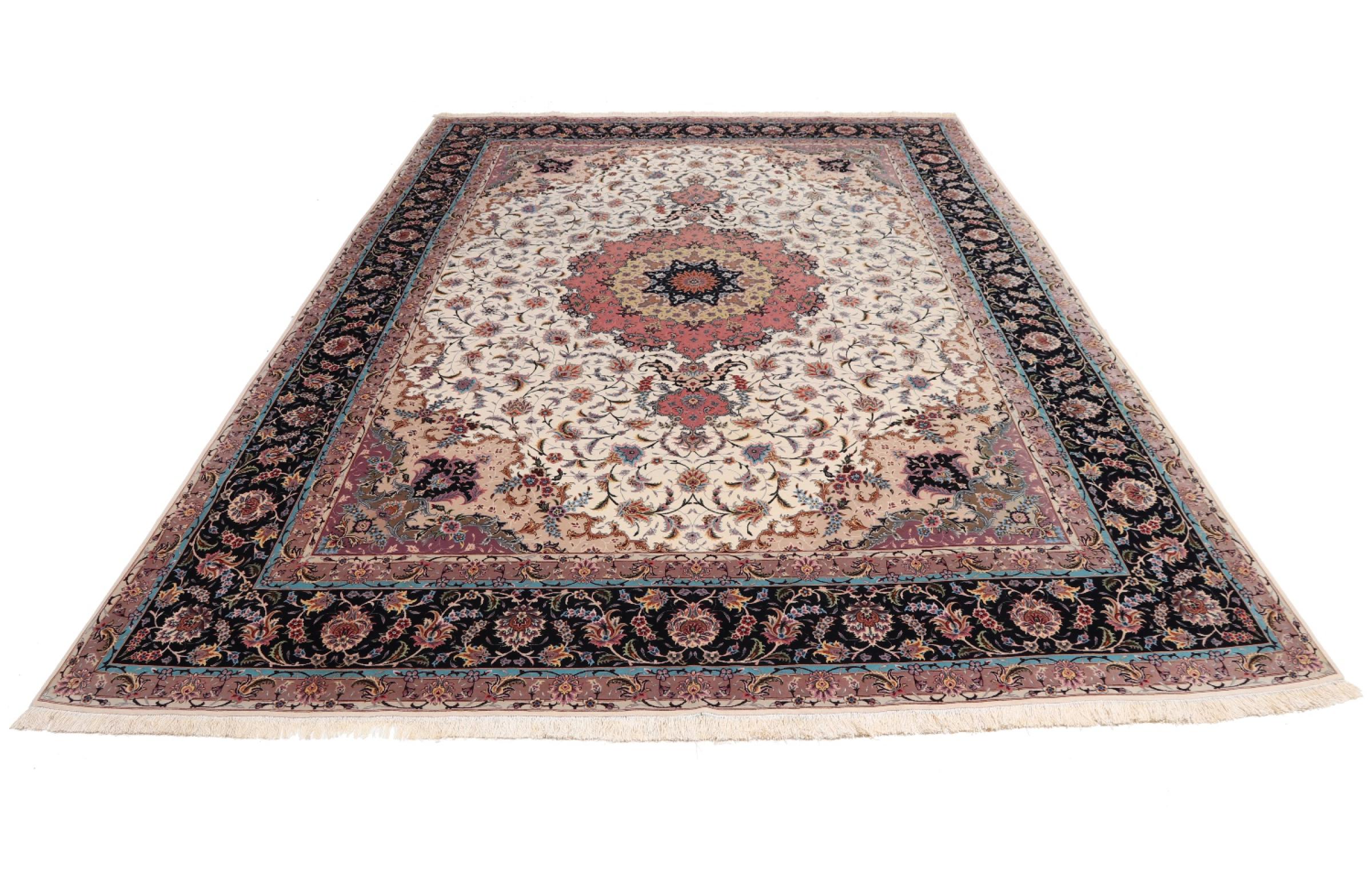Carpet ID: 291970003759485 Size: 407x291 cm Thickness: ap. 7 mm Knot density: 600 000 / m² Manufacturing: Knotted by hand Pile: Wool with silk Warp: Cotton Origin: Persia Age: New Weight: ap. 36 kg Also know as Tabriz, Tabris, Täbris, Tebriz, Tebris, 40Raj, 50Raj In stock: Unique - Only 1 in stock